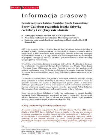 Informacja prasowa Nowa inwestycja w Łódzkiej Specjalnej Strefie Ekonomicznej Barry Callebaut rozbuduje łódzką fabrykę czekolady i zwiększy zatrudnienie • • • Inwestycja o wartości blisko 96 mln PLN w ciągu dwóch lat Planowane zwiększenie zatrudnienia o 80 nowych pracowników Uroczyste wmurowanie kamienia węgielnego pod budowę odbędzie się 12 listopada br. Łódź – 10 listopada 2014 r. – Łódzka fabryka Barry Callebaut, światowego lidera w produkcji wysokiej jakości produktów czekoladowych i kakaowych zostanie wkrótce rozbudowana o dwie nowoczesne linie produkcyjne. Wartość planowanej inwestycji wyniesie blisko 96 mln zł, a w ciągu dwóch lat w zakładzie powstanie 80 dodatkowych miejsc pracy. Istniejąca od blisko 20 lat fabryka jest zlokalizowana na terenie Łódzkiej Specjalnej Strefy Ekonomicznej. Uroczystość wmurowania kamienia węgielnego pod budowę odbędzie się 12 listopada br., w obecności przedstawicieli Zarządu Barry Callebaut oraz Urzędu Miasta Łodzi, z Prezydent Hanną Zdanowską na czele. Pierwsza z nowych linii produkcyjnych zostanie uruchomiona latem 2015 roku, a cała inwestycja zostanie ukończona do końca 2016 roku. Do tego czasu łódzki zakład Barry Callebaut zwiększy zatrudnienie do ok. 200 osób. – Rozbudowa łódzkiej fabryki jest jednym z kluczowych elementów strategii rozwoju Barry Callebaut w Europie Środkowej i Zachodniej. Nasza działalność w Polsce ma ogromne znaczenie dla średnio i długookresowych planów firmy, a zwiększenie możliwości produkcyjnych i rozwój nowoczesnych metod wytwarzania czekolady to klucz do utrzymania naszej wiodącej pozycji na rynku – powiedział Philipp Schoeller, Wiceprezydent Food Manufacturers na Europę Centralną w Barry Callebaut. Nowa inwestycja Barry Callebaut w Łodzi jest realizowana w ramach Łódzkiej Specjalnej Strefy Ekonomicznej, uznawanej za jedną z najbardziej dynamicznych w kraju. Rozbudowa fabryki Barry Callebaut jest jednym z największych projektów inwestycyjnych zatwierdzonych w tym roku w Łódzkiej SSE. O Barry Callebaut Group (www.barry-callebaut.com): Z rocznymi przychodami na poziomie 4,9 mld CHF (4,0 mld Eur / 5,2 mld USD) w roku fiskalnym 2012/2013, Barry Callebaut Group z siedzibą w Zurychu jest wiodącym światowym producentem wysokiej jakości wyrobów czekoladowych i kakaowych – od pozyskiwania i przetwarzania ziaren kakao, po produkcję najwyższej jakości czekolady, w tym nadzień, dekoracji czy polew. Grupa posiada 50 zakładów produkcyjnych na całym świecie i zatrudnia ponad 9000 specjalistów, sprzedając swoje 1/2 Barry Callebaut Manufacturing Polska Nowy Jozefow 36 | 94-406 Lodz Phone +48 42 683 77 00 | Fax +48 42 683 77 01 produkty w ponad 100 krajach. Barry Callebaut Group obsługuje cały przemysł spożywczy, od przemysłowych producentów żywności, przez sektor HoReCa, po profesjonalnych użytkowników czekolady. Jest także liderem w dziedzinie innowacji na bazie kakao i czekolady, oferującym swoim klientom pełen zakres usług w obszarze rozwoju produktów, procesów produkcyjnych, szkoleń i marketingu. *** Contact for the media: Daniel Woubishet Senior Consultant Headlines Porter Novelli Tel: +48 506 361 710 [email protected] 2/2