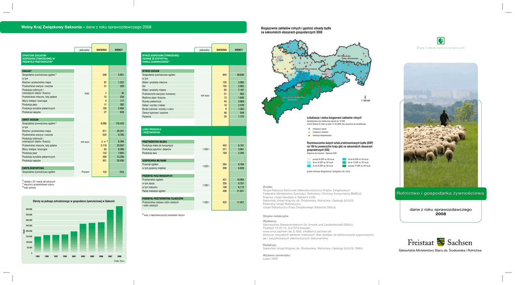 Wolny Kraj związkowy Saksonia – dane z roku sprawozdawczego 2008 Jednostka Jednostka NIEMCY SAKSONIA StRuKtuRA zAKłAdóW gOSpOdARKI ŻYWNOŚCIOWEJ W pRzEMYŚlE pRzEtWóRCzYM 6) biogazownie zakładów rolnych i gęstość obsady bydła na saksońskich obszarach gospodarczych 2008 SAKSONIA NIEMCY WYWóz gOSpOdARKI ŻYWNOŚIOWEJ zgOdNIE zE StAtYStYKą hANdlu zAgRANICzNEgO 9) zAKłAdY Og II Saksońskie tereny lessowe WYWóz OgółEM Gospodarka żywnościowa ogółem w tym Rzeźnie i przetwórstwo mięsa Przetwórstwo warzyw i owoców Produkcja roślinnych i zwierzęcych olejów i tłuszczy Przetwórstwo mleczne, lody jadalne Młyny mielące i łuszczące Produkcja pasz Produkcja wyrobów piekarniczych Produkcja napojów 7) ilość 348 5.851 87 21 1.322 249 2 30 15 4 11 150 27 234 117 202 2.404 628 ObRót OgółEM Gospodarka żywnościowa ogółem w tym Rzeźnie i przetwórstwo mięsa Przetwórstwo warzyw i owoców Produkcja roślinnych i zwierzęcych olejów i tłuszczy Przetwórstwo mleczne, lody jadalne Młyny mielące i łuszczące Produkcja pasz Produkcja wyrobów piekarniczych Produkcja napojów 7) mln euro 8.086 170.429 811 524 35.241 9.705 b. w. 8) 3.118 63 133 494 931 6.384 25.047 6.280 7.655 13.250 20.436 Gospodarka żywnościowa ogółem w tym Mleko i produkty mleczne Ser Mięso i produkty mięsne Przetworzone warzywa i konserwy Roślinne oleje i tłuszcze Wyroby piekarnicze Kakao i wyroby z kakao Buraki cukrowe i wyroby z cukru Owoce łupinowe i suszone Pszenica Gospodarka żywnościowa ogółem Procent 6,6 mln euro 844 49.646 155 193 65 31 13 45 19 9 48 35 3.883 2.982 7.197 562 1.645 3.869 2.470 1.262 549 1.722 drezno Chemnitz Og III przed- i Średniogórze Saksońskie 1:1.000.000 lokalizacja i status biogazowni zakładów rolnych* Zainstalowana moc elektryczna: łącznie ok. 54 MW (LfULG Referat 25; Stan na dzień: 01.02.2009) *bez roszczenia do kompletności Instalacja w planie Instalacja w budowie IlOŚCI pROduKCJI I pRzEtWóRStWA Instalacja eksploatowana pRzEtWóRStWO MlEKA Produkcja mleka do konsumpcji Produkcja jogurtów i deserów Produkcja sera 1.000 t 442 371 169 6.101 2.961 2.205 264 200 8.164 6.828 Rozmieszczenie dużych sztuk przeliczeniowych bydła (dSp) na 100 ha powierzchni kraju (pk) na saksońskich obszarach gospodarczych (Og) Wsparcie dla rolnictwa – Saksonia 2008 poniżej 35 DSP na 100 ha pk 36 do 45 DSP na 100 ha pk 46 do 55 DSP na 100 ha pk gOSpOdARKA MłYNAMI Przemiał ogółem w tym pszenicy miękkiej KWOtA EKSpORtOWA Og I Saksońskie Stawy i Wrzosowiska lipsk 1.000 t 16,6 56 do 65 DSP na 100 ha pk 66 do 70 DSP na 100 ha pk powyżej 70 DSP na 100 ha pk System Informacji Geograficznej i Kartografia: LVA, LfULG pRzEMYSł pASz MIESzANYCh Przetwórstwo ogółem w tym zboża w tym makuchu Pasze mieszane ogółem 6) zakłady z 20 i więcej zatrudnionymi włącznie z przetwórstwem tytoniu 8) brak wartości 7) 431 255 100 496 18.904 9.757 6.112 21.831 432 11.457 pRzEMYSł pRzEtWóRStWA tłuSzCzóW Obroty na jednego zatrudnionego w gospodarce żywnościowej w Saksonii Przetwórstwo zasiewu roślin oleistych i roślin oleistych 400.000 9) 350.000 300.000 wraz z nieprzetworzonymi produktami rolnymi 1.000 t Źródła: Grupa Robocza Rachunek Makroekonomiczny Krajów Związkowych Federalne Ministerstwo Żywności, Rolnictwa i Ochrony Konsumenta (BMELV) Krajowy Urząd Geodezji w Saksonii (LVA) Saksoński Urząd Krajowy ds. Środowiska, Rolnictwa i Geologii (LfULG) Federalny Urząd Statystyczny Urząd Statystyczny Kraju Związkowego Saksonia (StaLa) Stopka redakcyjna Rolnictwo i gospodarka żywnościowa dane z roku sprawozdawczego 2008 Wydawcy: Sächsisches Staatsministerium für Umwelt und Landwirtschaft (SMUL) Postfach 10 05 10, D-01076 Dresden www.smul.sachsen.de, E-Mail: [email protected] (Dotyczy wszystkich adresów mailowych: Bez dostępu do elektronicznie sygnowanych, jak i zaszyfrowanych elektronicznych dokumentów) 250.000 Euro 1.000 t 200.000 150.000 100.000 Redakcja: Saksoński Urząd Krajowy ds. Środowiska, Rolnictwa i Geologii (LfULG), SMUL 50.000 0 1993 1995 1997 1999 2001 2003 2005 2006 2007 2008 Źródło: StaLa Wydanie zamknięto: Lipiec 2009 Saksońskie Ministerstwo Stanu ds. Środowiska i Rolnictwa Wolny Kraj związkowy Saksonia – dane z roku sprawozdawczego 2008 Jednostka NIEMCY pOWIERzChNIA 1) Powierzchnia ogółem Grunty rolne udział w powierzchni kraju Lasy udział w powierzchni kraju Zbiorniki wodne udział w powierzchni kraju 1.000 ha 1.000 ha % 1.000 ha % 1.000 ha % 1.842 1.020 35.705 18.932 55 53 499 10.649 27 30 36 828 2 2 w tysiącach 4.193 228 1.961 42 82.218 231 40.330 856 ludNOŚĆ Powierzchnia rolna Trwały użytek zielony 914 188 1.000 ha 1.000 ha % 1.000 ha % 1.000 ha 1.000 ha 1.000 ha udział w pk Ziemia uprawna udział w pk Ugory Nieużytki (2005) Grunty dzierżawne (2007) ilość w tysiącach w tysiącach StRuKtuRA zAKłAdOW ROlNYCh 2) FORMA pRAWNA Zakłady rolne ogółem w tym posiadające osobowość prawną w tym spółdzielnie Sp. z o.o. w tym osoby fizyczne w tym Spółki osobowe Przedsiębiorstwo jednoosobowe w tym: główna praca zarobkowa uboczna praca zarobkowa ilość 6.962 632 204 276 6.330 378 5.952 1.879 4.073 374.500 4.700 1.100 2.800 369.242 19.100 350.100 157.500 192.600 WIElKOŚĆ zAKłAdóW Zakłady dysponujące powierzchnią poniżej 2 ha pk Zakłady dysponujące powierzchnią od 2 do mniej niż 10 ha Zakłady dysponujące powierzchnią od 10 do mniej niż 20 ha Zakłady dysponujące powierzchnią od 20 do mniej niż 50 ha Zakłady dysponujące powierzchnią od 50 do mniej niż 100 ha Zakłady dysponujące powierzchnią od 100 do mniej niż 500 ha Zakłady dysponujące powierzchnią od 500 do mniej niż 1.000 ha Zakłady dysponujące powierzchnią powyżej 1.000 ha Zboża ogółem w tym pszenica jęczmień owies żyto kukurydza na ziarno, CCM Rośliny okopowe w tym ziemniaki buraki cukrowe Rzepak i rzepik (łącznie z Non Food) w tym rzepak i rzepik słonecznik na ziarno Rośliny strączkowe Rośliny paste