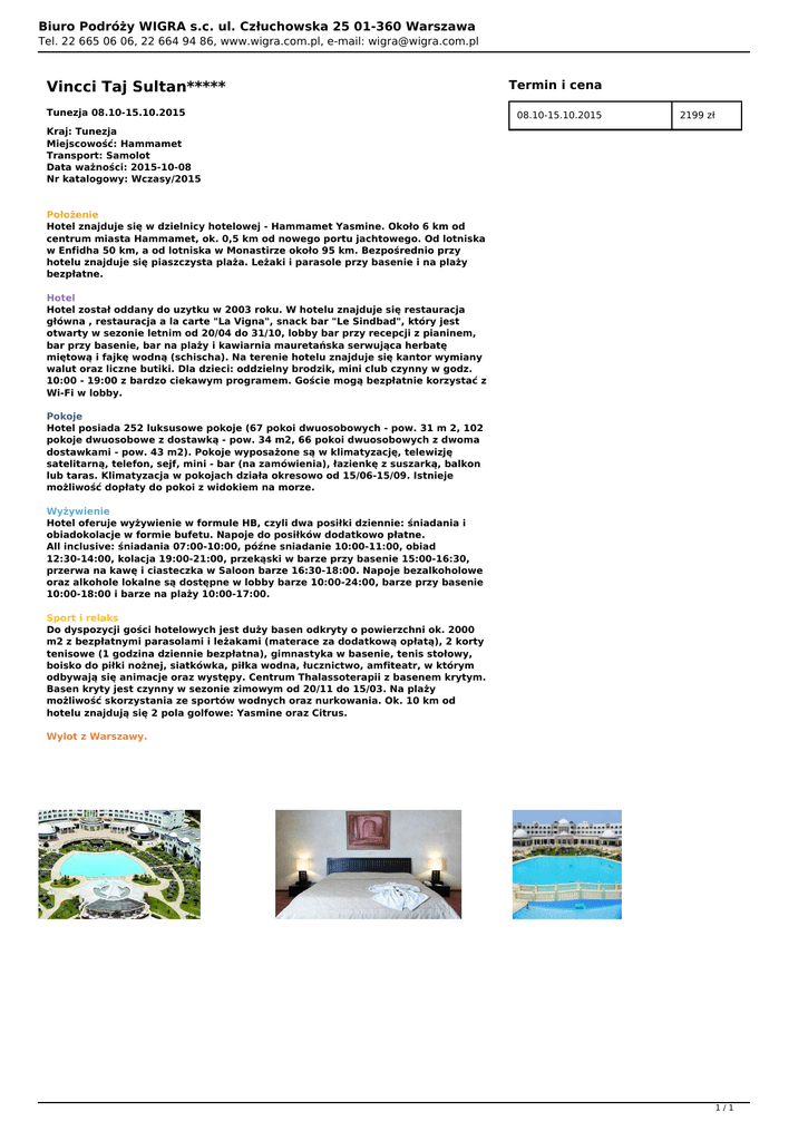 Biuro Podróży WIGRA s.c. ul. Człuchowska 25 01-360 Warszawa Tel. 22 665 06 06, 22 664 94 86, www.wigra.com.pl, e-mail: [email protected] Vincci Taj Sultan***** Tunezja 08.10-15.10.2015 Termin i cena 08.10-15.10.2015 2199 zł Kraj: Tunezja Miejscowość: Hammamet Transport: Samolot Data ważności: 2015-10-08 Nr katalogowy: Wczasy/2015 Położenie Hotel znajduje się w dzielnicy hotelowej - Hammamet Yasmine. Około 6 km od centrum miasta Hammamet, ok. 0,5 km od nowego portu jachtowego. Od lotniska w Enfidha 50 km, a od lotniska w Monastirze około 95 km. Bezpośrednio przy hotelu znajduje się piaszczysta plaża. Leżaki i parasole przy basenie i na plaży bezpłatne. Hotel Hotel został oddany do uzytku w 2003 roku. W hotelu znajduje się restauracja główna , restauracja a la carte "La Vigna", snack bar "Le Sindbad", który jest otwarty w sezonie letnim od 20/04 do 31/10, lobby bar przy recepcji z pianinem, bar przy basenie, bar na plaży i kawiarnia mauretańska serwująca herbatę miętową i fajkę wodną (schischa). Na terenie hotelu znajduje się kantor wymiany walut oraz liczne butiki. Dla dzieci: oddzielny brodzik, mini club czynny w godz. 10:00 - 19:00 z bardzo ciekawym programem. Goście mogą bezpłatnie korzystać z Wi-Fi w lobby. Pokoje Hotel posiada 252 luksusowe pokoje (67 pokoi dwuosobowych - pow. 31 m 2, 102 pokoje dwuosobowe z dostawką - pow. 34 m2, 66 pokoi dwuosobowych z dwoma dostawkami - pow. 43 m2). Pokoje wyposażone są w klimatyzację, telewizję satelitarną, telefon, sejf, mini - bar (na zamówienia), łazienkę z suszarką, balkon lub taras. Klimatyzacja w pokojach działa okresowo od 15/06-15/09. Istnieje możliwość dopłaty do pokoi z widokiem na morze. Wyżywienie Hotel oferuje wyżywienie w formule HB, czyli dwa posiłki dziennie: śniadania i obiadokolacje w formie bufetu. Napoje do posiłków dodatkowo płatne. All inclusive: śniadania 07:00-10:00, późne sniadanie 10:00-11:00, obiad 12:30-14:00, kolacja 19:00-21:00, przekąski w barze przy basenie 15:00-16:30, przerwa na kawę i ciasteczka w Saloon barze 16:30-18:00. Napoje bezalkoholowe oraz alkohole lokalne są dostępne w lobby barze 10:00-24:00, barze przy basenie 10:00-18:00 i barze na plaży 10:00-17:00. Sport i relaks Do dyspozycji gości hotelowych jest duży basen odkryty o powierzchni ok. 2000 m2 z bezpłatnymi parasolami i leżakami (materace za dodatkową opłatą), 2 korty tenisowe (1 godzina dziennie bezpłatna), gimnastyka w basenie, tenis stołowy, boisko do piłki nożnej, siatkówka, piłka wodna, łucznictwo, amfiteatr, w którym odbywają się animacje oraz występy. Centrum Thalassoterapii z basenem krytym. Basen kryty jest czynny w sezonie zimowym od 20/11 do 15/03. Na plaży możliwość skorzystania ze sportów wodnych oraz nurkowania. Ok. 10 km od hotelu znajdują się 2 pola golfowe: Yasmine oraz Citrus. Wylot z Warszawy. 1/1 Powered by TCPDF (www.tcpdf.org)