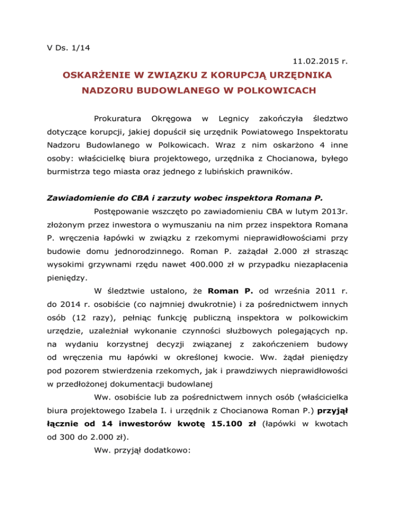 V Ds. 1/14 11.02.2015 r. OSKARŻENIE W ZWIĄZKU Z KORUPCJĄ URZĘDNIKA NADZORU BUDOWLANEGO W POLKOWICACH Prokuratura Okręgowa w Legnicy zakończyła śledztwo dotyczące korupcji, jakiej dopuścił się urzędnik Powiatowego Inspektoratu Nadzoru Budowlanego w Polkowicach. Wraz z nim oskarżono 4 inne osoby: właścicielkę biura projektowego, urzędnika z Chocianowa, byłego burmistrza tego miasta oraz jednego z lubińskich prawników. Zawiadomienie do CBA i zarzuty wobec inspektora Romana P. Postępowanie wszczęto po zawiadomieniu CBA w lutym 2013r. złożonym przez inwestora o wymuszaniu na nim przez inspektora Romana P. wręczenia łapówki w związku z rzekomymi nieprawidłowościami przy budowie domu jednorodzinnego. Roman P. zażądał 2.000 zł strasząc wysokimi grzywnami rzędu nawet 400.000 zł w przypadku niezapłacenia pieniędzy. W śledztwie ustalono, że Roman P. od września 2011 r. do 2014 r. osobiście (co najmniej dwukrotnie) i za pośrednictwem innych osób (12 razy), pełniąc funkcję publiczną inspektora w polkowickim urzędzie, uzależniał wykonanie czynności służbowych polegających np. na wydaniu korzystnej decyzji związanej z zakończeniem budowy od wręczenia mu łapówki w określonej kwocie. Ww. żądał pieniędzy pod pozorem stwierdzenia rzekomych, jak i prawdziwych nieprawidłowości w przedłożonej dokumentacji budowlanej Ww. osobiście lub za pośrednictwem innych osób (właścicielka biura projektowego Izabela I. i urzędnik z Chocianowa Roman P.) przyjął łącznie od 14 inwestorów kwotę 15.100 zł (łapówki w kwotach od 300 do 2.000 zł). Ww. przyjął dodatkowo: 2 korzyść majątkową w kwocie nie mniejszej niż 2.000 zł w zamian za udzielenie pomocy w pozytywnym załatwieniu formalności związanych z realizacją inwestycji budowlanej polegającej na adaptacji lokalu usługowego w Chocianowie na cele mieszkalne, korzyści majątkowe za pośrednictwem 3 innych osób – kierowników budów i inspektorów nadzoru inwestorskiego - pieniądze w nieustalonej dokładnie kwocie od 300 do 1.500 zł od nieustalonych inwestorów będących klientami wymienionych. Roman P. trzykrotnie dopuścił się też przestępstw urzędniczych przekroczenia uprawnień i niedopełnienia obowiązków służbowych oraz podrabiania dokumentów. W pierwszym przypadku uczynił to na prośbę byłego burmistrza Chocianowa Romana K. w związku z zaniechaniem wdrożenia postępowania polegającej administracyjnego na rozbudowie w sprawie kwiaciarni w samowoli budowlanej mieście (prawidłowe tym postępowanie winno doprowadzić do rozbiórki dobudówki, tymczasem wskutek zaniechania czynności dokonano tylko częściowej rozbiórki dobudowanego obiektu i tylko na czas kontroli). W drugim przypadku za namową tegoż Romana K. oraz lubińskiego prawnika Pawła M. - w związku z zalegalizowaniem samowoli budowlanej, jakiej dopuścił się ten drugi rozbudowując bez stosownego zezwolenia postępowanie wcześniej powinno wybudowany polegać na obiekt wszczęciu (prawidłowe postępowania administracyjnego i doprowadzeniu do rozbiórki wybudowanych bez pozwolenia obiektów bądź urzędowej legalizacji, co wiązało się z bardzo dużymi opłatami w granicach 300-400 tys. zł.). Po raz trzeci – w związku z niezgłoszeniem sprzeciwu w sprawie przystąpienia do użytkowania obiektu wybudowanego z dopuszczeniem się znacznego odstępstwa od projektu. Ponadto ww. 10 razy przekroczył przysługujące mu uprawnienia w ten sposób, że pomimo ciążącego na nim zakazu podejmowania pracy zarobkowej na terenie właściwości PINB 3 w Polkowicach, podejmował czynności nieformalnego kierownika budowy przy inwestycjach związanych z prowadzeniem i zakończeniem budowy, a następnie podrabiał podpisy kierownika budowy, inspektora nadzoru inwestorskiego oraz podpisy inwestorów na zawiadomieniach o zakończeniu budowy administracyjną o i na niezgłoszeniu tej podstawie przez PINB wydawał sprzeciwu decyzję w sprawie przystąpienia do użytkowania zakończonego obiektu budowlanego. Właścicielka biura projektowego Izabela M. Izabela M. prowadząca działalność gospodarczą w zakresie projektowania w budownictwie w ramach prowadzonej działalności najczęściej pełniła funkcję kierownika budowy inwestorów indywidualnych. Ww. po złożeniu dokumentów w PINB w Polkowicach często otrzymywała od Romana P. informacje o występujących jego zdaniem nieprawidłowościach i w zamian za wydanie (pomimo tego) korzystnej decyzji dla inwestora przekazywał jej żądanie uzyskania określonej kwoty od inwestora. Oskarżona po kontakcie z inwestorem przekazywała Romanowi P. ustaloną z nim kwotę, po czym wydawał on decyzję o niezgłoszeniu sprzeciwu w sprawie przystąpienia do użytkowania budynku mieszkalnego. Bardzo często Izabela M. wskazując inwestorom na potrzebę przekazania jej dodatkowych pieniędzy w związku z zakończeniem budowy nie informowała ich wprost o tym, że zamierza je wręczyć jako łapówkę Romanowi P. W powyższy sposób w okresie od lutego 2013 r. do lutego 2014 r. oskarżona przekazała Romanowi P. nie mniej niż 8.000 zł od 7 inwestorów. Urzędnik z Chocianowa Romuald P. We wręczaniu łapówek pośredniczył także inspektor z Referatu Gospodarki Komunalnej i Inwestycji Urzędu Miasta i Gminy w Chocianowie Romuald P. Wymieniony, oprócz pracy w urzędzie, podejmował się pracy 4 przy inwestycjach budowlanych osób fizycznych jako kierownik budowy lub projektant. Romuald P. w 2013 r. kilkukrotnie zwracał się do Romana P. z propozycją pomocy przy zakończeniu budowy swoich klientów lub znajomych, za co przekazywał mu łapówki pochodzące od inwestorów. W ten sposób w okresie od maja do sierpnia 2013 r. Romuald P. przekazał Romanowi P. łącznie nie mniej niż 2.800 zł od 4 inwestorów. Były burmistrz Chocianowa Roman K. W śledztwie ustalono, że były burmistrz Chocianowa Roman K. dwukrotnie nakłonił Romana P. jako inspektora n