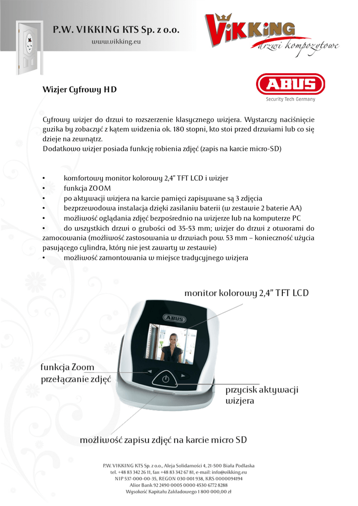 Wizjer Cyfrowy HD Cyfrowy wizjer do drzwi to rozszerzenie klasycznego wizjera. Wystarczy naciśnięcie guzika by zobaczyć z kątem widzenia ok. 180 stopni, kto stoi przed drzwiami lub co się dzieje na zewnątrz. Dodatkowo wizjer posiada funkcję robienia zdjęć (zapis na karcie micro-SD) • komfortowy monitor kolorowy 2,4" TFT LCD i wizjer • funkcja ZOOM • po aktywacji wizjera na karcie pamięci zapisywane są 3 zdjęcia • bezprzewodowa instalacja dzięki zasilaniu baterii (w zestawie 2 baterie AA) • możliwość oglądania zdjęć bezpośrednio na wizjerze lub na komputerze PC • do wszystkich drzwi o grubości od 35-53 mm; wizjer do drzwi z otworami do zamocowania (możliwość zastosowania w drzwiach pow. 53 mm – konieczność użycia pasującego cylindra, który nie jest zawarty w zestawie) • możliwość zamontowania w miejsce tradycyjnego wizjera Wizjer standardowo montowany jest w drzwiach na wysokości 1550 mm. Na życzenie klienta istnieje możliwość zamontowania wizjera na innej wysokości. Dane techniczne: Typ baterii 2 x bateria AA Tryby rozdzielczości 1280x720 pikseli Wymiary 105x105x25 mm Czujnik obrazowy 1/4" Progressive Scan CMOS-Sensor Czas pracy baterii ok. 1300 aktywacji Ciężar netto 0,12 kg Monitor 2,4" TFT LCD Nośnik pamięci Karta mocro-SD (max.32 GB) brak w zestawie Kąt widzenia w poziomie 60°