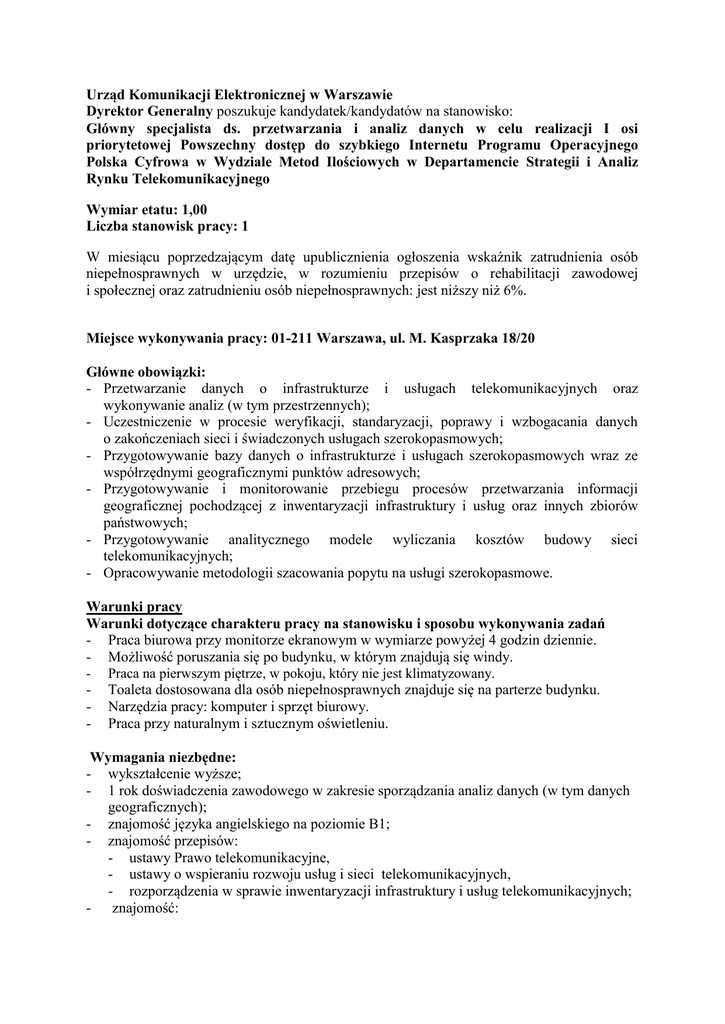 Urząd Komunikacji Elektronicznej w Warszawie Dyrektor Generalny poszukuje kandydatek/kandydatów na stanowisko: Główny specjalista ds. przetwarzania i analiz danych w celu realizacji I osi priorytetowej Powszechny dostęp do szybkiego Internetu Programu Operacyjnego Polska Cyfrowa w Wydziale Metod Ilościowych w Departamencie Strategii i Analiz Rynku Telekomunikacyjnego Wymiar etatu: 1,00 Liczba stanowisk pracy: 1 W miesiącu poprzedzającym datę upublicznienia ogłoszenia wskaźnik zatrudnienia osób niepełnosprawnych w urzędzie, w rozumieniu przepisów o rehabilitacji zawodowej i społecznej oraz zatrudnieniu osób niepełnosprawnych: jest niższy niż 6%. Miejsce wykonywania pracy: 01-211 Warszawa, ul. M. Kasprzaka 18/20 Główne obowiązki: - Przetwarzanie danych o infrastrukturze i usługach telekomunikacyjnych oraz wykonywanie analiz (w tym przestrzennych); - Uczestniczenie w procesie weryfikacji, standaryzacji, poprawy i wzbogacania danych o zakończeniach sieci i świadczonych usługach szerokopasmowych; - Przygotowywanie bazy danych o infrastrukturze i usługach szerokopasmowych wraz ze współrzędnymi geograficznymi punktów adresowych; - Przygotowywanie i monitorowanie przebiegu procesów przetwarzania informacji geograficznej pochodzącej z inwentaryzacji infrastruktury i usług oraz innych zbiorów państwowych; - Przygotowywanie analitycznego modele wyliczania kosztów budowy sieci telekomunikacyjnych; - Opracowywanie metodologii szacowania popytu na usługi szerokopasmowe. Warunki pracy Warunki dotyczące charakteru pracy na stanowisku i sposobu wykonywania zadań - Praca biurowa przy monitorze ekranowym w wymiarze powyżej 4 godzin dziennie. - Możliwość poruszania się po budynku, w którym znajdują się windy. - Praca na pierwszym piętrze, w pokoju, który nie jest klimatyzowany. - Toaleta dostosowana dla osób niepełnosprawnych znajduje się na parterze budynku. - Narzędzia pracy: komputer i sprzęt biurowy. - Praca przy naturalnym i sztucznym oświetleniu. Wymagania niezbędne: - wykształcenie wyższe; - 1 rok doświadczenia zawodowego w zakresie sporządzania analiz danych (w tym danych geograficznych); - znajomość języka angielskiego na poziomie B1; - znajomość przepisów: - ustawy Prawo telekomunikacyjne, - ustawy o wspieraniu rozwoju usług i sieci telekomunikacyjnych, - rozporządzenia w sprawie inwentaryzacji infrastruktury i usług telekomunikacyjnych; - znajomość: zagadnień z zakresu telekomunikacji umożliwiających ocenę wartości merytorycznej rozpatrywanych danych i informacji, - rynku telekomunikacyjnego; umiejętność: - obsługi komputera (MS Office, szczególnie programu MS Excel, pozwalająca na tworzenie tabel, zestawień oraz wykresów); - sporządzania analiz; - obsługi aplikacji służących do analizy danych geograficznych np. ArcGIS, FME, Qgis; - precyzyjnego formułowania wniosków wynikających z generowanych raportów; posiadanie kompetencji: - wykorzystanie wiedzy i doskonalenie zawodowe; - rzetelność; - organizacja pracy i orientacja na osiąganie celów; - współpraca; - komunikacja; - myślenie analityczne. - - - Wymagane dokumenty i oświadczenia: - życiorys i list motywacyjny; - oświadczenie kandydatki/kandydata o wyrażeniu zgody na przetwarzanie danych osobowych do celów rekrutacji; - kopie dokumentów potwierdzających wykształcenie; - kopia dokumentu potwierdzającego posiadanie obywatelstwa polskiego lub oświadczenie o posiadaniu obywatelstwa polskiego; - oświadczenie kandydatki/kandydata o nieskazaniu prawomocnym wyrokiem za umyślne przestępstwo lub umyślne przestępstwo skarbowe; - oświadczenie kandydatki/kandydata o korzystaniu z pełni praw publicznych; - kopie dokumentów potwierdzających 1 rok doświadczenia zawodowego w zakresie sporządzania analiz danych (w tym danych geograficznych). Kopie innych dokumentów i oświadczeń: - kopia dokumentu potwierdzającego niepełnosprawność w przypadku kandydatek/kandydatów, którzy zamierzają skorzystać z pierwszeństwa w zatrudnieniu, w przypadku, gdy znajdą się w gronie najlepszych kandydatów. Dokumenty należy przesłać do dnia: 21 września 2016 r. (decyduje data stempla pocztowego lub data dostarczenia do Urzędu) na adres: Urząd Komunikacji Elektronicznej Biuro Administracji i Kadr ul. M. Kasprzaka 18/20 01-211 Warszawa z dopiskiem „Główny specjalista – DART/WMI/6” Inne informacje: Zachęcamy osoby niepełnosprawne do udziału w naborze. Nasz urząd jest pracodawcą równych szans i wszystkie aplikacje są rozważane z równą uwagą bez względu na płeć, wiek, niepełnosprawność, rasę, narodowość, przekonania polityczne, przynależność związkową, pochodzenie etniczne, wyznanie, orientacje seksualną czy też jakąkolwiek inną cechę prawnie chronioną. Oferty otrzymane po terminie i niespełniające wymagań formalnych (w tym brak wymaganych dokumentów oraz oryginałów oświadczeń) i koniecznych nie będą rozpatrywane. W razie złożenia dokumentów drogą pocztową, za datę ich złożenia uważa się datę nadania w placówce pocztowej. Po zakończeniu procesu naboru oferty niespełniające wymagań formalnych oraz wszystkie pozostałe oferty z wyjątkiem oferty wybranej/go kandydatki/kandydata zostaną zniszczone. Podczas naboru zastosowane zostaną następujące metody i techniki naboru: - sprawdzenie ofert pod względem spełniania wymogów formalnych; - test wiedzy; - test językowy; - test kompetencyjny; - zadanie praktyczne z zakresu MS Excel oraz GIS; - rozmowa kwalifikacyjna. Informacje o naborze można uzyskać pod nr telefonu: (22) 53 49 426 oraz pod adresem poczty elektronicznej [email protected].