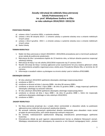 Zasady rekrutacji do oddziału klasy pierwszej Szkoły Podstawowej nr 4 im. prof. Władysława Szafera w Ełku w roku szkolnym 2014/2015 i 2015/16 PODSTAWA PRAWNA: a) ustawa z dnia 7 września 1991r. o systemie oświaty b) ustawa z dnia 30 sierpnia 2013 r. o zmianie ustawy o systemie oświaty oraz o zmianie niektórych innych ustaw c) ustawa z dnia 6 grudnia 2013 r. o zmianie ustawy o systemie oświaty oraz o zmianie niektórych innych ustaw d) Statut Szkoły TERMIN REKRUTACJI 1. Nabór do klasy pierwszej w latach 2014/2015 i 2015/2016 prowadzony jest w terminach podanych przez szkołę do publicznej wiadomości. 2. Rekrutacja do klas I prowadzona będzie do 15 kwietnia roku, w którym dziecko powinno rozpocząć edukację szkolną. 3. Rekrutacja do klasy I na rok szkolny 2015/2016 rozpocznie się 27 czerwca 2014 r. 4. Wyniki rekrutacji do klasy I zostaną ogłoszone przez wywieszenie list przy wejściu głównym szkoły po zatwierdzeniu projektu organizacji pracy szkoły przez Prezydenta Miasta Ełku w terminie do 10 czerwca. 5. Informacje o zasadach naboru są dostępne na stronie szkoły i pod nr telefonu 876216885. OBOWIĄZEK SZKOLNY 1. a) b) c) W roku szkolnym 2014/2015 spełnianie obowiązku szkolnego rozpoczynają dzieci: urodzone w 2007 r.; urodzone w okresie od dnia 1 stycznia 2008 r. do dnia 30 czerwca 2008 r. urodzone w okresie od dnia 1 lipca 2008 r. do dnia 31 grudnia 2008 r., mogą rozpocząć spełnianie obowiązku szkolnego na wniosek rodziców. 2. W roku szkolnym 2015/2016 spełnianie obowiązku szkolnego rozpoczynają dzieci: a) urodzone w okresie od dnia 1 lipca 2008 r. do dnia 31 grudnia 2008 r., które nie rozpoczęły spełniania obowiązku szkolnego w roku szkolnym 2014/2015; b) urodzone w 2009 r. ZASADY REKRUTACJI 1. Do klasy pierwszej przyjmuje się z urzędu dzieci zamieszkałe w obwodzie szkoły na podstawie zgłoszenia przez rodziców lub prawnych opiekunów dziecka. 2. Na wniosek rodziców (prawnych opiekunów) dziecko zamieszkałe poza obwodem może zostać przyjęte do pierwszej klasy, jeśli szkoła dysponuje wolnymi miejscami. 3. Do wniosku rodzice/prawni opiekunowie dołączają oświadczenia potwierdzające spełnianie kryteriów. 4. Oświadczenia składa się pod rygorem odpowiedzialności karnej za składanie fałszywych zeznań. Składający oświadczenie jest obowiązany do zawarcia w nim klauzuli następującej treści: „Jestem 1 5. a) b) c) d) e) f) 6. 7. 8. a) b) c) 9. 10. 11. 12. 13. 14. świadomy odpowiedzialności karnej za złożenie fałszywego oświadczenia” (art. 20t ust 6 ustawy o systemie oświaty). W przypadku, gdy liczba wniosków rodziców (prawnych opiekunów) o przyjęcie do szkoły dziecka zamieszkałego poza obwodem szkoły jest większa niż liczba wolnych miejsc, którymi dysponuje szkoła, dzieci przyjmowane są po przeprowadzeniu postępowania rekrutacyjnego z uwzględnieniem następujących kryteriów: w szkole obowiązek szkolny spełnia rodzeństwo dziecka, jedno z rodziców jest pracownikiem szkoły potwierdzenie zgłoszenia dziecka do Zespołu Państwowych Szkół Muzycznych w Ełku, miejsce pracy rodziców znajduje się w pobliżu szkoły, w obwodzie szkoły zamieszkują krewni dziecka (babcia, dziadek) lub opiekunowie wspierający rodziców (opiekunów prawnych) w zapewnieniu mu należytej opieki dziecko jest zameldowane poza granicami miasta. W przypadku uzyskania przez grupę kandydatów równorzędnych wyników, komisja rekrutacyjna ustalając kolejność kwalifikacji, bierze pod uwagę datę zgłoszenia w szkole. Postępowanie rekrutacyjne prowadzi powołana przez dyrektora szkoły komisja rekrutacyjna. W skład komisji rekrutacyjnej wchodzą: zastępca dyrektora szkoły jako przewodniczący pedagog wychowawcy tworzonych klas I W postępowaniu rekrutacyjnym komisja ustala wykaz dzieci zakwalifikowanych i niezakwalifikowanych do ubiegania się o przyjęcie do szkoły i podaje do publicznej wiadomości poprzez wywieszenie w gablocie ogłoszeń listy zawierającej imiona i nazwiska dzieci w kolejności alfabetycznej. Komisja rekrutacyjna przyjmuje do szkoły dziecko, jeśli w wyniku postępowania rekrutacyjnego zostało zakwalifikowane a jego rodzice-prawni opiekunowie złożyli wymagane dokumenty. Listę dzieci przyjętych i nieprzyjętych z uwzględnieniem kolejności alfabetycznej wraz z najniższą liczbą punktów, jaka uprawnia do przyjęcia, podaje się do publicznej wiadomości poprzez wywieszenie w gablocie ogłoszeń. Przewodniczący komisji potwierdza podpisem datę ogłoszenia wyników postępowania rekrutacyjnego. W terminie 7 dni od ogłoszenia wyników rodzice lub prawni opiekunowie dzieci, które w wyniku postępowania rekrutacyjnego nie zostały przyjęte do szkoły mogą wystąpić do komisji rekrutacyjnej z wnioskiem o sporządzenie uzasadnienia odmowy. Postępowanie odwoławcze prowadzone jest zgodnie z ustawą z dnia 6 grudnia 2013 r. o zmianie ustawy o systemie oświaty oraz o zmianie niektórych innych ustaw. W sprawie przydziału dzieci przyjętych do szkoły do określonych oddziałów klasowych, decyzję podejmuje dyrektor szkoły. ZAPISY 1. Do dopełnienia czynności związanych ze zgłoszeniem dziecka do szkoły zobowiązani są jego rodzice lub prawni opiekunowie. 2. Zgłoszenie dziecka do pierwszej klasy na rok szkolny polega na: a) pobraniu ze strony internetowej lub sekretariatu wniosku zapisu do klasy I, b) wypełnieniu, podpisaniu i złożeniu wniosku wraz z wymaganymi dokumentami w sekretariacie szkoły. 2 KRYTERIA REKRUTACJI Lp 1 2 3 4 5 6 7 8 Kryterium Dziecko zamieszkujące w obwodzie szkolnym Jedno z rodziców jest pracownikiem szkoły Deklaracja podjęcia nauki w ZPSM Do szkoły uczęszcza rodzeństwo dziecka Dwoje rodziców pracuje w obwodzie szkoły Jedno z rodziców pracuje w obwodzie szkoły Opiekunowie dziecka mieszkają w obwodzie szkoły Dziecko zameldowane poza miastem Ełk Liczba punktów 150 50 30 30 20 10 20 10 3
