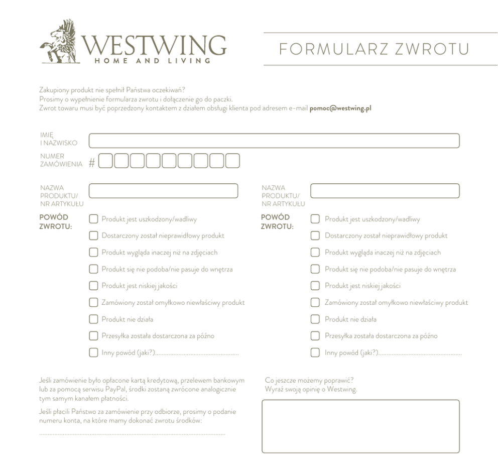 FORMULARZ ZWROT U Zakupiony produkt nie spełnił Państwa oczekiwań? Prosimy o wypełnienie formularza zwrotu i dołączenie go do paczki. Zwrot towaru musi być poprzedzony kontaktem z działem obsługi klienta pod adresem e-mail [email protected] IMIĘ I NAZWISKO NUMER ZAMÓWIENIA # NAZWA PRODUKTU/ NR ARTYKUŁU NAZWA PRODUKTU/ NR ARTYKUŁU POWÓD ZWROTU: Produkt jest uszkodzony/wadliwy Dostarczony został nieprawidłowy produkt POWÓD ZWROTU: Produkt jest uszkodzony/wadliwy Dostarczony został nieprawidłowy produkt Produkt wygląda inaczej niż na zdjęciach Produkt wygląda inaczej niż na zdjęciach Produkt się nie podoba/nie pasuje do wnętrza Produkt się nie podoba/nie pasuje do wnętrza Produkt jest niskiej jakości Produkt jest niskiej jakości Zamówiony został omyłkowo niewłaściwy produkt Zamówiony został omyłkowo niewłaściwy produkt Produkt nie działa Produkt nie działa Przesyłka została dostarczona za późno Przesyłka została dostarczona za późno Inny powód (jaki?).................................................. Inny powód (jaki?).................................................. Jeśli zamówienie było opłacone kartą kredytową, przelewem bankowym lub za pomocą serwisu PayPal, środki zostaną zwrócone analogicznie tym samym kanałem płatności. Jeśli płacili Państwo za zamówienie przy odbiorze, prosimy o podanie numeru konta, na które mamy dokonać zwrotu środków: ............................................................................................................... Co jeszcze możemy poprawić? Wyraź swoją opinię o Westwing.