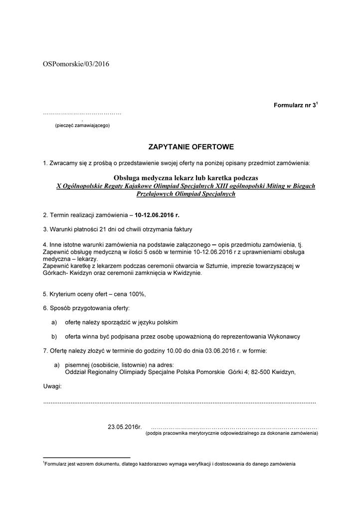 OSPomorskie/03/2016 Formularz nr 31 . (pieczęć zamawiającego) ZAPYTANIE OFERTOWE 1. Zwracamy się z prośbą o przedstawienie swojej oferty na poniżej opisany przedmiot zamówienia: Obsługa medyczna lekarz lub karetka podczas X Ogólnopolskie Regaty Kajakowe Olimpiad Specjalnych XIII ogólnopolski Miting w Biegach Przełajowych Olimpiad Specjalnych 2. Termin realizacji zamówienia – 10-12.06.2016 r. 3. Warunki płatności 21 dni od chwili otrzymania faktury 4. Inne istotne warunki zamówienia na podstawie załączonego – opis przedmiotu zamówienia, tj. Zapewnić obsługę medyczną w ilości 5 osób w terminie 10-12.06.2016 r z uprawnieniami obsługa medyczna – lekarzy. Zapewnić karetkę z lekarzem podczas ceremonii otwarcia w Sztumie, imprezie towarzyszącej w Górkach- Kwidzyn oraz ceremonii zamknięcia w Kwidzynie. 5. Kryterium oceny ofert – cena 100%, 6. Sposób przygotowania oferty: a) ofertę należy sporządzić w języku polskim b) oferta winna być podpisana przez osobę upoważnioną do reprezentowania Wykonawcy 7. Ofertę należy złożyć w terminie do godziny 10.00 do dnia 03.06.2016 r. w formie: a) pisemnej (osobiście, listownie) na adres: Oddział Regionalny Olimpiady Specjalne Polska Pomorskie Górki 4; 82-500 Kwidzyn, Uwagi: ...................................................................................................................................................... 23.05.2016r. .. (podpis pracownika merytorycznie odpowiedzialnego za dokonanie zamówienia) 1 Formularz jest wzorem dokumentu, dlatego każdorazowo wymaga weryfikacji i dostosowania do danego zamówienia Załącznik nr 1 do oferty Dotyczy ogłoszenia nr OSPomorskie/05/2016 na wykonanie usługi - obsługa medyczna lekarz lub karetka dla Olimpiad Specjalnych Oddział Regionalny Pomorskie na X Ogólnopolskie Regaty Kajakowe Olimpiad Specjalnych XIII ogólnopolski Miting w Biegach Przełajowych Olimpiad Specjalnych Nazwa oferenta Dane teleadresowe (adres, telefon, strona www, NIP , Regon Osoba odpowiedzialna za ofertę (imię, nazwisko, mail telefon) Pozycja Oferta cenowa - kryterium 1 Cena netto za 1 dzień Karetka Lekarz RAZEM ………………………………………………………………. Imię i nazwisko uprawnionego przedstawiciela oferenta Miejscowość, data Cena brutto Za 3 dni Załącznik nr 2 ……………………………………… Dane teleadresowe Wykonawcy Oświadczenie Dotyczy oferty nr OSPomorskie /5/2016 z dnia 23.05.2016r. na wykonanie usługi Składając ofertę dotyczącą wykonania usługi wydawniczej dla Olimpiad Specjalnych oddział Regionalny Pomorskie oświadczamy, że: a) posiadamy uprawnienia do wykonywania określonej działalności lub czynności, jeżeli ustawy nakładają obowiązek posiadania takich uprawnień; b) posiadamy wpis do Ewidencji Działalności Gospodarczej lub Krajowego Rejestru Sądowego – (w załączeniu dosyłamy oryginał lub kopię poświadczoną za zgodność z oryginałem, potwierdzającą wpis do EDG lub KRS); c) posiadamy niezbędną wiedzę i doświadczenie oraz potencjał techniczny, a także dysponujemy osobami zdolnymi do wykonania zamówienia; d) znajdujemy się w sytuacji ekonomicznej i finansowej zapewniającej wykonanie zamówienia; e) nie zalegamy z uiszczaniem podatków i składek na ubezpieczenia społeczne i zdrowotne f) nie zachodzą wobec nas przesłanki do wykluczenia z postępowania o udzielenie zamówienia publicznego, określone w art. 24 ust. 1 ustawy z dnia 29 stycznia 2004 r. Prawo zamówień publicznych (Dz.U. 201 r. poz. 2164.); g) nie jesteśmy podmiotem powiązanym z Zamawiającym osobowo lub kapitałowo. Przez powiązania kapitałowe lub osobowe rozumie się wzajemne powiązania między Zamawiającym lub osobami wykonującymi w imieniu Zamawiającego czynności związane z przygotowaniem i przeprowadzeniem procedury wyboru wykonawcy a Wykonawcą, polegające w szczególności na: I. uczestniczeniu w spółce, jako wspólnik spółki cywilnej lub spółki osobowej; II. posiadaniu udziałów lub co najmniej 10% udziałów lub akcji; III. pełnieniu funkcji członka organu nadzorczego lub zarządzającego, prokurenta, pełnomocnika; IV. pozostawaniu w związku małżeńskim, w stosunku pokrewieństwa lub powinowactwa w linii prostej, pokrewieństwa lub powinowactwa w linii bocznej do drugiego stopnia lub w stosunku przysposobienia, opieki lub kurateli. g) ceny wskazane w Ofercie uwzględniają wszystkie koszty związane z realizacją umowy i są cenami stałymi w okresie obowiązywania umowy; h) uważamy się za związanych niniejszą ofertą na czas wskazany w zapytaniu ofertowym; i) zobowiązujemy się, w przypadku wyboru naszej oferty, do zawarcia umowy w terminie wskazanym przez Zamawiającego. j) Wykaz zrealizowanych usług (proszę wymienić nazwę usługi, nazwę Zamawiającego, datę, koszt brutto) 1………………………… 2………………………… 3………………………… 4………………………… ..........................., dnia ............. Miejscowość, data ………................................................................................ Podpis osoby (osób) upoważnionej(ych) do występowania w imieniu Wykonawcy Czytelny podpis albo podpis i pieczątka z imieniem i nazwiskiem i pieczęć firmowa