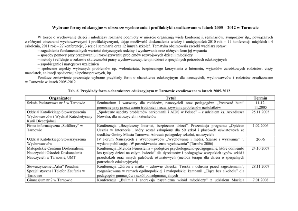 Wybrane formy edukacyjne w obszarze wychowania i profilaktyki zrealizowane w latach 2005 – 2012 w Tarnowie W trosce o wychowanie dzieci i młodzieży rozmaite podmioty w mieście organizują wiele konferencji, seminariów, sympozjów itp., powiązanych z różnymi obszarami wychowawczymi i profilaktycznymi, dając możliwość doskonalenia wiedzy i umiejętności: 2010 rok – 11 konferencji miejskich i 4 szkolenia, 2011 rok – 22 konferencje, 3 sesje i seminaria oraz 12 innych szkoleń. Tematyka obejmowała szeroki wachlarz spraw: – zagadnienia fundamentalnych wartości dotyczących rodziny i wychowania oraz różnych form jej wsparcia – sposoby pomocy przy przeżywaniu i rozwiązywaniu problemów rozwojowych dzieci i młodzieży – metody i refleksje w zakresie skuteczności pracy wychowawczej, terapii dzieci o specjalnych potrzebach edukacyjnych – zapobieganie i następstwa uzależnień – społeczne aspekty wybranych problemów np. wolontariatu, bezpiecznego korzystania z Internetu, wyjazdów zarobkowych rodziców, ciąży nastolatek, animacji społecznej niepełnosprawnych, itp. Poniższe zestawienie prezentuje wybrane przykłady form o charakterze edukacyjnym dla nauczycieli, wychowawców i rodziców zrealizowane w Tarnowie w latach 2005-2012. Tab. 6. Przykłady form o charakterze edukacyjnym w Tarnowie zrealizowane w latach 2005-2012 Organizator Szkoła Podstawowa nr 3 w Tarnowie Oddział Katolickiego Stowarzyszenia Wychowawców i Wydział Katechetyczny Kurii Diecezjalnej Firma informatyczna „SoftStory” w Tarnowie Oddział Katolickiego Stowarzyszenia Wychowawców Małopolskie Centrum Doskonalenia Nauczycieli Ośrodek Doskonalenia Nauczycieli w Tarnowie, UMT Stowarzyszenie „Arka” Poradnia Specjalistyczna i Telefon Zaufania w Tarnowie Gimnazjum nr 2 w Tarnowie Tytuł Termin Seminarium i warsztaty dla rodziców, nauczycieli oraz pedagogów: „Przerwać bunt” pomocne przy przeżywaniu trudności i rozwiązywaniu problemów nastolatków „Społeczne aspekty problemów narkomanii i AIDS w Polsce” – z udziałem ks. Arkadiusza Nowaka, dla nauczycieli i katechetów 11-12. 11.2005 25.11.2005 Konferencja „Bezpieczny Internet, bezpieczne dzieci”. Prezentacja programu „Opiekun Ucznia w Internecie”, który został zakupiony dla 50 szkół i placówek oświatowych ze środków Gminy Miasta Tarnowa. Adresat: pedagodzy szkolni, nauczyciele IV Forum Nauczycieli i Wychowawców „Wychowanie i media. Szanse i wyzwania” ”, wydano publikację: „W poszukiwaniu sensu wychowania” (Tarnów 2006) Konferencja „Metoda Feuersteina – podejście psychologiczno-pedagogiczne, które odmieniło los tysięcy dzieci na całym świecie” dla dyrektorów i pedagogów wszystkich typów szkół i przedszkoli oraz innych palcówek oświatowych (metoda terapii dla dzieci o specjalnych potrzebach edukacyjnych) Konferencja „Zdrowie matki – zdrowie dziecka. Troska i ochrona przed zagrożeniami”, zorganizowana w ramach ogólnopolskiej i małopolskiej kampanii „Ciąża bez alkoholu” dla pedagogów gimnazjów i szkół ponadgimnazjalnych Konferencja „Bulimia i anoreksja psychiczna wśród młodzieży” z udziałem Macieja 1.02.2006 2006 24.10.2007 28.11.2007 7.01.2008 Specjalistyczna Poradnia ProfilaktycznoTerapeutyczna w Tarnowie, Fundacja „Szkoła Dialogu”, UMT Oddział Katolickiego Stowarzyszenia Wychowawców Wydział Edukacji UMT Centrum Kształcenia i Wychowania OHP Stowarzyszenie „Arka” Poradnia Specjalistyczna i Telefon Zaufania w Tarnowie, Wydział Edukacji UMT Fundacja Rozwoju Edukacji, Pracy, Integracji – Warsztat Terapii Zajęciowej im. Jana Pawła II Specjalistyczna Poradnia ProfilaktycznoTerapeutyczna w Tarnowie Pileckiego – specjalisty psychiatrii UJ CM Kraków Konferencja „Szkoła dla Rodziców i Wychowawców drogą budowania relacji w duchu dialogu” – doskonalenie działań wychowawczych przedstawicieli instytucji pomocowych i samorządowych miejskich i powiatowych V Forum Nauczycieli i Wychowawców: „Wychowanie w prawdzie”, wydano publikację: „Patron szkoły – promieniowanie wartości” (Tarnów 2009) Międzynarodowa konferencja i warsztaty dla nauczycieli w zakresie nauczania dzieci i młodzieży z zespołem nadpobudliwości psychoruchowej (ADHD) Konferencja „Wyjazdy zarobkowe rodziców – dylematy rodziców i przeżycia dziecka. Jak szkoła może im pomóc?” – dla nauczycieli. Promocja książki Józefa Młyńskiego i Władysława Szewczyka „Migracje zarobkowe Polaków. Badania i refleksje” (Tarnów 2010), zakupionej do bibliotek szkolnych i miejskich z funduszy GMT Konferencja szkoleniowo-naukowa dla środowiska nauczycielskiego „Nauczyciel w społecznej animacji osób z niepełną sprawnością” 8.10.2008 2009 4.12.2009 23.03.2010 20.04.2010 Konferencja z okazji Jubileuszu 20-lecia SPPT „Być skutecznym w pomocy – refleksje o spotkaniu terapeutycznym”, spotkanie osób zajmujących się bezpośrednią pomocą psychologiczną w środowisku tarnowskim VI Forum Nauczycieli i Wychowawców: „Wolność i wychowanie” , wydano publikację: „Wolność i wychowanie” (Tarnów 2011) Konferencja dla nauczycieli, wychowawców „Ograniczenie zdrowotnych następstw palenia tytoniu” 17.11.2010 Konferencja „Aksjologiczne wymiary wychowania. Współczesne szanse i zagrożenia” dla nauczycieli, wychowawców, rodziców 7.11.2011 Konferencja „Rodzina – ostoją, opoką” 16.11.2011 Stowarzyszenie Rodzin Katolickich Diecezji Tarnowskiej, MCDN ODN Pałac Młodzieży Ogólnopolska konferencja naukowa „Dezintegracja rodziny: problemy – wyzwania – możliwości” dla nauczycieli, wychowawców, rodziców Konferencja „Pytania do Janusza Korczaka” z udziałem Rzecznika Praw Dziecka Marka Michalaka – „Pedagogika Korczaka w kontekście współczesnych problemów wychowawczych”. 23.04.2012 Wydział Edukacji i Centrum Spraw II Tydzień Wychowania „Wychowywać, ale jak?” Oddział Katolickiego Stow