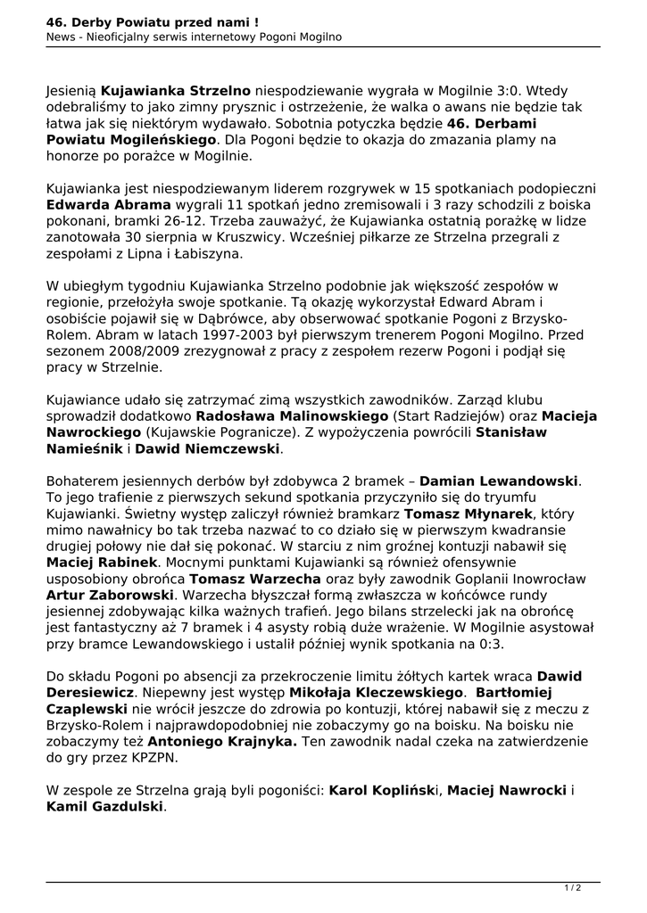 46. Derby Powiatu przed nami ! News - Nieoficjalny serwis internetowy Pogoni Mogilno Jesienią Kujawianka Strzelno niespodziewanie wygrała w Mogilnie 3:0. Wtedy odebraliśmy to jako zimny prysznic i ostrzeżenie, że walka o awans nie będzie tak łatwa jak się niektórym wydawało. Sobotnia potyczka będzie 46. Derbami Powiatu Mogileńskiego. Dla Pogoni będzie to okazja do zmazania plamy na honorze po porażce w Mogilnie. Kujawianka jest niespodziewanym liderem rozgrywek w 15 spotkaniach podopieczni Edwarda Abrama wygrali 11 spotkań jedno zremisowali i 3 razy schodzili z boiska pokonani, bramki 26-12. Trzeba zauważyć, że Kujawianka ostatnią porażkę w lidze zanotowała 30 sierpnia w Kruszwicy. Wcześniej piłkarze ze Strzelna przegrali z zespołami z Lipna i Łabiszyna. W ubiegłym tygodniu Kujawianka Strzelno podobnie jak większość zespołów w regionie, przełożyła swoje spotkanie. Tą okazję wykorzystał Edward Abram i osobiście pojawił się w Dąbrówce, aby obserwować spotkanie Pogoni z BrzyskoRolem. Abram w latach 1997-2003 był pierwszym trenerem Pogoni Mogilno. Przed sezonem 2008/2009 zrezygnował z pracy z zespołem rezerw Pogoni i podjął się pracy w Strzelnie. Kujawiance udało się zatrzymać zimą wszystkich zawodników. Zarząd klubu sprowadził dodatkowo Radosława Malinowskiego (Start Radziejów) oraz Macieja Nawrockiego (Kujawskie Pogranicze). Z wypożyczenia powrócili Stanisław Namieśnik i Dawid Niemczewski. Bohaterem jesiennych derbów był zdobywca 2 bramek – Damian Lewandowski. To jego trafienie z pierwszych sekund spotkania przyczyniło się do tryumfu Kujawianki. Świetny występ zaliczył również bramkarz Tomasz Młynarek, który mimo nawałnicy bo tak trzeba nazwać to co działo się w pierwszym kwadransie drugiej połowy nie dał się pokonać. W starciu z nim groźnej kontuzji nabawił się Maciej Rabinek. Mocnymi punktami Kujawianki są również ofensywnie usposobiony obrońca Tomasz Warzecha oraz były zawodnik Goplanii Inowrocław Artur Zaborowski. Warzecha błyszczał formą zwłaszcza w końcówce rundy jesiennej zdobywając kilka ważnych trafień. Jego bilans strzelecki jak na obrońcę jest fantastyczny aż 7 bramek i 4 asysty robią duże wrażenie. W Mogilnie asystował przy bramce Lewandowskiego i ustalił później wynik spotkania na 0:3. Do składu Pogoni po absencji za przekroczenie limitu żółtych kartek wraca Dawid Deresiewicz. Niepewny jest występ Mikołaja Kleczewskiego. Bartłomiej Czaplewski nie wrócił jeszcze do zdrowia po kontuzji, której nabawił się z meczu z Brzysko-Rolem i najprawdopodobniej nie zobaczymy go na boisku. Na boisku nie zobaczymy też Antoniego Krajnyka. Ten zawodnik nadal czeka na zatwierdzenie do gry przez KPZPN. W zespole ze Strzelna grają byli pogoniści: Karol Kopliński, Maciej Nawrocki i Kamil Gazdulski. 1/2 46. Derby Powiatu przed nami ! News - Nieoficjalny serwis internetowy Pogoni Mogilno Oba zespoły zrobią wszystko, żeby wygrać to spotkanie. Ewentualne zwycięstwo któregoś z zespołów bardzo przybliży go do awansu. Kujawianka może umocnić się na pozycji lidera natomiast jeśli wygra Pogoń, to mogilnianie wrócą na dobre do walki o awans i zniwelują przewagę Kujawianki do 3 punktów (mając rozegrany o jeden mecz więcej). Remis nie zadowoli żadnej z ekip. Dla podopiecznych Arkadiusza Glazy będzie to świetna okazja do rehabilitacji za porażkę w Mogilnie. Początek meczu w Strzelnie zaplanowano na godzinę 15:00 Wyniki sparingów Kujawianki (kolejność chronologiczna): Czarni Ostrowite 2:5 Kujawianka Strzelno Unia Gniewkowo 3:3 Kujawianka Strzelno Kujawianka Strzelno 5:1 Zjednoczeni Trzemeszno Start Radziejów 3:4 Kujawianka Strzelno Kujawianka Strzelno 0:3 Dąb Barcin Mustang Ostaszewo 0:5 Kujawianka Strzelno Noteć Gębice 5:3 Kujawianka Strzelno Kujawianka Strzelno 1:4 Cuiavia Inowrocław Autor: Rychu 2/2 Powered by TCPDF (www.tcpdf.org)