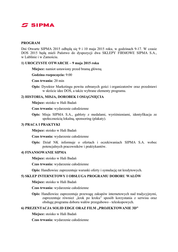PROGRAM Dni Otwarte SIPMA 2015 odbędą się 9 i 10 maja 2015 roku, w godzinach 9-17. W czasie DOS 2015 będą mieli Państwo do dyspozycji dwa SKLEPY FIRMOWE SIPMA S.A., w Lublinie i w Zamościu. 1) UROCZYSTE OTWARCIE – 9 maja 2015 roku Miejsce: namiot ustawiony przed bramą główną Godzina rozpoczęcia: 9:00 Czas trwania: 20 min Opis: Dyrektor Marketingu powita zebranych gości i organizatorów oraz przedstawi w skrócie idee DOS, a także wybrane elementy programu. 2) HISTORIA, MISJA, DOROBEK I OSIĄGNIĘCIA Miejsce: stoisko w Hali Badań Czas trwania: wydarzenie całodzienne Opis: Misja SIPMA S.A., gabloty z medalami, wyróżnieniami, identyfikacja ze społecznością lokalną, sponsoring (plakaty). 3) PRACA I PRAKTYKI Miejsce: stoisko w Hali Badań Czas trwania: wydarzenie całodzienne Opis: Dział NK informuje o ofertach i oczekiwaniach SIPMA S.A. wobec potencjalnych pracowników i praktykantów. 4) FINANSOWANIE SIPMA Miejsce: stoisko w Hali Badań Czas trwania: wydarzenie całodzienne Opis: Handlowiec zaprezentuje warunki oferty i symulację rat kredytowych. 5) SKLEP INTERNETOWY I OBSŁUGA PROGRAMU DOBORU WAŁÓW Miejsce: stoisko w Hali Badań Czas trwania: wydarzenie całodzienne Opis: Handlowiec zaprezentuje przewagę zakupów internetowych nad tradycyjnymi, zaprezentuje również „krok po kroku” sposób korzystania z serwisu oraz obsługę programu doboru wałów przegubowo - teleskopowych. 6) PREZENTACJA SOLID EDGE ORAZ FILM „PROJEKTOWANIE 3D” Miejsce: stoisko w Hali Badań Czas trwania: wydarzenie całodzienne Opis: Prezentacja wykorzystania możliwości programu Solid Edge przez zespół konstruktorów oraz wyświetlenie filmu przedstawiającego nowoczesny proces konstrukcyjny produktów SIPMA S.A. 7) WYMIANA OSŁON WPT Miejsce: plac przed MS Czas trwania: wydarzenie całodzienne Opis: Wymiana, bądź założenie osłon w dostarczonych przez rolników wałach przegubowo-teleskopowych. Współpraca z KRUS i LIR, które współfinansują wymianę osłon dla rolników. Pracownicy KRUS będą mieli swoje stoisko z materiałami informacyjnymi. 8) PREZENTACJA PRODUKTÓW Miejsce: plac przed MS Czas trwania: codziennie o pełnej godzinie Opis: Prezentacja możliwości technicznych, walorów użytkowych oraz wyróżniających cech produktów SIPMA. Prezentacja prowadzona przez konstruktorów. 9) POKAZ PRACY PRODUKTÓW Miejsce: plac przed MS Czas trwania: : codziennie o pełnej godzinie Opis: Prezentacja pracy wyrobów połączona z prezentacją produktów. 10) WYSTAWA I SPRZEDAŻ MASZYN Miejsce: Plac przy ogrodzeniu przy ul. Budowlanej Czas trwania: wydarzenie całodzienne Opis: Dwa stoiska informacyjne z pełną ofertą wyrobów: a) nowa wizualizacja – maszyny ustawione w kolejności stosowania zabiegów agrotechnicznych, z uwypukleniem nowości, b) tzw. „II wizualizacja”: o po kilka wyrobów z każdej grupy maszyn, które nie zostaną sprzedane do czasu DOS. 11) WYSTAWA I SPRZEDAŻ WAŁÓW PRZEGUBOWO-TELESKOPOWYCH Miejsce: Plac przy Hali Badań Czas trwania: wydarzenie całodzienne Opis: Handlowiec zaprezentuje ofertę wałów przegubowo-teleskopowych standardowych oraz ze sprzęgłami bezpieczeństwa, w poszczególnych wielkościach momentów. Będzie istniała możliwość zakupu. 12) WYSTAWA I SPRZEDAŻ ORYGINALNYCH CZĘŚCI ZAMIENNYCH Miejsce: Plac przy Hali Badań Czas trwania: wydarzenie całodzienne Opis: Handlowiec zaprezentuje zalety używania oryginalnych części zamiennych. Będzie istniała możliwość zakupu. 13) SPRZEDAŻ MATERIAŁÓW UŻYTKOWYCH Miejsce: stoisko w magazynie hutniczym i Hali Badań Czas trwania: wydarzenie całodzienne Opis: Stoisko informacyjne dotyczące możliwości zakupu środków produkcji i materiałów użytkowych, z możliwością obejrzenia ich z pracownikiem SIPMA S.A. 14) STOISKO KRUS Miejsce: stoisko na placu przy Hali Badań Czas trwania: wydarzenie całodzienne Opis: Stoisko informacyjne propagujące bezpieczną pracę w gospodarstwach rolnych. Obsługujący stoisko pracownicy KRUS włączą się w prowadzoną akcję wymiany osłon oraz będą udzielać porad rolnikom. 15) STOISKO FIRMY VET AGRO Miejsce: stoisko na placu przy Hali Badań Czas trwania: wydarzenie całodzienne Opis: Stoisko informacyjne firmy Vet Agro – producenta nawozów Viflo, leków weterynaryjnych oraz preparatów biobójczych i pielęgnacyjnych dla zwierząt. Przedstawiciele firmy udzielą informacji dotyczących przeznaczenia, użytkowania i przewagi wynikającej ze stosowania produktów Vet Agro. Będzie istniała możliwość zakupu powyższych produktów. 16) WYCIECZKA „NOWOCZESNE TECHNOLOGIE PRODUKCJI” Miejsce: Hale produkcyjne SIPMA S.A. Czas trwania: W sobotę i w niedzielę dwa wejścia w godzinach 12.00 i 14.00. Opis: Wycieczka po najnowocześniejszych stanowiskach produkcyjnych SIPMA S.A. z komentarzem przewodnika – pracownika RT: a) technologie wycinania laserowego (lasery 2D i 3D), b) obrabiarki sterowane numerycznie do obróbki plastycznej (prasa LVD – TANDEM), c) obrabiarki sterowane numerycznie do obróbki skrawaniem (DMG, OKUMA), d) technologie przygotowania powierzchni (linia TALME, śrutownica), e) zrobotyzowane stanowiska spawalnicze, f) linia montażu, g) gniazda obróbki cieplno-chemicznej (hartownia SW), h) linia zdawania pras. 17) OGRÓDEK SIPMA S.A. a) grill organizowany przez restaurację Oranżeria – każdy uczestnik DOS otrzyma program, do którego będą dołączone dwa kupony uprawniające do otrzymania poczęstunku oraz napoju. Będzie istniała możliwość swobodnego zakupu dań poza kuponami. b) animacje dla dzieci.