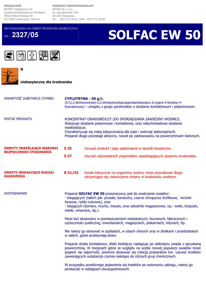 PRODUCENT BAYER CropScience AG Landwirtschaftszentrum Monheim Alfred Nobel Strasse 50 D-51368 Leverkusen, Niemcy PODMIOT ODPOWIEDZIALNY BAYER Sp. z o.o. Al. Jerozolimskie 158 02-326 Warszawa tel.: 022 572 36 61; faks: 022 572 36 09 SOLFAC EW 50 NR POZWOLENIA NA OBRÓT PRODUKTEM BIOBÓJCZYM: MZ – 2327/05 N niebezpieczny dla środowiska ZAWARTOŚĆ SUBSTANCJI CZYNNEJ CYFLUTRYNA - 50 g/L (3-(2,2-dichlorowinylo)-2,2-dimetylocyklopropanokarboksylanu ά-cyjano-3-fenoksy-4fluorobenzylu) – związku z grupy pyretroidów o działaniu kontaktowym i pokarmowym. POSTAĆ PRODUKTU KONCENTRAT OWADOBÓJCZY (DO SPORZĄDZANIA ZAWIESINY WODNEJ). Wykazuje działanie pokarmowe i kontaktowe, oraz natychmiastowe działanie insektobójcze. Charakteryzuje się niską toksycznością dla ludzi i zwierząt stałocieplnych. Preparat długo pozostaje aktywny, nawet po zastosowaniu na powierzchniach bielonych. ZWROTY OKREŚLAJĄCE WARUNKI BEZPIECZNEGO STOSOWANIA S 35 Usuwać produkt i jego opakowanie w sposób bezpieczny. S 57 Używać odpowiednich pojemników zapobiegających skażeniu środowiska. ZWROTY WSKAZUJĄCE RODZAJ ZAGROŻENIA R 51/53 Działa toksycznie na organizmy wodne; może powodować długo utrzymujące się niekorzystne zmiany w środowisku wodnym. ZASTOSOWANIE Preparat SOLFAC EW 50 przeznaczony jest do zwalczania owadów: - biegających (takich jak: prusaki, karaluchy, czarne chrząszcze ściółkowe, mrówki faraona, rybiki cukrowe), oraz - latających (komary, muchy, meszki, oraz szkodniki magazynowe, np.: wołki, trojszyki, mkliki, omacnice, itp.). Może być stosowany w pomieszczeniach mieszkalnych, biurowych, fabrycznych i użyteczności publicznej, inwentarskich, magazynach, piekarniach, młynach, itp. Nie należy go stosować w szpitalach, w izbach chorych oraz w żłobkach i przedszkolach w salach, gdzie przebywają dzieci. Preparat działa kontaktowo, efekt biobójczy następuje po zetknięciu owada z opryskaną powierzchnią. W miejscach gdzie ze względu na szybki rozwój populacji owadów może pojawić się odporność, powinno stosować się rotację preparatów tzn. używać środków zawierających substancje czynne należące do różnych grup chemicznych. W przypadku powtórnego pojawienia się insektów po wykonaniu zabiegu, należy go powtarzać w odstępach dwutygodniowych. MAGAZYNOWANIE Preparat przechowywać w: - oryginalnych, szczelnie zamkniętych opakowaniach; - w suchym i dobrze wentylowanym magazynie; - w temperaturze od 0 do 300C; - w miejscach niedostępnych dla osób nieupoważnionych, zwłaszcza dzieci; - z dala od środków spożywczych, pasz, naczyń na żywność, źródeł ciepła i ognia. POSTĘPOWANIE Z ODPADAMI PREPARATU I OPAKOWANIEM Resztki niewykorzystanej cieczy użytkowej rozcieńczyć wodą i zużyć na powierzchni poprzednio opryskiwanej. Zużyte opakowania przekazać do uprawnionego odbiorcy. Zabrania się spalania opakowań po środku we własnym zakresie. UWAGA - ZABRANIA SIĘ WYKORZYSTYWANIA OPRÓŻNIONYCH OPAKOWAŃ DO INNYCH CELÓW, W TYM TAKŻE TRAKTOWANIA ICH JAKO SUROWCE WTÓRNE. ZALECENIA DOTYCZĄCE WENTYLACJI Preparat nie działa szkodliwie przez drogi oddechowe. Przed użytkowaniem pomieszczenia, w którym wykonano zabieg należy odczekać do czasu wyschnięcia opryskiwanych powierzchni. SPOSÓB UŻYCIA/STOSOWANIA Do zwalczania owadów biegających i latających wewnątrz pomieszczeń - Należy użyć roztwór roboczy przygotowany przez zmieszanie 80 ml preparatu z 10 litrami wody. Stosować 50 ml cieczy roboczej na 1m2 lub opryskiwać do momentu widocznego zwilżenia powierzchni. Opryskiwać miejsca bytowania i wędrówek owadów, a więc dolne fragmenty ścian, okolice listew podłogowych, rur hydraulicznych i c.o., miejsca za szafkami, zlewozmywakami, wannami, ekranami, tylne ścianki mebli oraz szczeliny, szpary, miejsca gdzie owady mogą się ukrywać. Aby zwalczyć owady latające należy opryskać cieczą miejsca częstego siadania owadów: ramy okien, ściany, balkony, itp. Do zwalczania owadów latających - Zmieszać 40-60 ml preparatu z 10 litrami wody. Stosować 50 ml cieczy roboczej na 1m2 powierzchni. Należy opryskiwać nasłonecznione powierzchnie ścian, okapy, framugi drzwi i okien i inne powierzchnie, na których chętnie siadają owady. Do zwalczania much w pomieszczeniach gospodarskich Przygotować emulsję mieszając 60 ml preparatu z 10 litrami wody; stosować 50 - 70 ml cieczy roboczej na 1m2 powierzchni. Na czas wykonywania oprysku należy usunąć zwierzęta z pomieszczenia. Poidła, żłoby i miejsca składowania paszy – starannie przykryć papierem. Opryskiwać miejsca siadania i gromadzenia się owadów: nasłonecznione ściany, framugi okien i drzwi, itp. Stosować powyżej 1,5 m w chlewniach i 2 m w oborach – aby zapobiec kontaktom zwierząt z powierzchnią pokrytą preparatem. Aerozolowanie przestrzeni (zimna i gorąca mgła). Do zwalczania owadów latających i biegających. Przygotować roztwór roboczy mieszając 100 ml preparatu Solfac EW50 z 900 ml wody i aplikować w dawce 1000 ml cieczy roboczej na 1000 m3 przestrzeni. Przed stosowaniem wyłączyć wentylację, zamknąć drzwi, okna i uszczelnić inne otwory. Pomieszczenie pozostawić zamknięte przez minimum 60 minut. Aerozol rozprowadzić dokładnie i równomiernie tak aby dotarł do wszelkich kryjówek owadów. Aerozolowanie powtórzyć według potrzeby. SPOSÓB PRZYGOTOWANIA CIECZY ROBOCZEJ Napełnić zbiornik opryskiwacza do połowy, dodać odpowiednią ilość preparatu SOLFAC EW50, dopełnić pozostałą ilością wody, starannie wymieszać. OBJAWY ZATRUCIA - bóle i zawroty głowy; - mdłości i wymioty; - zaburzenia jelitowo-żołądkowe; - osłabienie; - podwyższone lub obniżone ciśnienie; - podrażnienia i zaczerwienienia skóry i oczu. ANTIDOTUM BRAK - STOSOWAĆ LECZENIE OBJAWOWE. W sytuacjach, kiedy konieczna jest inna pomoc medyczna niż ujęta w ostrzeżeniach skontaktować się z najbliższym ośrodkiem toksykologicznym. OŚRODKI