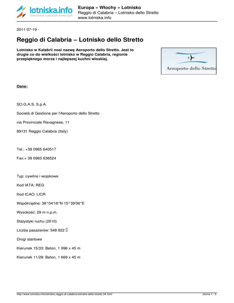 Europa » Włochy » Lotnisko Reggio di Calabria – Lotnisko dello Stretto www.lotniska.info 2011-07-19 - Reggio di Calabria – Lotnisko dello Stretto Lotnisko w Kalabrii nosi nazwę Aeroporto dello Stretto. Jest to drugie co do wielkości lotnisko w Reggio Calabria, regionie przepięknego morza i najlepszej kuchni włoskiej. Dane: SO.G.A.S. S.p.A. Società di Gestione per l'Aeroporto dello Stretto via Provinciale Ravagnese, 11 89131 Reggio Calabria (Italy) Tel.: +39 0965 640517 Fax:+ 39 0965 636524 Typ: cywilne i wojskowe Kod IATA: REG Kod ICAO: LICR Współrzędne: 38°04'16″N 15°39'06″E Wysokość: 29 m n.p.m. Statystyki ruchu (2010) Liczba pasażerów: 548 922 ▲ Drogi startowe Kierunek 15/33: Beton, 1 996 x 45 m Kierunek 11/29: Beton, 1 669 x 45 m http://www.lotniska.info/lotnisko,reggio-di-calabria-lotnisko-dello-stretto,54.html strona 1 / 5 Europa » Włochy » Lotnisko Reggio di Calabria – Lotnisko dello Stretto www.lotniska.info Tablica lotów – przyloty Tablica lotów – odloty Linie operujące z lotniska HISTORIA Pierwszy pas startowy na lotniku w Kalabrii został zbudowany w 1939 roku w celach militarnych. Zostały na nim ulokowane dowództwa włoskie i niemieckie. Trzy lata później wystartowały z lotniska w Reggio di Calabria pierwsze samoloty wojskowe z intencją nalotu na Maltę. Prowadzone działania wojenne doprowadziły do zniszczenia pasu startowego który szybko po wojnie został odbudowany i zaczął już służyć pasażerom w transporcie cywilnym. Tym też sposobem pierwszy lot pasażerski odbył się 10 kwietnia 1947 roku. Aktualnie port lotniczy w Kalabrii służy głównie regionowi Kalabrii. Ruch pasażerski lądowiska to około 1,5 miliona osób rocznie. W 2006 roku zwiększony ruch na lotnisku w Reggio Calabria spowodował dynamiczny wzrost pasażerów krajowych (wzrost o 53,6%) i pasażerów w ruchu międzynarodowym (wzrost o 175,5%). Kołowanie samolotu na lotnisku w Raggio Calabria (video) DOJAZD Metromare (METROnaMORZU) to chyba jedne z nielicznych rozwiązań na świecie. Otóż na lotnisku działa firma która świadczy usługi transportu z lotniska najpierw autobusem do portu w Reggio Calabria, z tamtąd też statkiem do Portu w Messynie. Połączenie te jest koordynowane z godzinami przylotu i odlotu samolotów głównie krajowych. Odkryj uroki Reggio Calabria - zobacz film! Godziny kursów można znaleźć na stronie: http://www.aeroportodellostretto.it/collegamenti-metromare.asp http://www.lotniska.info/lotnisko,reggio-di-calabria-lotnisko-dello-stretto,54.html strona 2 / 5 Europa » Włochy » Lotnisko Reggio di Calabria – Lotnisko dello Stretto www.lotniska.info Autobus Na lotniku można skorzystać z usług firm ATAM i LINEA JONICA ATAM Połączenia z/do Lotnisko Reggio Calabria – Port i Dworzec główny w Reggio Kalabria (mieści się na Placu Garibaldi) Połączenia z Lotnisko Reggio Kalabria – centrum miasta Bielty można kupić w kiosku na lotnisku lub w punktach oznaczonych symbolem ATAM Więcej informacji na stronie: Tel: +39 0965 620121- www.atam.rc.it LINEA JONICA http://www.lotniska.info/lotnisko,reggio-di-calabria-lotnisko-dello-stretto,54.html strona 3 / 5 Europa » Włochy » Lotnisko Reggio di Calabria – Lotnisko dello Stretto www.lotniska.info Z lotniska można skorzystać z autobusu firmy Autolinee Federico S.p.A który zabierze nas w niezapomnianą podróż wzdłuż wybrzeża morza Jońskiego. Rozkład jazdy jak i godziny znajdują się tutaj. Poniżej znajduje się mapka podróży i miejscowości przez które przejeżdża autobus tel. +390965 644747 - www.autolineefederico.it Taxi Na lotnisku można skorzystać usług taxi 24 godziny na dobę. Aerotaxi Na lotnisku w Kalabrii istnieje możliwość skorzystania z usług taksówki powietrznej która zabierze do najciekawszych miejsc regionu i nie tylko. Wiecej informacji na stronie firmy AIR PANAREA www.airpanarea.com Wynajem samochodów w obrębie lotniska http://www.aeroportodellostretto.it/autonoleggi.asp http://www.lotniska.info/lotnisko,reggio-di-calabria-lotnisko-dello-stretto,54.html strona 4 / 5 Europa » Włochy » Lotnisko Reggio di Calabria – Lotnisko dello Stretto www.lotniska.info http://www.lotniska.info/lotnisko,reggio-di-calabria-lotnisko-dello-stretto,54.html http://www.lotniska.info/lotnisko,reggio-di-calabria-lotnisko-dello-stretto,54.html Powered by TCPDF (www.tcpdf.org) strona 5 / 5