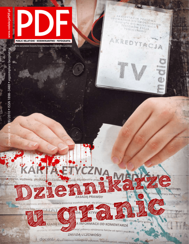 www.redakcjaPDF.pl czerwiec nr 6 (28)/2010 • ISSN 1898–3480 • egzemplarz bezpłatny pismo warsztatowe Instytutu Dziennikarstwa Uniwersytetu Warszawskiego e z r a k i n n e i z D c i n a r ug Ale Na wejściu To tylko transpresja dziennikarstwo numer! 03 Na wejściu: Włodzimierz Szaranowicz o pracy komentatora podczas wielkich sportowych imprez 04 Na wejściu: Rzecznikarze mają się w najlepsze; Za sprawą Marcina Gortata rośnie zainteresowanie NBA w mediach 06 Temat numeru: Czy są granice w dziennikarstwie? Wątpliwości po tragedii smoleńskiej. foto 08 Puls redakcji: Custom publishing jak nie magazyn firmowy 09 Polecamy: Kursy fotograficzne to element rozwoju fotograficznego – rozmowa z Agnieszką Rayss ze Sputnik Photos 10 Warsztat: Siła fotografii komórkowej 11 Kolumna Zygmunta: Kiedyś paparazzi tworzyli sztukę dodatek specjalny: public relations 14 Wybierz sobie bank: Poradnik jak wybrać bezpieczne i tanie konto internetowe. 18 PR na świecie to nadal inny public relations niż polski. Rożni się. Jak bardzo? K&Ż banki 12 Fotoesej: Moda od kuchni 20 Scena, ekran, dźwięk i słowo, czyli subiektywnie o kulturze 19 Case study: Szkoły rywalizują o boisko marzeń w konkursie plastycznym 19 Poradnik: W walce z czasem o zdrowy kręgosłup 24 Po raz pierwszy w Polsce wystawa o euro organizowana przez Europejski Bank Centralny Zbigniew Żbikowski Tę granicę przekracza się równie łatwo, jak wewnętrzne granice Unii Europejskiej. Pojawiają się niby pewne znaki, że podróżujący przejeżdża z jednego obszaru do drugiego, jakieś napisy, mundury, bramy przejazdowe, ale zwykle nie trzeba się nawet zatrzymywać, wystarczy zwolnić, a w pociągu to już w ogóle przejeżdża się granice zupełnie biernie. A jednak, mimo braku granicznych emocji, człowiek może nagle znaleźć się w całkiem innej rzeczywistości. Jak po przejechaniu (trudno mówić o „przekraczaniu“) granicy niemieckoholenderskiej. Co po jednej stronie było karalne, naganne, nieprzyzwoite, po drugiej okazuje się dozwolone, akceptowane, kulturalne. Jak w życiu. Jak w dziennikarstwie. W transgresji, przekraczaniu norm ustalających zasady postępowania w konkretnej grupie społecznej, wielu badaczy, polityków, publicystów, upatruje źródło tak zwanego postępu. Tak było od początku życia społecznego i jego reguł, od pojawienia się etyki (normatywnej w szczególności), od zaistnienia tabu. Zawsze pojawiały się jednostki i ich zwolennicy, uznający normy za zniewolenie i podejmujący próby poznania, co jest po drugiej stronie granicy. Generalnie - miała być wolność. Transgresja w imię wolnośći mediów to podróż z biletem w jedną stronę. Kiedy się pokonuje którąś z barier z kanonu etycznego mediów, nie ma odwrotu - publika poznaje, co jest „po drugiej stronie“ i spory jej odłam zaczyna wołać: Jeszcze! Jeszcze! Dysponent medium otrzymuje społeczne przyzwolenie, a dziennikarze rozgrzeszenie: dają przecież tylko to, czego domaga się czytelnikowidzosłuczacz. Mówiąc językiem ekonomii - decyduje rynek. Kto nie chce, nie musi się zapoznawać. I tak pod społeczną presją - samodzielnie przez media wykreowaną - padają kolejne granice. W swoim czasie głośno było o niewielkiej książce „Utracona cześć Katarzyny Blum“ niemiec- Redakcja to redukcja Na koniec roku akademickiego pesymistycznie. Zdecydowanie minus. Bez plusa. „Dziennikarze namawiają dziennikarzy do zmiany zawodu” - na artykuł o takim lub bardzo podobnym, a zachowującym właśnie taki sens, tytule natknęłam się kilkanaście dni temu w serwisie internetowym press.pl. Musiałam zajrzeć, bo przecież każdego, kto w tym zawodzie jest, taki news zainteresować musi. Była to notatka o konferencji Stowarzyszenia Dziennikarzy Polskich, którzy rozmawiali o trudniejszej niż kiedykolwiek sytuacji na rynku pracy w mediach. Świadczyć o tym miał przede wszystkim nieznany w przeszłości skok ilościowy zgłoszeń dziennikarzy poszukujących pracy za pośrednictwem SDP oraz coraz mniejsza liczba (kilka miesięcznie) ofert pracy dla nich. A są to zwykle dziennikarze z doświadczeniem, którzy pracę stracili przez redukcje, jakie przetoczyły się w ostatnich dwóch latach w większości redakcji. Wszędzie wydawcy postawili na małe zespoły, w których okrojony o połowę zespół musi wypełnić tyle samo stron bądź minut programu co wcześniej. Czołową rolę odgrywają redaktorzy, którzy wymyślają temat bądź jego ujęcie. Garstka wykonawców co zostali na placu boju, od rana do nocy te wizje realizuje. Fatalna sytuacja na rynku kładzie się cieniem oczywiście także na sytuacji młodych ludzi, którzy dopiero o wejściu do zawodu myślą. Podczas konferencji poruszono i ten temat. Uczestnicy nie mogli nadziwić się, po co w Polsce jest tak wiele (bodajże kilkanaście) wydziałów dziennikarstwa na wyższych uczelniach, skoro ich absolwenci nie znajdują później pracy. Padł nawet apel wprost do młodych, by wybierali inne kierunki! Wszystko mnie to przeraziło, chociaż od kilku lat jestem w zawodzie i obserwuję, co dzieje się w redakcjach. Jest naprawdę źle – pracy jest dużo, oczekiwania jeszcze większe, ale jest to wszystko coraz bardziej zautomatyzowane, pozbawione misji i odpowiedzialności za przekaz. Gołym okiem widać, że nie da się robić dobrych mediów bez dziennikarzy. zespół redakcyjny: Tomasz Dowbor, Roksana Gowin, Magdalena Grzymkowska, Dominika Jędrzejczyk, Patryk Juchniewicz, Marcin Kasprzak, Mirek Kaźmierczak, Anna Kiedrzynek, Jakub Szarejko, Krystian Szczęsny, Maja Trzeciak, Elżbieta Wójcik, Agata Żurawska reklama REDAKCJA redaktor naczelny: Zbigniew Żbikowski współpraca: Cezary Biernat, Jan Brykczyński, Radosław Firlej, Bartosz Iwański, Małgorzata Januchowska, Maria I. Szulc, Wioletta Wysocka, Marcel Zatoński z-ca redaktora naczelnego Paweł H. Olek autorskie cykle: Gdzie sie zaczęłam - Magdalena Karst-Adamczyk Zapis