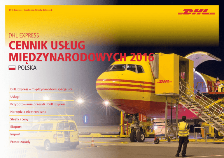 DHL Express – Excellence. Simply delivered. DHL EXPRESS CENNIK USŁUG MIĘDZYNARODOWYCH 2016 POLSKA DHL Express – międzynarodowi specjaliści Usługi Przygotowanie przesyłki DHL Express Narzędzia elektroniczne Strefy i ceny Eksport Import Proste zasady DHL Express – międzynarodowi specjaliści Cennik usług międzynarodowych 2016 Usługi DHL EXPRESS – MIĘDZYNARODOWI SPECJALIŚCI Przygotowanie przesyłki DHL Express Narzędzia elektroniczne Strefy i ceny Eksport Import Proste zasady DHL Express jest światowym liderem rynku i specjalistą w parze z pasją i pozytywnym nastawieniem, pozwala Przygotowany cennik pozwoli zapoznać się z szeroką w międzynarodowych usługach logistycznych. Od ponad oferować naprawdę światowy poziom usług oraz zapewnia ofertą usług naszej firmy i skorzystać z tych, które najlepiej 45 lat nieustająco tworzymy i stale polepszamy naszą bezpieczne i najszybsze możliwe doręczenie przesyłek spełniają oczekiwania Klientów. W przypadku jakichkolwiek ofertę. Kluczem do sukcesu jest siła naszej globalnej sieci, naszych Klientów. Nasi pracownicy uczestniczą w programie pytań, prosimy o kontakt z lokalnym Przedstawicielem na którą składa się około 80 000 pracowników, działających motywacyjno-rozwojowym – Certified International Handlowym DHL Express lub odwiedzić stronę w ponad 220 krajach i terytoriach – wszystkich skupionych Specialists (CIS – Certyfikowani Międzynarodowi Specjaliści), www.dhl.com.pl/express. na dostarczaniu usług najwyższej jakości. co jeszcze dodatkowo pogłębia ich profesjonalną wiedzę. To właśnie międzynarodowe doświadczenie pracowników DHL wyróżnia nas na tle konkurencji. Ich wiedza, idąca 2 Eksport DHL Express – międzynarodowi specjaliści Cennik usług międzynarodowych 2016 Usługi USŁUGI Przygotowanie przesyłki DHL Express Wszystkie nasze usługi są określone czasowo i umożliwiają bezpieczne doręczenie „od drzwi do drzwi” Eksport towarów i dokumentów między prawie wszystkimi krajami świata. Niezależnie od tego, czy Klienci Import oczekują doręczenia na początku, w środku, czy pod koniec dnia pracy, nasze usługi umożliwiają Proste zasady Import Usługi dodatkowe Dopłaty Narzędzia elektroniczne Usługi celne Strefy i ceny przejrzyste monitorowanie przesyłek, więc zawsze wiedzą, gdzie dokładnie się znajdują. EKSPORT DHL Express Worldwide Nasza najpopularniejsza usługa pozwala na doręczenie z dnia na dzień gdziekolwiek na świecie przesyłek do 1 000 kg z elementami do 70 kg. DHL Express Envelope Międzynarodowe doręczenie lekkich przesyłek z dokumentami w systemie „od drzwi do drzwi” na koniec następnego możliwego dnia roboczego. n Waga do 300 gramów n Globalny zasięg n Wysyłka tylko dokumentów n Koperta oraz usługa GoGreen Climate Neutral w cenie DHL Medical Express DHL Economy Select Doskonałe rozwiązanie dla firm z branży Niezawodna, ekonomiczna, drogowa medycznej. Obejmuje przesyłanie materiałów usługa o europejskim zasięgu. Obejmuje biologicznych kat. B (UN 3373) według nadawanie w obrębie Europy pojedynczych priorytetowej obsługi. Globalne Centra paczek, przesyłek wieloelementowych Kontroli Jakości monitorują przesyłki lub palet. Dodatkowe zalety tej usługi DHL Medical Express przez cały czas (24/7), to przystępne ceny i wygoda doręczenia podejmując niezbędne kroki w razie w określonym, nieprzekraczalnym potrzeby. terminie. USŁUGI W SKRÓCIE DHL Express Worldwide DHL Express Envelope DHL Medical Express DHL Economy Select Opis usługi Doręczenie do końca następnego możliwego dnia roboczego Doręczenie do końca następnego możliwego dnia roboczego Priorytetowe doręczenie w najszybszym możliwym czasie Doręczenie w ciągu określonej liczby dni, przed końcem dnia roboczego Zasięg (kraje) Więcej niż 220 Więcej niż 220 52 31 Liczba prób doręczenia 3 3 3 2 Maksymalna waga elementu (nie na palecie) 70 kg 0,3 kg 30 kg 70 kg Standardowy wymiar elementu do (dł. x szer. x wys.) 120 x 80 x 80 cm1) 32 x 24 cm 120 x 80 x 80 cm1) 120 x 80 x 80 cm1) Możliwość transportu na palecie Tak Nie Nie Tak Maksymalna waga palety 1 000 kg Niedostępne Niedostępne 1 000 kg Maksymalna waga przesyłki 1 000 kg 0,3 kg 300 kg 1 000 kg Maksymalne wymiary palety (dł. x szer. x wys.) 120 x 100 x 160 cm Niedostępne Niedostępne 120 x 100 x 160 cm 1) Maksymalny wymiar elementu nie na palecie, nie może być większy niż 300 x 120 x 160 cm. Opłata dodatkowa za element niestandardowy jest naliczana, jeśli przekroczono którykolwiek z tych wymiarów. Szczegółowe informacje o dostępności usług na http://dct.dhl.com lub w Dziale Obsługi Klienta DHL – Przesyłki Międzynarodowe. 3 Eksport Cennik usług międzynarodowych 2016 DHL Express – międzynarodowi specjaliści Usługi Przygotowanie przesyłki DHL Express Narzędzia elektroniczne Strefy i ceny Eksport Import Proste zasady DHL Jetline, DHL Sprintline Doskonałe rozwiązanie dla przesyłek z zawartością wrażliwą na upływ czasu lub temperaturę, o niestandardowych wymiarach albo o dużej wartości. Usługi polegają na natychmiastowym odbiorze przesyłek i wysłaniu ich najbliższym możliwym lotem lub transportem drogowym oraz doręczeniu pod wskazany adres w najkrótszym możliwym czasie. W ramach tych usług aranżujemy czartery samolotów cargo, usługi courier-on-board, a nawet transport materiałów niebezpiecznych czy przesyłek w suchym lodzie zgodnie z przepisami IATA oraz ADR. Wycena dokonywana jest indywidualnie dla każdego transportu. Aranżowaniem i indywidualną wyceną zajmuje się Dział Usług Niestandardowych i Kontroli Sieci: n usł[email protected] n [email protected] Dostępność od poniedziałku do piątku w godzinach 7:00-22:00. Transporty realizowane są 24h/7 dni w tygodniu. Szczegółowe informacje o dostępności usług na http://dct.dhl.com lub w Dziale Obsługi Klienta DHL – Przesyłki Międzynarodowe. Import Usługi do