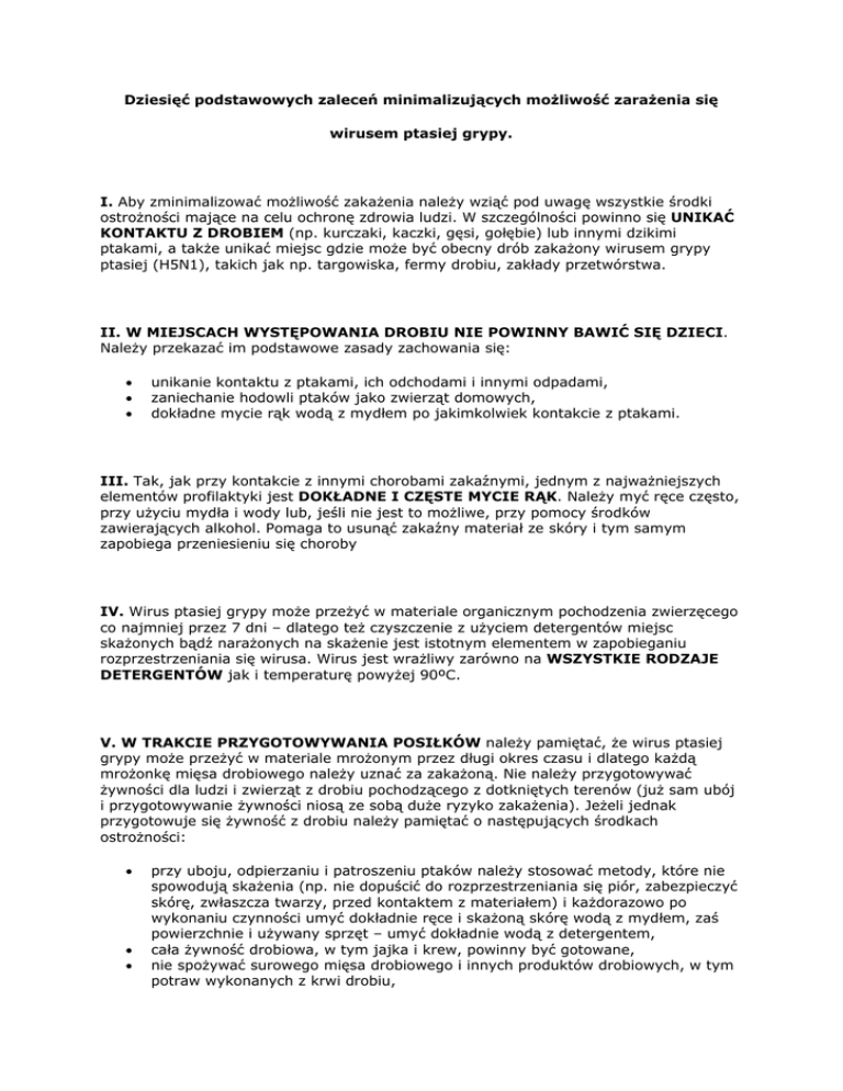 Dziesięć podstawowych zaleceń minimalizujących możliwość zarażenia się wirusem ptasiej grypy. I. Aby zminimalizować możliwość zakażenia należy wziąć pod uwagę wszystkie środki ostrożności mające na celu ochronę zdrowia ludzi. W szczególności powinno się UNIKAĆ KONTAKTU Z DROBIEM (np. kurczaki, kaczki, gęsi, gołębie) lub innymi dzikimi ptakami, a także unikać miejsc gdzie może być obecny drób zakażony wirusem grypy ptasiej (H5N1), takich jak np. targowiska, fermy drobiu, zakłady przetwórstwa. II. W MIEJSCACH WYSTĘPOWANIA DROBIU NIE POWINNY BAWIĆ SIĘ DZIECI. Należy przekazać im podstawowe zasady zachowania się: • • • unikanie kontaktu z ptakami, ich odchodami i innymi odpadami, zaniechanie hodowli ptaków jako zwierząt domowych, dokładne mycie rąk wodą z mydłem po jakimkolwiek kontakcie z ptakami. III. Tak, jak przy kontakcie z innymi chorobami zakaźnymi, jednym z najważniejszych elementów profilaktyki jest DOKŁADNE I CZĘSTE MYCIE RĄK. Należy myć ręce często, przy użyciu mydła i wody lub, jeśli nie jest to możliwe, przy pomocy środków zawierających alkohol. Pomaga to usunąć zakaźny materiał ze skóry i tym samym zapobiega przeniesieniu się choroby IV. Wirus ptasiej grypy może przeżyć w materiale organicznym pochodzenia zwierzęcego co najmniej przez 7 dni – dlatego też czyszczenie z użyciem detergentów miejsc skażonych bądź narażonych na skażenie jest istotnym elementem w zapobieganiu rozprzestrzeniania się wirusa. Wirus jest wrażliwy zarówno na WSZYSTKIE RODZAJE DETERGENTÓW jak i temperaturę powyżej 90ºC. V. W TRAKCIE PRZYGOTOWYWANIA POSIŁKÓW należy pamiętać, że wirus ptasiej grypy może przeżyć w materiale mrożonym przez długi okres czasu i dlatego każdą mrożonkę mięsa drobiowego należy uznać za zakażoną. Nie należy przygotowywać żywności dla ludzi i zwierząt z drobiu pochodzącego z dotkniętych terenów (już sam ubój i przygotowywanie żywności niosą ze sobą duże ryzyko zakażenia). Jeżeli jednak przygotowuje się żywność z drobiu należy pamiętać o następujących środkach ostrożności: • • • przy uboju, odpierzaniu i patroszeniu ptaków należy stosować metody, które nie spowodują skażenia (np. nie dopuścić do rozprzestrzeniania się piór, zabezpieczyć skórę, zwłaszcza twarzy, przed kontaktem z materiałem) i każdorazowo po wykonaniu czynności umyć dokładnie ręce i skażoną skórę wodą z mydłem, zaś powierzchnie i używany sprzęt – umyć dokładnie wodą z detergentem, cała żywność drobiowa, w tym jajka i krew, powinny być gotowane, nie spożywać surowego mięsa drobiowego i innych produktów drobiowych, w tym potraw wykonanych z krwi drobiu, • • • • • • • • • • nie dopuścić do kontaktu mięsa surowego z mięsem gotowanym lub gotowym już do spożycia, do przygotowania surowego mięsa nie używać tej samej deski lub tego samego noża, przy użyciu których przygotowuje się mięso gotowane lub gotowe już do spożycia, nie przenosić zarówno surowego jak i gotowanego mięsa bez mycia rąk pomiędzy tymi czynnościami, nie umieszczać gotowanego mięsa w tym samym miejscu lub na tej samej powierzchni, na której wcześniej znajdowało się mięso surowe, żółtek jaj nie spożywać w postaci płynnej, ponieważ wirus grypy ulega zniszczeniu w wysokiej temperaturze – temperatura gotowania mięsa drobiowego powinna osiągnąć temperaturę 90ºC, przed gotowaniem jaj należy umyć ich skorupki wodą z mydłem oraz pamiętać o każdorazowym umyciu rąk po tej czynności, nie używać jaj surowych lub ugotowanych na miękko do przygotowania żywności, która nie będzie gotowana przed spożyciem, przed spożyciem jaja gotować przynajmniej przez 5 min w temperaturze 90ºC, każdorazowo po kontakcie z surowym mięsem drobiowym lub jajami należy umyć dokładnie ręce wodą z mydłem zaś wszystkie powierzchnie oraz sprzęt mający kontakt z tymi produktami – wodą z detergentem. VI. Należy kontaktować się na bieżąco z lokalnymi SŁUŻBAMI WETERYNARYJNYMI w celu uzyskania informacji dotyczących: • • miejsc występowania drobiu podejrzanego o zakażenie, bezpiecznych sposobów niszczenia martwego drobiu, jego odchodów i innych odpadów. VII. NIE NALEŻY TRANSPORTOWAĆ ŻYWEGO LUB MARTWEGO DROBIU nawet, jeżeli twierdzi się, że jest on zdrowy. Jeżeli jednak przez przypadek doszło do kontaktu z drobiem na terenie występowania ptasiej grypy np. fermy, targowiska (w tym kontakt ze zwłokami ptaków, ich odchodami lub innymi odpadami) należy podjąć następujące środki ostrożności: • • • • dokładnie oczyścić obuwie (poza mieszkaniem) wodą z mydłem, a następnie dokładnie umyć ręce, monitorować stan swojego zdrowia przez 10 dni – przynajmniej 1 raz dziennie kontrolować temperaturę ciała, jeżeli w ciągu 10 dni pojawią się objawy takie jak: wzrost temperatury ciała powyżej 37,5ºC, kaszel lub trudności w oddychaniu, albo jeżeli rozwiną się inne objawy chorobowe należy natychmiast skontaktować się z lekarzem, przed wizytą w placówce służby zdrowia należy poinformować lekarza (telefonicznie, elektronicznie) o swoich objawach, kontakcie z drobiem, jeżeli taki miał miejsce, ewentualnych podróżach z krajów o wysokim wskaźniku zachorowalności ptaków, VIII. JEŚLI u osoby mającej kontakt z ptactwem lub powracającej z krajów dotkniętych ptasią grypą POJAWIĄ SIĘ OBJAWY GRYPOWE, po bezzwłocznym umówieniu telefonicznej wizyty u lekarza, powinna ona ograniczyć kontakt z innymi osobami na tyle, na ile jest to możliwe, aby zapobiec rozprzestrzenieniu się choroby na inne osoby. INNE OSOBY NIE POWINNY MIEĆ KONTAKTU Z WYDZIELINĄ Z NOSA I UST osoby wykazującej objawy choroby lub chorej. Chusteczki higieniczne i inne środki higieny osobistej mające kontakt z wydzielinami i wydalinami osoby wykazującej objawy choroby należy bezpie