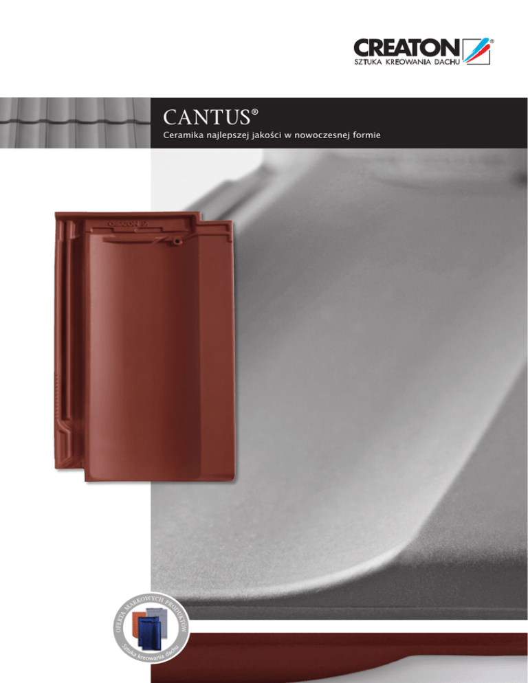 CANTUS® Ceramika najlepszej jakości w nowoczesnej formie 02I03 CANTUS® – ceramika najlepszej jakości Dachówka CANTUS® łączy w sobie nowoczesną, prostą formę, najlepszej jakości szlachetne powierzchnie i homogeniczną bryłę. Osiągnięto to dzięki zmyślnemu poddaniu najlepszych surowców innowacyjnym technikom produkcyjnym. W procesie powstawania dachówki CANTUS® stawia się konsekwentnie na znakomitą jakość od podstaw. Barwione w masie dachówki są wypalane w technologii „HOCHBRANDFAKTOR®“ w temperaturze ponad 1.100°C. W ten sposób powstają dachówki o jakości „premium“. CANTUS® jest ekstremalnie odporny na działanie szkodliwych substancji oraz negatywny wpływ środowiska. Dachówka CANTUS® to udane połączenie pierwszorzędnej jakości, długiej żywotności oraz wysokiej ekonomiczności z nowoczesnym designem. Najwyższą możliwą jakość gwarantują najlepsze surowce, nowoczesna technologia bezdotykowego wypału w poziomych kasetach oraz stała optymalizacja procesu produkcyjnego. w ro ce Powietrze ci Erde Te c Spiekanie w temp. Luft ol ponad 1.100 oC og ia ej j ak oś Wasser hn su w nowoczesnej formie „ KE Woda Najlepsz ®“ R A LI S Sinterbrand bei über 1.100 oC Drobnoziarnista mączka gliniana Ziemia czerwień naturalna Feinstes Tonmehl Na jl e psz ej j ak ie rz o śc i p ow ch ni a 100% tr w a „NUANCE“ – Kolekcja angobowana ło śc i koloru „NUANCE“ miedziana angobowana „NUANCE“ czarna matowa angobowana „FINESSE“ – Kolekcja glazurowana CANTUS® otwiera nowy rozdział w rodzinie modeli dachówek „FINESSE“ winna czerwień glazurowana „FINESSE“ czarna glazurowana CREATON. Ta technologicznie zaawansowana, przy tym „NOBLESSE“ – Kolekcja ekskluzywnych glazur ekonomiczna, dachówka ma na celu uczynienie przystępnym dachu w jakości „premium“ dla każdego. Glazury w popularnych kolorach z kolekcji „FINESSE“ oraz „NOBLESSE“ działają jak dodatkowa ochrona przeciwko optycznemu starzeniu się dachu. „NOBLESSE“ w kol. łupka kryształowa glazurowana „NOBLESSE“ czarna kryształowa glazurowana 04I05 CANTUS® – zachwycaja˛ca dzie˛ki technol DOSKONALY SUROWIEC 450 mm ⁄ Dachówka CANTUS® wraz z oryginalnymi akcesoriami produkowana jest z najczystszej gliny z najlepszych złóż. Jej staranny przerób i najwyższej jakości wypał wszystkich dodatków ceramicznych sprawiają, że cały system dachowy posiada jednolitą barwę oraz najwyższą jakość. 262 mm TECHNOLOGIA „HOCHBRANDFAKTOR®“ Technologia wypalania „HOCHBRANDFAKTOR®“ w temperaturze ponad 1.100°C sprawia, że dachówka CANTUS® jest stabilniejsza, bardziej homogeniczna i wykazuje wyższe natężenie barw. Przyjmuje mniej wody, przez co zdecydowanie jest bardziej odporna na mróz oraz działanie innych niekorzystnych czynników atmosferycznych. AKSAMITNA POWIERZCHNIA Wszystkie powłoki dachówki CANTUS® oferowane są w najwyższym standardzie jakościowym. Połysk oraz gładka powierzchnia dachówek angobowanych i glazurowanych CREATON sprawiają, że CANTUS® w każdej wersji kolorystycznej wyróżnia się wśród innych dachówek na rynku. UNIKATOWE ZAMKI Specjalna konstrukcja zamków dachówki CANTUS® zapewnia optymalny przepływ powietrza pod przykryciem, bezpieczne odprowadzanie wody oraz wyjątkową szczelność. ZWIE˛KSZONA ELASTYCZNOŚĆ Zamki górne zapewniają tolerancję przesuwu nawet do 38 mm. Dzięki temu istnieje możliwość optymalnego dostosowania rozstawu łat na połaci. Nawet przy maksymalnym rozsunięciu dachówek pokrycie dachu pozostaje szczelne. ogii „HOCHBRANDFAKTOR® “ Dachówka połaciowa Dachówka wentylacyjna (27 cm2/szt.) Dachówka kalenicowa wentylacyjna Dachówka dwufalowa Gąsior początkowy ceramiczny PP Ceramiczny kominek odpowietrzający instalację sanitarną „SIGNUM“ Ø 100 Ceramiczny kominek odpowietrzający instalację sanitarną „SIGNUM“ Ø 125 Zaślepka gąsiora ceramiczna początkowa/końcowa PP Systemowa zaślepka gąsiora ceramiczna początkowa/końcowa Dachówka kalenicowa wentylacyjna boczna lewa/prawa Dachówka boczna lewa/prawa Gąsior początkowy ozdobny z muszlą, ceramiczny PP Dachówka przelotowa ceramiczna do kominów gazowych Ø 100/125 Dachówka antenowa Ø 60 z gumową nasadką Dachówka przelotowa do systemu baterii solarnych Ø 70 Trójnik (łącznik gąsiorów) Czwórnik (łącznik gąsiorów) Termoizolacyjny wyłaz dachowy 55 x 78 cm Uchwyt do systemu baterii solarnych ocynk 95 mm 60 mm 170 mm 210 mm 235 mm Gąsior PP (2,5 szt./mb) m 400 m m 450 m Pełna oferta dachówek funkcyjnych oraz akcesoriów dostępna jest u dystrybutorów marki CREATON. Prosimy o sprawdzenie dostępności asortymentu każdorazowo przed złożeniem zamówienia. 06I07 ORYGINALNE AKCESORIA ESTETYKA BEZPIECZEŃSTWO JAKOŚĆ Oryginalne akcesoria dachowe Dachówka przelotowa ceramiczna do kominów gazowych Gwarancja szczelności i pięknego wyglądu dachu Taśma wykończeniowa kominowa/ścienna W ofercie oryginalnych akcesoriów dachowych CREATON znajduje się wszystko, co jest potrzebne, aby dach był nie tylko piękny, ale też „MANUFAKTUR“ szczelny i bezpieczny. Poniższe zestawienie na przykładzie dachówki HARMONIE prezentuje asortyment dla wszystkich modeli w ofercie CREATON. Adapter „SIGNUM“ Kominek „SIGNUM“ Zestaw funkcjonalny „SIGNUM“ + + kominek wentylacyjny / dachówka przelotowa + giętki przewód przyłączeniowy + adapter Dachówka boczna lewa/prawa Dachówka dwufalowa Dachówka przezroczysta Dachówka antenowa z gumową nasadką Drabina Wyłaz dachowy Akcesoria z aluminium: stopnie i zestawy śniegowe Wyłaz dostępny we wszystkich kolorach Aluminiowa dachówka podstawowa Hak do bala drewnianego Drabinka śniegowa Ława kominiarska długa Stopień kominiarski Ceramiczne zakończenie kalenicy Zakończenie kalenicy Trójnik (łącznik gąsiorów) „FIRSTFIX®” Cyrkulacja powietrza Dach. kalenicowa wentylacyjna Systemowa zaślepka gąsiora T