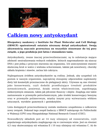 Całkiem nowy antyoksydant Hiszpańscy naukowcy z Institute for Plant Molecular and Cell Biology (IBMCP) opatentowali ostatnio nieznany dotąd antyoksydant. Swoją aktywnością znacznie przewyższa on wszystkie stosowane do tej pory związki, a jego produkcja jest łatwa i stosunkowo tania. Antyoksydanty, zwane inaczej przeciwutleniaczami, są to substancje mające zdolność neutralizowania wolnych rodników, których nagromadzenie się niszczy DNA i jest jedną z przyczyn starzenia się organizmu. Ich unieczynnienie stanowi skuteczną broń w walce z wieloma schorzeniami, takimi jak nowotwory, choroby układu krążenia i stawów, zaćma lub cukrzyca. Najbogatszym źródłem antyoksydantów są rośliny. Jednak, aby uzupełnić ich poziom w naszym organizmie, najczęściej stosujemy odpowiednie suplementy diety lub kosmetyki przeznaczone do pielęgnacji skóry. Używane są one również jako konserwanty, czyli dodatki przedłużające trwałość produktów żywnościowych, ponieważ, dzięki swoim właściwościom, zapobiegają niekorzystnym zmianom, takim jak jełczenie tłuszczy i olejów. Znajdują one także zastosowanie w przemyśle petrochemicznym, jako środek konserwujący benzynę oraz w przemyśle polimerowym, między innymi przy wytwarzaniu włókien sztucznych, wyrobów gumowych i geotekstyliów. Lista dostępnych przeciwutleniaczy została niedawno uzupełniona o całkowicie nowy związek. Dokonał tego zespół badaczy z IBMCP należącego do Politechniki w Walencji (UPV) oraz Hiszpańskiego National Research Council (CSIC). Nowoodkryty składnik jest aż 14 razy silniejszy od resweratrolu, czyli popularnego antyoksydantu znajdującego się w czerwonym winie. Jest on również 4,5 razy skuteczniejszy niż witamina E i 10 razy silniejszy niż witamina C. Aż do tej pory pozostawał jednak kompletnie nieznany, a to dlatego, że występuje jedynie w pomidorach wystawionych na działanie stresu biotycznego. Niekorzystne działanie czynników pochodzących z przyrody ożywionej, takie jak nadmierne zagęszczenie, pasożytnictwo lub choroby infekcyjne, wywołuje w roślinach mechanizmy obronne polegające na produkcji przeróżnych związków fenolowych. Jednym z nich jest właśnie nowoodkryty przeciwutleniacz. Aby go wyprodukować nie trzeba jednak stresować żadnych roślin. Naukowcy opracowali już prostą i ekonomiczną metodę chemicznej syntezy, którą z powodzeniem można przeprowadzić w warunkach laboratoryjnych. Zapewniają także, że nowoodkryty związek jest już gotowy do wprowadzenia na rynek. Hiszpańscy naukowcy opatentowali ostatnio nieznany dotąd antyoksydant Literatura: A Novel and Potent Antioxidant Found in Tomato Plants, Initial Results Suggest; ScienceDaily, 22 lipca 2011; María Pilar López-Gresa, Cristina Torres, Laura Campos, Purificación Lisón, Ismael Rodrigo, José María Bellés, Vicente Conejero. Identification of defence metabolites in tomato plants infected by the bacterial pathogen Pseudomonas syringae. Environmental and Experimental Botany, 2011. Data publikacji: 06.08.2011r.