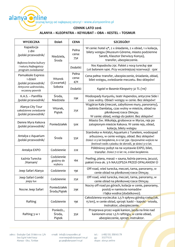 CENNIK LATO 2016 ALANYA – KLEOPATRA – KEYKUBAT – OBA – KESTEL – TOSMUR WYCIECZKA Kapadocja 2 dni /polski przewodnik/ Bajkowa kraina kultury i natury.Najbogatszy program zwiedzania! Pamukkale Express 1 dzień /polski przewodnik/ Antyczne uzdrowisko, wczesny powrót K.A.S. – Pamfilia /polski przewodnik/ Dzień Niedziela, Środa Wtorek (Czwartek) Sobota CENA SZCZEGÓŁY Pełna cena: 75€ W cenie: hotel 4*, 2 x śniadanie, 2 x obiad, 1 x kolacja, bilety wstępu (Muzeum Göreme, miasto podziemne Saratlı, Klasztor Derwiszy Konya), transfer, ubezpieczenie. Dodatki: Noc Kapadocka 25€. Pakiet z nocą turecką: 99€ Lot balonem 140€. Przy wcześniejszej rezerwacji: 130€ Pełna cena: 47€ Cena pełna: transfer, ubezpieczenie, śniadanie, obiad, bilet wstępu, zwiedzanie meczetu. Bez sklepów! Dodatki: Kąpiel w Basenie Kleopatry 32 TL (11€) Środa, Niedziela 29€ Wtorek, Piątek 25€ Demre Myra Kekova /polski przewodnik/ Poniedziałek 50€ Antalya z Aquarium /polski przewodnik/ Środa 55€ Antalya EXPO Codziennie 22€ Półdniowy pobyt na na wystawie EXPO, bilet, transfer. Dzieci 7-12 lat 11€, 0-6lat bezpłatnie. Łaźnia Turecka /Hamam/ Codziennie godziny do wyboru 16€ Peeling, piana, masaż + sauna, łaźnia parowa, jacuzzi, pakiet trwa ok. 3 h NAJLEPSZA PRZED OPALANIEM Jeep Safari Alanya Codziennie 19€ Codziennie 25€ Nocne Jeep Safari Poniedziałek Środa,Piątek 29€ Rafting Codziennie 19€ Rafting 3 w 1 Poniedz., Środa, Piątek 35€ Alanya City Tour całodzienne zwiedzanie /polski przewodnik/ Jeep Safari Combi jeepy lux Wodospady Kurşunlu, teatr Aspendos, antyczne Side i czas wolny. Obiad i wstępy w cenie. Bez sklepów! Wzgórze Kale (meczet, zabytkowe mury, panoramy), Jaskinia Damlataş, czas wolny w mieście, obiad na piknikowej rzece Dimçay. W cenie: obiad, wstęp do jaskini. Bez sklepów! Miasto Św. Mikołaja, grobowce w Myrze, rejs po zatopionym mieście Kekova. W cenie rejs, obiad, kolacja, bilety wstępu Starówka w Antalyi, Aquarium z Tunelem, wodospad arbuzowy, w cenie wstępy, obiad. Bez sklepów! Dzieci: 0-5 lat bezpłatnie, 6-12 lat 39€. Opcjonalnie wejście na festiwal rzeźb z piasku: 6€ dorośli, 3€ dzieci 3-12 lat. Off road, wieś turecka, meczet, tama, panoramy, w cenie obiad na piknikowej rzece Dimçay. Off road, wieś turecka, meczet, tama, panoramy, w cenie obiad na piknikowej rzece Dimçay. Nocny off road po górach, kolacja w cenie, panoramy, postój w namiocie nomadów i fajka wodna (dodatkowo). Całodzienna wycieczka: 2,5 h spływu górską rzeką (ok. 15 km), w cenie obiad, sprzęt: kaski – kapoki - wiosła, instruktor, ubezpieczenie. Przeprawa przez wąski kanion, jazda na linie nad kanionem oraz 1,5 h raftingu, w cenie obiad, ubezpieczenie, sprzęt, instruktor. Godz. 16.30-20.00 Codziennie 10€ Paralotniarstwo Codziennie 70€ Sapadere Kanion + wieś turecka Wtorek, Czwartek, Sobota 25€ Wtorek 29€ Poniedziałek 49€ Alanya Panorama /bez sklepów/ Panoramiczny objazd Alanyi, wzgórze Kale (meczet i mury, panoramy), taras widokowy na górach Taurus, jaskinia Damlataş - dodatkowo 2,5€ Lot paralotnią w tandemie, lądowanie na plaży Kleopatry, osoba towarzysząca 15€ (cena dla dziecka równa cenie osoby dorosłej) Jeepem Sapadere Kanion i wieś turecka Busem /polski przewodnik/ Tlos – Wąwóz Saklikent /polski przewodnik/ Delfinarium – pokaz delfinów Codziennie 2 x dziennie 29€ Rejs morski ze snorkowaniem Codziennie 30€ Rejs morski piracki Codziennie 15€ Rejs po Zielonym Kanionie Poniedz., Środa, Piątek 40€ Nurkowanie Codziennie 40€ Poranne łowienie ryb - FISHING Do uzgodnienia 55€ Codziennie lub 30€ Stambuł 1 dzień /samolotem, polski przewodnik/ Stambuł 2 dni /samolotem, polski przewodnik/ Quad Safari Wynajem samochodów Trekking po wąwozie Saklıkent, starożytne miasto Tlos, piknik na wodzie. Obiad i wstępy w cenie. Godzinny pokaz delfinów i fok. Pokazy rano lub po południu, wtorek tylko rano. Cena dla dzieci: 0-3 lat bezpłatnie, 4-9 lat 25€ Pływanie z delfinem: 120€, foką 60€ za osobę (niezależnie od wieku). 5-godzinny rejs statkiem: snorkowanie, podglądanie żółwi morskich, kąpiele, obiad w cenie. Kilkugodzinny rejs wzdłuż wybrzeża; obiad i napoje bezalkoholowe w cenie. Relaksujący rejs po zachwycającym Zielonym Kanionie, w cenie obiad, napoje bezalkoholowe Dla początkujących lub zaawansowanych: 2 zejścia pod wodę; instruktaż w j. polskim W cenie obiad, sprzęt, ubezpieczenie. Wycieczka prywatna. Wczesne poranne łowienie ryb na morzu, w cenie sprzęt wędkarski, śniadanie. (cena dla dziecka równa cenie osoby dorosłej) 27€ Aquapark Zwiedzanie Kanionu Sapadere, wieś, meczet, w cenie obiad, wstęp. Jaskinia Skrzatów dodatkowo 3€ dla chętnych Zwiedzanie Kanionu Sapadere, wieś turecka, meczet, w cenie obiad, wstęp. Jaskinia Skrzatów dodatkowo 3€ dla chętnych. Do uzgodnienia 199€ Do uzgodnienia 265€ Codziennie 30/35€ Waterplanet: Wstęp i napoje w cenie biletu. Dzieci 0-4 bezpłatnie, 4-9 lat – cena 22€ Eftalia Island: Wstęp i all inclusive w cenie biletu Dzieci: 0-4 bezpłatnie, 4-9 lat – 25€ Zwiedzanie największych zabytków Stambułu. Przelot, transfer, polski przewodnik, obiad w cenie. Dodatkowo płatne wstępy. Dziecko 0-2 lata 50€, 3-12 120€ Zwiedzanie Stambułu, nocleg w hotelu 3*, wyżywienie HB. Przelot, transfer, polski przewodnik, dodatkowo wstępy. Dziecko 0-2 lata 50€, 3-12 lat 170€ 2-3 godzinny off road quadami na specjalnie przygotowanej trasie. Quady 1 lub 2-osobowe. Nowe klimatyzowane auta osobowe od 35€/dobę, oraz możliwość wynajęcia auta lub minibusa z kierowcą na wybraną trasę. Dzieci: 0-6 lat bezpłatnie, bez gwarantowanego miejsca w autobusie, 7-12 lat połowa ceny, powyżej pełna cena. Nie dotyczy niektórych wycieczek – cenniki powyżej. Wycieczki są ubezpieczone, piloci posiadają wymagane licencje, pojazdy są nowe i klimatyzowane. SMS SERWIS +90 537 434 94 77 – prosimy pod