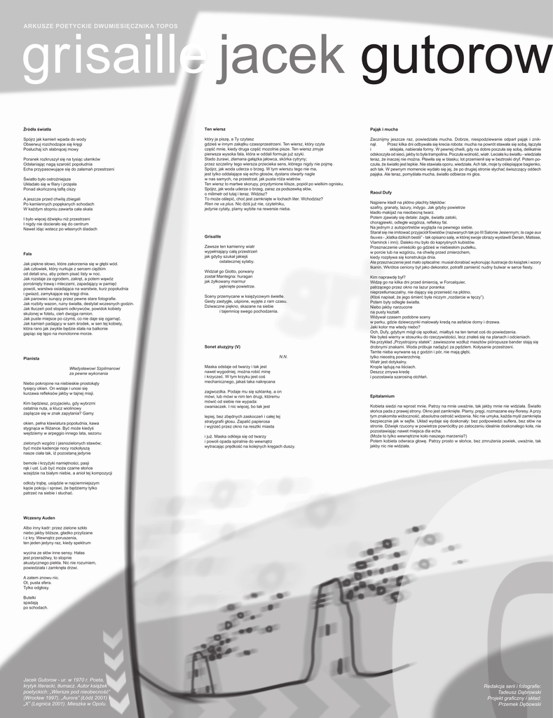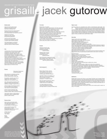 grisaille jacek gutorow Arkusze poetyckie dwumiesięcznika Topos Źródła światła Ten wiersz Pająk i mucha Spójrz jak kamień wpada do wody Obserwuj rozchodzące się kręgi Posłuchaj ich słabnącej mowy który ja piszę, a Ty czytasz gdzieś w innym zakątku czasoprzestrzeni. Ten wiersz, który czyta część mnie, kiedy druga część mozolnie pisze. Ten wiersz zmyje pierwsza wysoka fala, która w oddali formuje już szyki. Stado żurawi, złamana gałązka jałowca, skórka cytryny; przez szczeliny tego wiersza przecieka sens, którego nigdy nie pojmę. Spójrz, jak woda uderza o brzeg. W tym wierszu tego nie ma, jest tylko oddalające się echo głosów, dystans otwarty nagle w nas samych, na przestrzał, jak pusta róża wiatrów. Ten wiersz to martwe skorupy, przydymione klisze, popiół po wielkim ognisku. Spójrz, jak woda uderza o brzeg, zaraz za podszewką słów, o milimetr od tutaj i teraz. Widzisz? To może oślepić, choć jest zamknięte w lochach liter. Wchodzisz? Rien ne va plus. Nic dziś już nie, czytelniku, jedynie cytaty, plamy wybite na rewersie nieba. Zacznijmy jeszcze raz, powiedziała mucha. Dobrze, niespodziewanie odparł pająk i zniknął. Przez kilka dni odbywała się krecia robota: mucha na powrót stawała się sobą, łączyła i sklejała, nabierała formy. W pewnej chwili, gdy na dobre poczuła się sobą, delikatnie odskoczyła od sieci, jakby to była trampolina. Poczuła wolność, wiatr. Leciała ku światłu - wiedziała teraz, że inaczej nie można. Pławiła się w blasku; lot przemienił się w beztroski dryf. Potem poczuła, że światło jest lepkie. Nie stawiała oporu, wiedziała. Ach tak, moje ty oślepiające bagienko, ach tak. W pewnym momencie wydało się jej, że po drugiej stronie słychać świszczący oddech pająka. Ale teraz, pomyślała mucha, światło odbierze mi głos. Poranek rozkruszył się na tysiąc ułamków Odsłaniając nagą szarość popołudnia Echa przypasowujące się do załamań przestrzeni Światło było ostrożniejsze Układało się w filary i przęsła Ponad skończoną taflą ciszy A jeszcze przed chwilą zbiegali Po kamiennych popękanych schodach W każdym stopniu zawarta cała skala I było więcej dźwięku niż przestrzeni I nigdy nie docierało się do centrum Nawet idąc wstecz po własnych śladach Grisaille Fala Jak piękne słowo, które zakorzenia się w głębi wód. Jak człowiek, który nurkuje z sercem ciężkim od detali snu, aby potem pisać listy w noc. Jak rozstaje za ogrodem, zakręt, a potem wąwóz porośnięty trawą i mleczami, zapadający w pamięć powoli, warstwa osiadająca na warstwie, kurz popołudnia i gwiazd, zamykające się kręgi dnia. Jak parowiec sunący przez pewne stare fotografie. Jak rozbity wazon, ruiny światła, destylat wczesnych godzin. Jak tłuczeń pod stopami odkrywców, powidok kobiety skulonej w fotelu, cień dwojga ramion. Jak puste miejsce po czymś, co nie daje się ogarnąć. Jak kamień padający w sam środek, w sen tej kobiety, która rano jak zwykle będzie stała na balkonie gapiąc się tępo na monotonne morze. Zawsze ten kamienny wiatr wypełniający całą przestrzeń jak gdyby szukał jakiejś ostatecznej sylaby. Widział go Giotto, porwany został Mantegna: huragan jak żyłkowany marmur pęknięte powietrze. Sceny przemycane w księżycowym świetle. Gesty zastygłe, uśpione, wyjęte z ram czasu. Dziwaczne piękno, skazane na siebie i tajemnicę swego pochodzenia. Sonet aluzyjny (V) Pianista Władysławowi Szpilmanowi za pewne wykonania Niebo pokrojone na niebieskie prostokąty tysięcy okien. On wstaje i unosi się kurzawa refleksów jakby w tajnej misji. Kim będziesz, przyjacielu, gdy wybrzmi ostatnia nuta, a klucz wiolinowy zaplącze się w znak zapytania? Gamy okien, pełna klawiatura popołudnia, kawa stygnąca w filiżance. Być może kiedyś wejdziemy w arpeggio innego lata, sezonu zielonych wzgórz i jasnozielonych stawów; być może kadencje nocy rozkołyszą nasze ciała tak, iż pozostaną jedynie N.N. Maska odstaje od twarzy i tak jest nawet wygodniej, można robić minę i krzyczeć. W tym krzyku jest coś mechanicznego, jakaś taka nakręcana zagwozdka. Podaje mu się szklankę, a on mówi, lub mówi w nim ten drugi, któremu mówić od siebie nie wypada: cwaniaczek. I nic więcej, bo tak jest lepiej, bez zbędnych zaskoczeń i całej tej stratygrafii głosu. Zapalić papierosa i wyjrzeć przez okno na resztki miasta i już. Maska odkleja się od twarzy i powoli opada spiralnie do wewnątrz wytracając prędkość na kolejnych kręgach duszy. Raoul Dufy Najpierw kładł na płótno płachty błękitów: szafiry, granaty, lazury, indygo. Jak gdyby powietrze kładło makijaż na nieobecną twarz. Potem zjawiały się detale: żagle, światła zatoki, chorągiewki, odległe wzgórza, refleksy fal. Na jednym z autoportretów wygląda na pewnego siebie. Starał się nie imitować przyjaciół fowistów (nazwanych tak po III Salonie Jesiennym; la cage aux fauves - „klatka dzikich bestii” - tak opisano salę, w której swoje obrazy wystawili Derain, Matisse, Vlaminck i inni). Daleko mu było do kapryśnych kubistów. Przeznaczenie umieściło go gdzieś w niebieskim pudełku, w porcie lub na wzgórzu, na chwilę przed zmierzchem, kiedy rozpływa się konstrukcja dnia. Ale przeznaczenie jest mało opłacalne: musiał dorabiać wykonując ilustracje do książek i wzory tkanin. Wkrótce ceniony był jako dekorator, potrafił zamienić nudny bulwar w serce fiesty. Kim naprawdę był? Widzę go na kilka dni przed śmiercią, w Forcalquier, patrzącego przez okno na lazur poranka: nieprzetłumaczalny, nie dający się przenieść na płótno. (Ktoś napisał, że jego śmierć była niczym „rozdarcie w tęczy”). Potem były odległe światła. Niebo jakby narzucone na pusty kształt. Widywał czasem podobne sceny w parku, gdzie dziewczynki malowały kredą na asfalcie domy i drzewa. Jaki kolor ma wtedy niebo? Och, Dufy