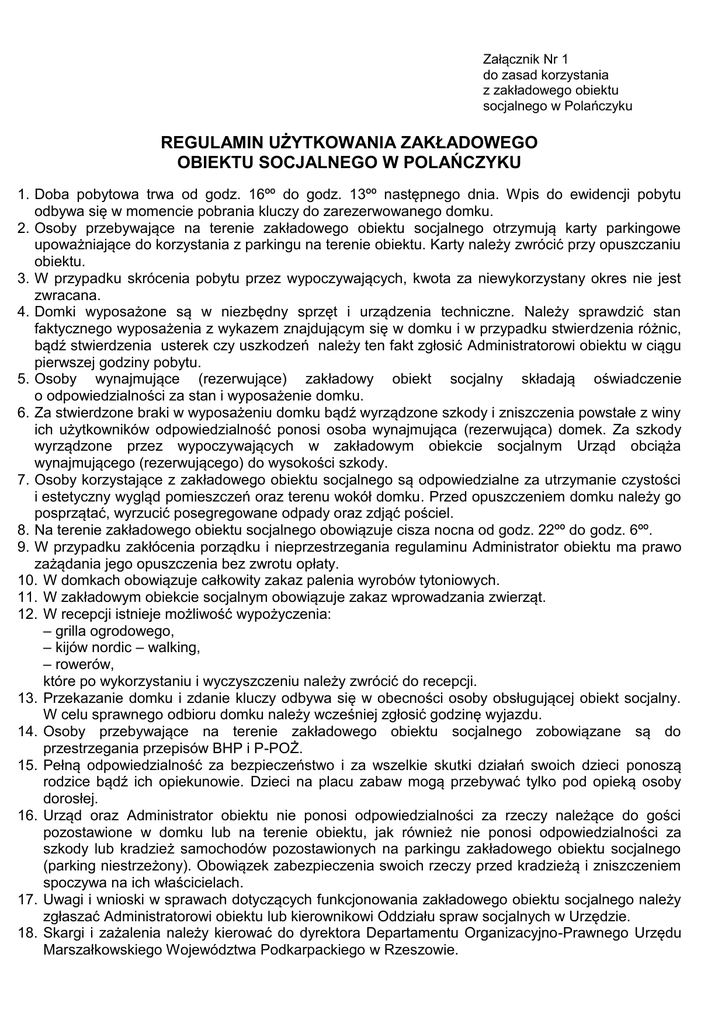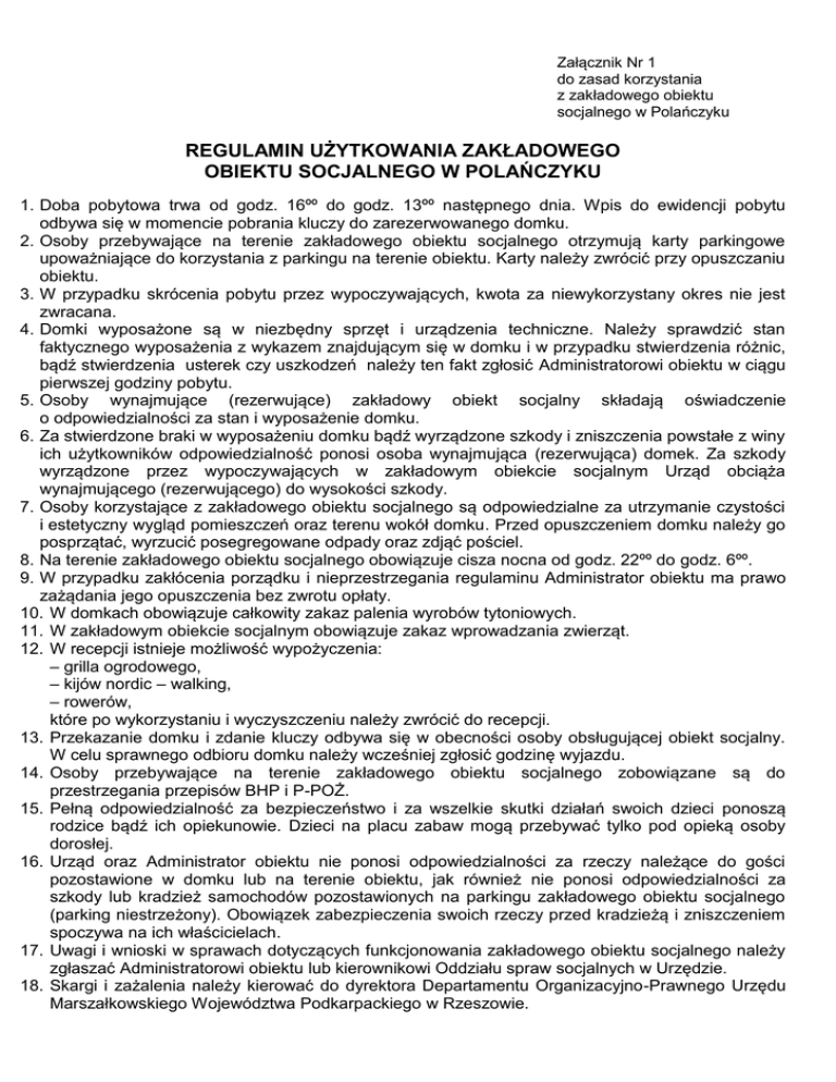 Załącznik Nr 1 do zasad korzystania z zakładowego obiektu socjalnego w Polańczyku REGULAMIN UŻYTKOWANIA ZAKŁADOWEGO OBIEKTU SOCJALNEGO W POLAŃCZYKU 1. Doba pobytowa trwa od godz. 16ºº do godz. 13ºº następnego dnia. Wpis do ewidencji pobytu odbywa się w momencie pobrania kluczy do zarezerwowanego domku. 2. Osoby przebywające na terenie zakładowego obiektu socjalnego otrzymują karty parkingowe upoważniające do korzystania z parkingu na terenie obiektu. Karty należy zwrócić przy opuszczaniu obiektu. 3. W przypadku skrócenia pobytu przez wypoczywających, kwota za niewykorzystany okres nie jest zwracana. 4. Domki wyposażone są w niezbędny sprzęt i urządzenia techniczne. Należy sprawdzić stan faktycznego wyposażenia z wykazem znajdującym się w domku i w przypadku stwierdzenia różnic, bądź stwierdzenia usterek czy uszkodzeń należy ten fakt zgłosić Administratorowi obiektu w ciągu pierwszej godziny pobytu. 5. Osoby wynajmujące (rezerwujące) zakładowy obiekt socjalny składają oświadczenie o odpowiedzialności za stan i wyposażenie domku. 6. Za stwierdzone braki w wyposażeniu domku bądź wyrządzone szkody i zniszczenia powstałe z winy ich użytkowników odpowiedzialność ponosi osoba wynajmująca (rezerwująca) domek. Za szkody wyrządzone przez wypoczywających w zakładowym obiekcie socjalnym Urząd obciąża wynajmującego (rezerwującego) do wysokości szkody. 7. Osoby korzystające z zakładowego obiektu socjalnego są odpowiedzialne za utrzymanie czystości i estetyczny wygląd pomieszczeń oraz terenu wokół domku. Przed opuszczeniem domku należy go posprzątać, wyrzucić posegregowane odpady oraz zdjąć pościel. 8. Na terenie zakładowego obiektu socjalnego obowiązuje cisza nocna od godz. 22ºº do godz. 6ºº. 9. W przypadku zakłócenia porządku i nieprzestrzegania regulaminu Administrator obiektu ma prawo zażądania jego opuszczenia bez zwrotu opłaty. 10. W domkach obowiązuje całkowity zakaz palenia wyrobów tytoniowych. 11. W zakładowym obiekcie socjalnym obowiązuje zakaz wprowadzania zwierząt. 12. W recepcji istnieje możliwość wypożyczenia: – grilla ogrodowego, – kijów nordic – walking, – rowerów, które po wykorzystaniu i wyczyszczeniu należy zwrócić do recepcji. 13. Przekazanie domku i zdanie kluczy odbywa się w obecności osoby obsługującej obiekt socjalny. W celu sprawnego odbioru domku należy wcześniej zgłosić godzinę wyjazdu. 14. Osoby przebywające na terenie zakładowego obiektu socjalnego zobowiązane są do przestrzegania przepisów BHP i P-POŻ. 15. Pełną odpowiedzialność za bezpieczeństwo i za wszelkie skutki działań swoich dzieci ponoszą rodzice bądź ich opiekunowie. Dzieci na placu zabaw mogą przebywać tylko pod opieką osoby dorosłej. 16. Urząd oraz Administrator obiektu nie ponosi odpowiedzialności za rzeczy należące do gości pozostawione w domku lub na terenie obiektu, jak również nie ponosi odpowiedzialności za szkody lub kradzież samochodów pozostawionych na parkingu zakładowego obiektu socjalnego (parking niestrzeżony). Obowiązek zabezpieczenia swoich rzeczy przed kradzieżą i zniszczeniem spoczywa na ich właścicielach. 17. Uwagi i wnioski w sprawach dotyczących funkcjonowania zakładowego obiektu socjalnego należy zgłaszać Administratorowi obiektu lub kierownikowi Oddziału spraw socjalnych w Urzędzie. 18. Skargi i zażalenia należy kierować do dyrektora Departamentu Organizacyjno-Prawnego Urzędu Marszałkowskiego Województwa Podkarpackiego w Rzeszowie. 19. Na wniosek zainteresowanych, Urząd wystawia faktury VAT w terminie 7 dni od dnia dokonania wpłaty. Do wystawienia faktury VAT dla osób fizycznych wymagane jest podanie danych osobowych wraz z adresem. 20. W sprawach nieuregulowanych mają zastosowanie przepisy Kodeksu cywilnego.