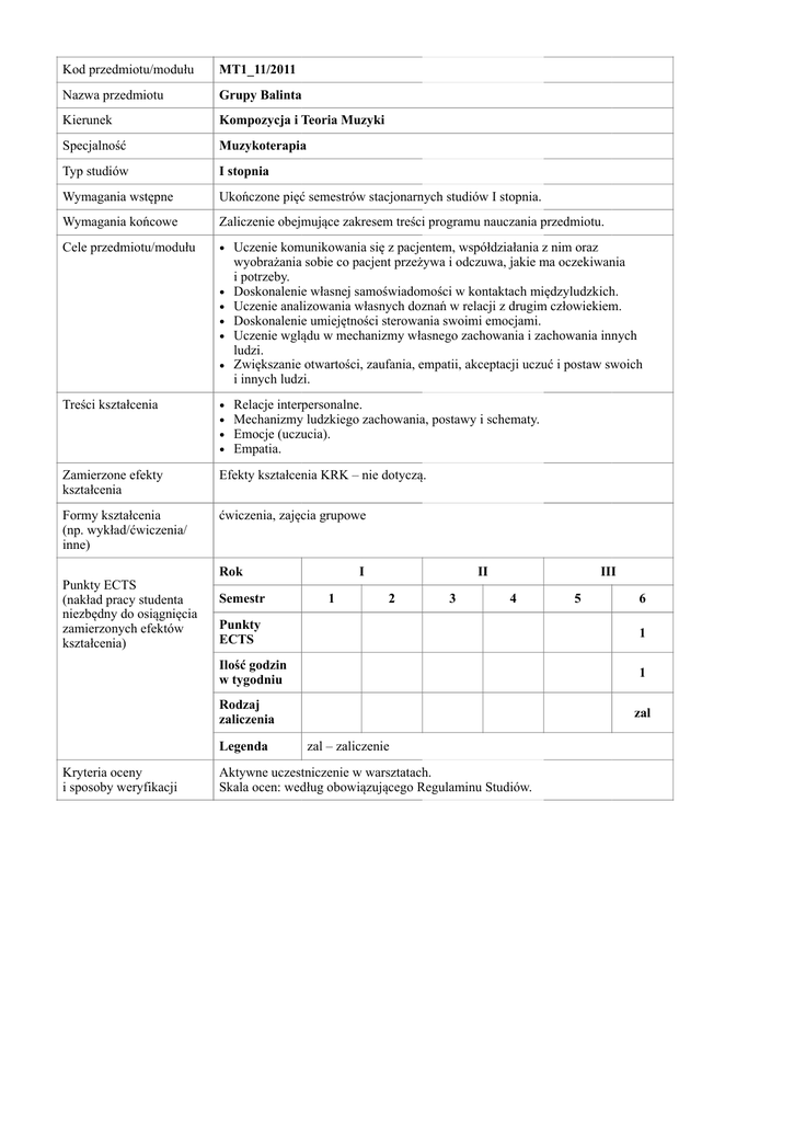 Kod przedmiotu/modułu MT1_11/2011 Nazwa przedmiotu Grupy Balinta Kierunek Kompozycja i Teoria Muzyki Specjalność Muzykoterapia Typ studiów I stopnia Wymagania wstępne Ukończone pięć semestrów stacjonarnych studiów I stopnia. Wymagania końcowe Zaliczenie obejmujące zakresem treści programu nauczania przedmiotu. Cele przedmiotu/modułu • Uczenie komunikowania się z pacjentem, współdziałania z nim oraz • • • • • wyobrażania sobie co pacjent przeżywa i odczuwa, jakie ma oczekiwania i potrzeby. Doskonalenie własnej samoświadomości w kontaktach międzyludzkich. Uczenie analizowania własnych doznań w relacji z drugim człowiekiem. Doskonalenie umiejętności sterowania swoimi emocjami. Uczenie wglądu w mechanizmy własnego zachowania i zachowania innych ludzi. Zwiększanie otwartości, zaufania, empatii, akceptacji uczuć i postaw swoich i innych ludzi. Treści kształcenia • • • • Zamierzone efekty kształcenia Efekty kształcenia KRK – nie dotyczą. Formy kształcenia (np. wykład/ćwiczenia/ inne) ćwiczenia, zajęcia grupowe ! Punkty ECTS (nakład pracy studenta niezbędny do osiągnięcia zamierzonych efektów kształcenia) Relacje interpersonalne. Mechanizmy ludzkiego zachowania, postawy i schematy. Emocje (uczucia). Empatia. Rok Semestr I 1 II 2 3 III 4 6 Punkty ECTS 1 Ilość godzin w tygodniu 1 Rodzaj zaliczenia Legenda Kryteria oceny i sposoby weryfikacji 5 zal zal – zaliczenie Aktywne uczestniczenie w warsztatach. Skala ocen: według obowiązującego Regulaminu Studiów. Literatura • • • • • • • • • • Balint M., Die Urformen der Liebe und die Technik der Psychoanalise, Fischer, Frankfurt 1969. Balint M., The doctor, his patent and the illness, Pitman, London 1965. Balint E., Norell J. S., Funf Minuten pro Patient Frankfurt 1975. Jugowar B., Adamski Z., Kształtowanie relacji student-pacjent przez propagowanie idei Michaela Balinta w nauczaniu studentów medycyny, NOWINY Lekarskie Medical News, Poznań 1997. Leder S., Brykczyńska C., Gawlikowska D., Wysocka T., Grupa Balinta - przegląd wybranych zagadnień, „Psychoterapia” 2 (101) 1997. Luban-Plozza B., Balint E., Patientenbezogene Medicin. Balint – Methode in der medizinischen Ausbildung, Fischer , Stuttgard, New York 1978. Luban-Plozza B., Dockhaut H. D., Praxis der Balint –Gruppen, Beziehungsdiagnostik und Therapie, Springer, Berlin, Heidelberg, New York 1984. Moreau A., Formation psychologique en medicine et groupe Balint, Nauwelaerts Edicion, Beauvechain 1990. Petzold.E., Der andere Weg zum Patienten. Gedanken zur Balint-Arbeit, Krankenhausarzt 1988. Petzold E., Uber den systematischen Zugang in der Balintarbeit. „Materialien zur Psychoanalyse” X, 1984. Język wykładowy polski Prowadzący dr Krystyna Kuchtyn Uwagi