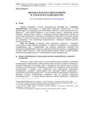 Źródło: Matejun M., Metoda badania przypadków w naukach o zarządzaniu, "Ekonomika i Organizacja Przedsiębiorstwa", nr 10/2011, s. 93-102. Marek Matejun* METODA BADANIA PRZYPADKÓW W NAUKACH O ZARZĄDZANIU [ Po więcej publikacji zapraszam na www.matejun.pl ] ■ Wstęp Badanie przypadków (metoda monograficzna) wywodzi się z podejścia idiograficznego stosowanego w społecznych badaniach jakościowych w celu gruntownego i wyczerpującego opisu konkretnego zdarzenia w sekwencji przyczynowoskutkowej198. Jako metoda badawcza, a więc zasadny, typowy i powtarzalny sposób zbierania, opracowywania, analizy i interpretacji danych empirycznych, służący do uzyskiwania maksymalnie i optymalnie uzasadnionych odpowiedzi na stawiane pytania badawcze199 może być użyteczna w pracach naukowych z zakresu zarządzania, wpisując się szczególnie w nurt metodologii interpretatywnej i indukcyjny charakter procesu poznania myślowego. Jako cel artykułu wyznaczono zatem prezentację możliwości i kierunków wykorzystania metody badania przypadków w naukach o zarządzaniu ze szczególnym uwzględnieniem zalet i mankamentów tego podejścia badawczego. Realizacji celu poświęcono przegląd literatury krajowej i zagranicznej dotyczącej tematu, z uwzględnieniem wyników badań wtórnych, a także przeprowadzono badania własne na próbie polskich naukowców prowadzących prace z wykorzystaniem metody monograficznej. ■ Rygory metodologiczne wykorzystania metody monograficznej w naukach o zarządzaniu Zwrócenie uwagi świata nauki na coraz bardziej złożone problemy zarządzania współczesnymi organizacjami wymaga dostosowania procesów poznania myślowego i metodyki badawczej do wymogów opisu i interpretacji tych zjawisk. Jest to również związane ze specyfiką nauk o zarządzaniu wyrażającą się stosunkowo niskim poziomem uniwersalizmu i trwałości praw naukowych, przy jednoczesnej konieczności uwzględniania czynników niemierzalnych oraz przewadze funkcji projekcyjnej i zapewnienia użyteczności praktycznej200. W tych warunkach odpowiedzią na złożoność i dynamikę wyzwań współczesnego zarządzania stają się postulaty eklektyzmu metodologicznego201, w ramach którego klasyczne metody indukcyjne i dedukcyjne * dr inż. Marek Matejun, Katedra Zarządzania, Wydział Organizacji i Zarządzania, Politechnika Łódzka. J.M. Ruane, Essentials of Research Methods: a Guide to Social Research, Blackwell Publishing, 2005, s. 76-77. 199 S. Nowak, Metodologia badań społecznych, PWN, Warszawa 2008, s. 22. 200 zob. szerzej: S. Sudoł, Nauki o zarządzaniu. Węzłowe problemy i kontrowersje, Wydawnictwo „Dom Organizatora”, Toruń 2007, s. 10-13. 201 Ł. Sułkowski, Epistemologia w naukach o zarządzaniu, PWE, Warszawa 2005, s. 106-108. 198 93 Źródło: Matejun M., Metoda badania przypadków w naukach o zarządzaniu, "Ekonomika i Organizacja Przedsiębiorstwa", nr 10/2011, s. 93-102. wspierane są aplikacjami praktycznymi oraz interpretacjami metaforycznymi. Prowadzi to do wzrostu zainteresowania badaniami jakościowymi202, w ramach których użytecznym podejściem staje się metoda badania przypadków. Jako studia przypadków określa się szczegółowe, holistyczne prace empiryczne prowadzone na złożonych obiektach, w ramach których kładzie się szczególny nacisk na pogłębione analizy jednostkowe prowadzone bez stosowania kontroli manipulacyjnej, w określonym kontekście sytuacyjnym, w ramach których wykorzystuje się różnorodne źródła danych i szczegółowe metody badawcze203. Studia przypadków można rozpatrywać zarówno w ujęciu procesowym, ale również jako przedmiot albo jako wynik badania, przy jednoczesnym uwzględnieniu takich cech charakterystycznych, jak: ograniczony charakter podmiotowy, osadzenie rozważań w szerszym kontekście zdarzeń, wielowymiarowość analizowanych zmiennych, interdyscyplinarność oraz polimetodyczność204. Mimo pewnej krytyki naukowego wykorzystania metody monograficznej205 studia przypadków mogą pełnić użyteczną rolę nie tylko w poznawaniu i interpretowaniu złożoności organizacyjnej, ale również w rozwoju teorii zarządzania, na co wskazują ujęcia poszczególnych autorów, przedstawione w tabeli nr 1. Wykorzystanie metody badania przypadków w naukach o zarządzaniu wiąże się z zachowaniem odpowiednich rygorów metodologicznych i przyjęciem właściwej metodyki badań. Jeden z kluczowych problemów stanowi tu dobór przypadków, obejmujący decyzję o wielkości próby i sposobie doboru elementów. Po tym etapie następuje gromadzenie danych, którego atut stanowi adekwatna polimetodyczność badawcza. Po przeprowadzonych pogłębionych analizach intepretacyjnych nastąpić może sformułowanie wniosków na pewnym poziomie uogólnienia, co wraz z konfrontacją z literaturą światową pozwala na wniesienie nowego wkładu w istniejącą wiedzę206. Istnieje wiele kryteriów oceny poprawności metodologicznej prac badawczych prowadzonych z wykorzystaniem metody badania przypadków. W badaniach207 przeprowadzonych na zbiorze 159 studiów przypadku organizacji komercyjnych opublikowanych w latach 1995-2000 w 10 wiodących czasopismach z zakresu 202 R. Bansal, K. Corley, The Coming of Age for Qualitative Research: Embracing the Diversity of Qualitative Methods, “Academy of Management Journal", Vol. 54, nr 2/2011. 203 H. Ridder, Ch. Hoon, A. McCandless, The Theoretical Contribution of Case Study Research to the Field of Strategy and Management, [w:] Bergh D.D., Ketchen D.J. (red.), Research Methodology in Strategy and Management, Vol 5, Emerald Group Publishing, Bingley 2009, s. 138. 204 A.D. Ellinger, K.E. Watkins, V.J. Marsick, Case Study Research Methods, [w:] Swanson R.A., Holton E.F. (red.), Research in Organizations: Foundations and Methods of Inquiry, Berrett-Koehler Publishers, San Francisco 2005, s. 328-329. 205 zob. np. T. Vissak, Recommendations for Using the Case Study Method in International 