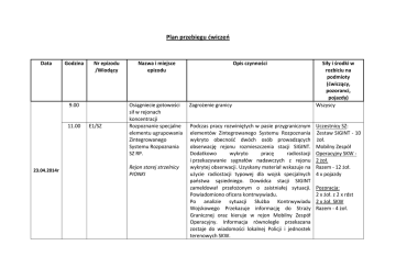 Plan przebiegu ćwiczeń Data Godzina Nr epizodu /Wiodący 9.00 11.00 23.04.2014r E1/SZ Nazwa i miejsce epizodu Osiągniecie gotowości sił w rejonach koncentracji Rozpoznanie specjalne elementu ugrupowania Zintegrowanego Systemu Rozpoznania SZ RP. Rejon starej strzelnicy PIONKI Opis czynności Zagrożenie granicy Podczas pracy rozwiniętych w pasie przygranicznym elementów Zintegrowanego Systemu Rozpoznania wykryto obecność dwóch osób prowadzących obserwację rejonu rozmieszczenia stacji SIGINT. Dodatkowo wykryto pracę radiostacji i przekazywanie sygnałów nadawczych z rejonu wykrytej obserwacji. Uzyskany materiał wskazuje na użycie radiostacji typowej dla wojsk specjalnych państwa sąsiedniego. Dowódca stacji SIGINT zameldował przełożonym o zaistniałej sytuacji. Powiadomiono oficera kontrwywiadu. Po analizie sytuacji Służba Kontrwywiadu Wojskowego Przekazuje informację do Straży Granicznej oraz kieruje w rejon Mobilny Zespół Operacyjny. Informacja równolegle przekazana zostaje do wiadomości lokalnej Policji i jednostek terenowych SKW. Siły i środki w rozbiciu na podmioty (ćwiczący, pozoranci, pojazdy) Wszyscy Uczestnicy SZ: Zestaw SIGINT - 10 żoł. Mobilny Zespół Operacyjny SKW 2 żoł. Razem - 12 żoł. 4 x pojazdy Pozoracja: 2 x żoł. z 2 x rdst 2 x żoł. SKW Razem - 4 żoł. Działanie SG. Komendant PSG Radomex wysyła w rejon znaku granicznego 0000 (wskazany przez SKW) patrol. Po przybyciu na miejsce patrol stwierdza w pasie drogi granicznej ślady przekroczenia granicy państwowej wbrew przepisom (pgpwp). Wariant 1 Patrol SG z psem tropiącym podejmuje ślad i w odległości około 3-4 km od miejsca przekroczenia granicy zatrzymuje dwie osoby. Funkcjonariusze SG ustalają przynależności ww. do jednostki specjalnej państwa sąsiedniego. Uczestnicy SG: 2-3 Wariant 2 funkcjonariuszy. Z uwagi na zaangażowanie psa tropiącego Pies służbowy – Komendant PSG Radomex występuje do Policji tropiący. o użyczenie przewodnika z psem tropiącym. Wspólny patrol SG i Policji przeprowadza przeszukiwanie terenu. Następuje zatrzymuje dwie osoby. Funkcjonariusze SG ustalają przynależności Uczestnicy Policja: ww. do jednostki specjalnej państwa sąsiedniego. 1 Policjant Po zatrzymaniu osoby są przekazane SKW. Pies tropiący 11.00 E2/SG Nielegalne przekroczenie granicy Dyżurny Operacyjny Placówki Straży Granicznej (DOP Uczestnicy SG: SG) otrzymał telefoniczną informację od służby 20 funkcjonariuszy dyżurnej strony sąsiedniej, że godzinę wcześniej 3 1PJN Lotnisko Radom- brama B-9 oraz teren przyległy poza strefą operacyjną lotniska km od linii granicy państwowej, w rejonie znaku granicznego 0000, została zauważona grupa 8 osób, które kierowały się w stronę granicy. DOP w rejon skierował patrole z zadaniem prowadzenia obserwacji terenu pod kątem wykrycia sprawców pgpwp. Funkcjonariusze pełniący służbę na PJN przekazali informację, że w rejonie znaku granicznego 0000 zauważyli grupę osób oddalającą się od linii granicy państwowej na kierunku do RP. Patrol na motocyklach potwierdził w tym rejonie ślady pgpwp. Skierowana w rejon grupa pościgowa ustaliła, że sprawcy pgpwp kierują się w stronę m. Janów skrajem Lasu Skaryszewskiego. W rejon prawdopodobnych kierunków odejścia grupy, skierowano patrol na motocyklach i patrol na pojazdach ATV z zadaniem prowadzenia rozpoznania terenu. DOP otrzymał informację od pracownika leśnego, o zauważeniu w lesie 4 mężczyzn ubranych w ubiór typu wojskowego (kamuflaż), które mogą posiadać niebezpieczne przedmioty. Osoby te kierowały się w kierunku drogi Skaryszew – Janów. Na wniosek Komendanta PSG, Komendant Oddziału skierował do działań siły pododdziału odwodowego (WZD). Funkcjonariusze pełniący służbę na PJN, zauważyli w rejonie znaku granicznego 0000 grupę 4 osób, która wyszła z kompleksu leśnego i kieruje się bezpośrednio na pojazd obserwacyjny. W ww. rejon skierowano patrol z samochodem, w celu zatrzymania sprawców pgpwp. Zatrzymane osoby 1 Land Rover 2 TRX 2 Motor 1 Śmigłowiec 1 Więźniarka 1 Pies służbowy Pozoranci: 10-15 osób (z SG) przewieziono do PSG. Mieszkaniec m. Skaryszew poinformował DOP, że przy swojej posesji był rozpytywany przez nn. osoby, poruszające się busem, o drogę w kierunku granicy państwa w rejonie m. Janów. Komendanta Oddziału skierował śmigłowiec dyżurny, w celu wykrycia sprawców pgpwp i ww. busa oraz grupę funkcjonariuszy WZD w rejon m. Janów, w celu zatrzymania ww. grupy. Pilot śmigłowca zgłosił DOP, że zauważył zaparkowanego busa i skierował w rejon patrol WZD do zatrzymania sprawców pgpwp. Trasa uciekającego pojazdu patrolowana jest przez śmigłowiec. Funkcjonariusze WZD podejmują próbę zatrzymania busa. W przypadku braku możliwości wykorzystania śmigłowca (warunki pogodowe) do wyżej opisanych działań, grupa wsparcia nie będzie brała udziału w ćwiczeniu, a samo zatrzymanie odbędzie się siłami funkcjonariuszy Wydziału Zabezpieczenia Działań wykonującymi działania w pojazdach. 11.00 E3/SG Awaryjne lądowanie śmigłowca Rejon Lasów Państwowych w Pionkach Działanie podgrywające SG. Około godz. 11. Patrol SG w rejonie znaku granicznego 0000 zauważył nisko przelatujący przez granicę obcy śmigłowiec lecący w kierunku XX. O zdarzeniu poinformował droga radiową Dyżurnego Operacyjnego Placówki SG (DOP). DOP informuje dyżurnego operacyjnego OSG, a ten Uczestnicy SG: Działanie aplikacyjne podegrane przez PSG Radomex oraz SDO OSG i KGSG. 12.30 E4/SZ Awaryjne lądowanie śmigłowca Rejon Lasów Państwowych w Pionkach 13.00 E5/PSP Awaryjne lądowanie śmigłowca Rejon Lasów Państwowych w Pionkach przekazuje informację do Regionalnego Ośrodka Dowodzenia i Naprowadzania oraz KGSG, która informuje DSO DORSZ. Lot śmigłowca wychwycił radar lotniska Radom i po kilku minutach zniknął z radaru w rejonie kompleksu leśnego. Prawdopodobnie doszło 