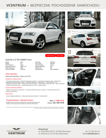 Audi Q5 2.0 TDI 190KM S-line Marka: Model: Rok Produkcji: Pojemność silnika : Kolor Nadwozia: Skrzynia biegów: Audi Q5 2015 1968 cm3 Biały Automat Przebieg : Moc silnika : Kolor Wnętrza: Rodzaj nadwozia: Ilość drzwi: Rodzaj paliwa: 9000 km 190 KM Czarny SUV 4/5 Olej napędowy OPIS POJAZDU: Dokument sprzedaży: Faktura Vat 23% Dodatkowe Wyposażenie ✓19-calowe felgi aluminiowe ✓Elementy dekoracyjne aluminiowe ✓Kierownica wykończona skórą ✓Klimatyzacja automatyczna sterowana elektronicznie ✓Komputer pokładowy ✓Napęd Quattro ✓Pakiet sportowy S-Line ✓Podgrzewane przednie fotele ✓Reflektory Bi-Xenonowe Aktywne ✓Spryskiwacze ciśnieniowe lamp ✓System Start/Stop ✓Światła do jazdy dziennej LED ✓Czujniki parkowania tył i przód ✓Sportowe fotele Systemy Bezpieczeństwa ✓System kontroli zjazdu ze wzniesienia ✓Poduszka powietrzna kierowcy i pasażera ✓Poduszki przednie boczne ✓Poduszki tylne boczne Multimedia ✓System nawigacji satelitarnej ✓Zestaw głośnomówiący Bluetooth ✓Zmieniarka 6CD FINANSOWANIE I UBEZPIECZENIA: Przykładowa rata miesięczna, wpłata 20%, okres leasingu/kredytu 48 miesięcy, 10% wykupu. Rata leasingu jest wartością netto bez vat. Rata: 2 689 Cena: 182 900 PLN PLN Niniejsza treść nie stanowi oferty w rozumieniu przepisów Kodeksu Cywilnego oraz opisu towaru ani zapewnienia w rozumieniu art. 4 Ustawy z dnia 27 lipca 2002r o szczególnych warunkach sprzedaży konsumenckiej. Powered by TCPDF (www.tcpdf.org)