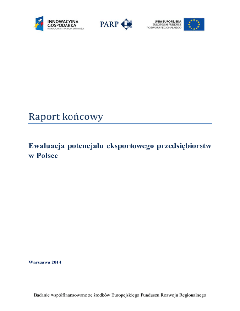 Raport końcowy Ewaluacja potencjału eksportowego przedsiębiorstw w Polsce Warszawa 2014 Badanie współfinansowane ze środków Europejskiego Funduszu Rozwoju Regionalnego Opracował zespół w składzie: Bogusław Plawgo Eliza Chilimoniuk-Przeździecka Tomasz Klimczak Adam Miller Patrycja Rumińska Współpraca merytoryczna: Anna Tarnawa Grzegorz Rzeźnik Robert Zakrzewski 2 Spis treści Spis treści ............................................................................................................................... 3 Słowniczek ............................................................................................................................. 6 Streszczenie ............................................................................................................................ 9 1. Umiędzynarodowienie polskiej gospodarki ................................................................. 27 2. Obraz działalności międzynarodowej polskich przedsiębiorstw na podstawie wyników badania ................................................................................................................................. 29 Polskie przedsiębiorstwa umiędzynarodowione na tle populacji ......................................... 29 Formy działalności międzynarodowej.................................................................................. 37 Eksporterzy i importerzy ...................................................................................................... 41 Charakterystyka ogólna ................................................................................................... 41 Kierunki eksportu i importu ............................................................................................. 43 Zróżnicowanie regionalne eksporterów i importerów ..................................................... 47 Zróżnicowanie branżowe eksporterów i importerów ....................................................... 51 Eksportowane i importowane wyroby .............................................................................. 56 Eksportowane i importowane usługi ................................................................................ 61 Płeć zarządzających firmami eksportującymi i importującymi........................................ 64 Przychody z eksportu i wydatki na import ....................................................................... 65 Branże dominujące w działalności eksportowej............................................................... 72 Współpraca w ramach kontraktów na poddostawy .............................................................. 76 Charakterystyka ogólna ................................................................................................... 76 Kierunki współpracy w ramach kontraktów na poddostawy ........................................... 78 Zróżnicowanie regionalne dostawców i odbiorców ......................................................... 79 Zróżnicowanie branżowe dostawców i odbiorców........................................................... 81 Eksportowane i importowane wyroby w ramach kontraktów na poddostawy ................. 82 Przychody z eksportu i wydatki na import w ramach kontraktów na poddostawy .......... 83 Płeć zarządzających firmami eksportującymi i importującymi w ramach kontraktów na poddostawy ....................................................................................................................... 84 Współpraca w ramach kontraktów na usługi outsourcingowe ............................................. 85 Współpraca w ramach umów licencyjnych .......................................................................... 85 Współpraca w ramach umów franczyzowych ...................................................................... 86 3 Współpraca w ramach kontraktów menedżerskich .............................................................. 86 Zagraniczne inwestycje bezpośrednie .................................................................................. 86 Branże dominujące w zagranicznych inwestycjach bezpośrednich ................................. 86 3. Uwarunkowania podejmowania i prowadzenia działalności międzynarodowej przez polskich przedsiębiorców ........................................................................................... 91 Atrakcyjność rynku zagranicznego związana z jego wysoką chłonnością .......................... 91 Strategie firmy nastawione na dywersyfikację rynku i/lub wzrost zyskowności................. 96 Warunki rynku krajowego związane z jego ograniczoną pojemnością oraz silną konkurencją .......................................................................................................................... 99 Międzynarodowa orientacja, doświadczenia i umiejętności kierownictwa i pracowników ............................................................................................................................................ 103 Cechy produktów/usług o wysokiej konkurencyjności w skali międzynarodowej ............ 104 Firmy wcześnie umiędzynarodowione ................................................................................ 111 Wykorzystanie pośredników .............................................................................................. 115 Ryzyko działalności międzynarodowej .............................................................................. 118 Koszty prowadzenia działalności międzynarodowej ......................................................... 126 Bariery kulturowe i językowe ............................................................................................ 133 Bariery formalno-prawne ................................................................................................... 135 Bariery polityczne ............................................................