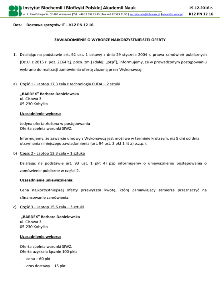 Instytut Biochemii i Biofizyki Polskiej Akademii Nauk 19.12.2016 r. ul. A. Pawińskiego 5a 02-106 Warszawa |Tel. +48 22 592 21 45 |Fax +48 22 529 21 90 | [email protected] |www.ibb.waw.pl K12 PN 12 16 Dot.: Dostawa sprzętów IT – K12 PN 12 16. ZAWIADOMIENIE O WYBORZE NAJKORZYSTNIEJSZEJ OFERTY 1. Działając na podstawie art. 92 ust. 1 ustawy z dnia 29 stycznia 2004 r. prawa zamówień publicznych (Dz.U. z 2015 r. poz. 2164 t.j. pózn. zm.) (dalej: „pzp”), informujemy, że w prowadzonym postępowaniu wybrano do realizacji zamówienia ofertę złożoną przez Wykonawcę: a) Część 1 - Laptop 17,3 cala z technologia CUDA – 2 sztuki „BARDEX” Barbara Danielewska ul. Cisowa 3 05-230 Kobyłka Uzasadnienie wyboru: Jedyna oferta złożona w postępowaniu Oferta spełnia warunki SIWZ. Informujemy, że zawarcie umowy z Wykonawcą jest możliwe w terminie krótszym, niż 5 dni od dnia otrzymania niniejszego zawiadomienia (art. 94 ust. 2 pkt 1 lit a) p.z.p.). b) Część 2 - Laptop 13,3 cala – 1 sztuka Działając na podstawie art. 93 ust. 1 pkt 4) pzp informujemy o unieważnieniu postępowania o zamówienie publiczne w części 2. Uzasadnienie unieważnienia: Cena najkorzystniejszej oferty przewyższa kwotę, którą Zamawiający zamierza przeznaczyć na sfinansowanie zamówienia. c) Część 3 - Laptop 15,6 cala – 3 sztuki „BARDEX” Barbara Danielewska ul. Cisowa 3 05-230 Kobyłka Uzasadnienie wyboru: Oferta spełnia warunki SIWZ. Oferta uzyskała łącznie 100 pkt: − cena – 60 pkt − czas dostawy – 15 pkt Instytut Biochemii i Biofizyki Polskiej Akademii Nauk 19.12.2016 r. ul. A. Pawińskiego 5a 02-106 Warszawa |Tel. +48 22 592 21 45 |Fax +48 22 529 21 90 | [email protected] |www.ibb.waw.pl K12 PN 12 16 − okres gwarancji – 25 pkt Informujemy, że zawarcie umowy z Wykonawcą jest możliwe w terminie nie krótszym, niż 5 dni od dnia otrzymania niniejszego zawiadomienia (art. 94 ust. 1 pkt 2 p.z.p.). d) Część 4 - Zestaw monitorów – 6 sztuk ANNCOMP I Sp. z o.o. ul. Słomiana 13 01-353 Warszawa Uzasadnienie wyboru: Jedyna oferta złożona w postępowaniu Oferta spełnia warunki SIWZ. Informujemy, że zawarcie umowy z Wykonawcą jest możliwe w terminie krótszym, niż 5 dni od dnia otrzymania niniejszego zawiadomienia (art. 94 ust. 2 pkt 1 lit a) p.z.p.). e) Część 5 - Komputer biurowy SFF – 2 sztuki KP-system Firma Inżynierska Katarzyna Przemyska ul. Kwiatowa 22B 05-500 Mysiadło Uzasadnienie wyboru: Oferta spełnia warunki SIWZ. Oferta uzyskała łącznie 98,31 pkt: − cena – 58,31 pkt − czas dostawy – 15 pkt − okres gwarancji – 25 pkt Informujemy, że zawarcie umowy z Wykonawcą jest możliwe w terminie nie krótszym, niż 5 dni od dnia otrzymania niniejszego zawiadomienia (art. 94 ust. 1 pkt 2 p.z.p.). f) Część 6 - Komputer do obliczeń średnich i wizualizacji – 2 sztuki „BARDEX” Barbara Danielewska ul. Cisowa 3 05-230 Kobyłka Uzasadnienie wyboru: Jedyna oferta złożona w postępowaniu Oferta spełnia warunki SIWZ. Instytut Biochemii i Biofizyki Polskiej Akademii Nauk 19.12.2016 r. ul. A. Pawińskiego 5a 02-106 Warszawa |Tel. +48 22 592 21 45 |Fax +48 22 529 21 90 | [email protected] |www.ibb.waw.pl K12 PN 12 16 Informujemy, że zawarcie umowy z Wykonawcą jest możliwe w terminie krótszym, niż 5 dni od dnia otrzymania niniejszego zawiadomienia (art. 94 ust. 2 pkt 1 lit a) p.z.p.). g) Część 7 - Komputer PC oraz zestaw mysz i klawiatura – 1 komplet Działając na podstawie art. 93 ust. 1 pkt 1) pzp informujemy o unieważnieniu postępowania o zamówienie publiczne w części 6. Uzasadnienie unieważnienia: Do dnia składania ofert nie złożono żadnej oferty niepodlegającej odrzuceniu. h) Część 8 - Router kablowy – 1 sztuka oraz okablowanie kategorii 5e – 9 sztuk Działając na podstawie art. 93 ust. 1 pkt 1) pzp informujemy o unieważnieniu postępowania o zamówienie publiczne w części 6. Uzasadnienie unieważnienia: Do dnia składania ofert nie złożono żadnej oferty niepodlegającej odrzuceniu. 2. W postępowaniu oferty złożyli również Wykonawcy: Punktacja Część Nazwa i adres Wykonawcy Cena Czas dostawy Okres gwarancji Łącznie 55,72 15 25 95,72 60 3 25 88 53,02 5 25 83,02 51,54 3 25 79,54 „BARDEX” Barbara Danielewska 2. ul. Cisowa 3 05-230 Kobyłka ANNCOMP I Sp. z o.o. 2. ul. Słomiana 13 01-353 Warszawa KP-system Firma Inżynierska Katarzyna Przemyska 2. ul. Kwiatowa 22B 05-500 Mysiadło ANNCOMP I Sp. z o.o. 3. ul. Słomiana 13 01-353 Warszawa Instytut Biochemii i Biofizyki Polskiej Akademii Nauk 19.12.2016 r. ul. A. Pawińskiego 5a 02-106 Warszawa |Tel. +48 22 592 21 45 |Fax +48 22 529 21 90 | [email protected] |www.ibb.waw.pl K12 PN 12 16 ANNCOMP I Sp. z o.o. 5. ul. Słomiana 13 01-353 Warszawa 60 3. W postępowaniu nie odrzucono ofert. 4. W postępowaniu nie wykluczono wykonawców. 9 16,67 85,67