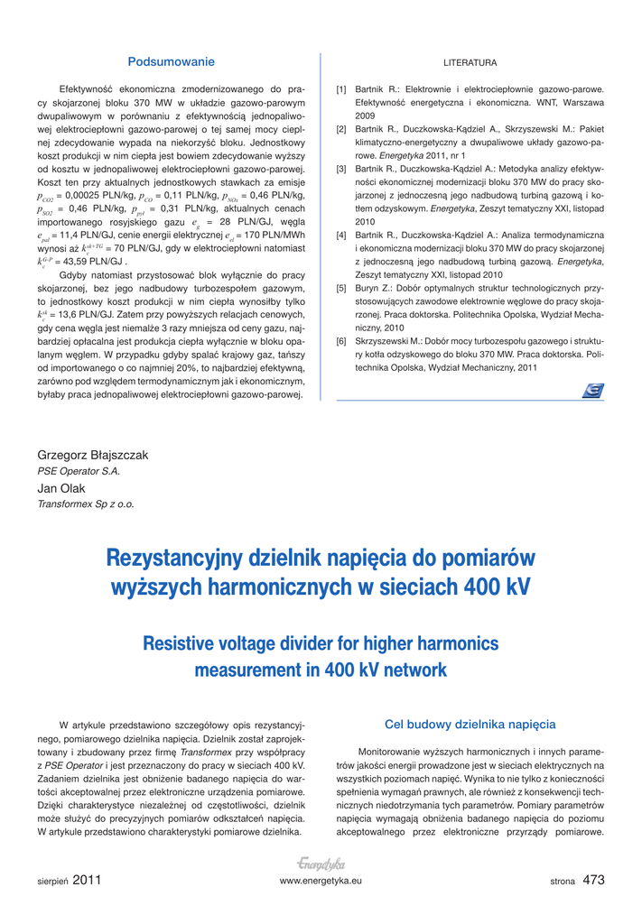 Podsumowanie LITERATURA Efektywność ekonomiczna zmodernizowanego do pracy skojarzonej bloku 370 MW w układzie gazowo-parowym dwupaliwowym w porównaniu z efektywnością jednopaliwowej elektrociepłowni gazowo-parowej o tej samej mocy cieplnej zdecydowanie wypada na niekorzyść bloku. Jednostkowy koszt produkcji w nim ciepła jest bowiem zdecydowanie wyższy od kosztu w jednopaliwowej elektrociepłowni gazowo-parowej. Koszt ten przy aktualnych jednostkowych stawkach za emisje pCO2 = 0,00025 PLN/kg, pCO = 0,11 PLN/kg, pNOx = 0,46 PLN/kg, pSO2 = 0,46 PLN/kg, ppył = 0,31 PLN/kg, aktualnych cenach importowanego rosyjskiego gazu eg = 28 PLN/GJ, węgla epal = 11,4 PLN/GJ, cenie energii elektrycznej eel = 170 PLN/MWh wynosi aż k csk+TG = 70 PLN/GJ, gdy w elektrociepłowni natomiast k cG-P = 43,59 PLN/GJ . Gdyby natomiast przystosować blok wyłącznie do pracy skojarzonej, bez jego nadbudowy turbozespołem gazowym, to jednostkowy koszt produkcji w nim ciepła wynosiłby tylko k csk = 13,6 PLN/GJ. Zatem przy powyższych relacjach cenowych, gdy cena węgla jest niemalże 3 razy mniejsza od ceny gazu, najbardziej opłacalna jest produkcja ciepła wyłącznie w bloku opalanym węglem. W przypadku gdyby spalać krajowy gaz, tańszy od importowanego o co najmniej 20%, to najbardziej efektywną, zarówno pod względem termodynamicznym jak i ekonomicznym, byłaby praca jednopaliwowej elektrociepłowni gazowo-parowej. [1] Bartnik R.: Elektrownie i elektrociepłownie gazowo-parowe. Efektywność energetyczna i ekonomiczna. WNT, Warszawa 2009 [2] Bartnik R., Duczkowska-Kądziel A., Skrzyszewski M.: Pakiet klimatyczno-energetyczny a dwupaliwowe układy gazowo-parowe. Energetyka 2011, nr 1 [3] Bartnik R., Duczkowska-Kądziel A.: Metodyka analizy efektywności ekonomicznej modernizacji bloku 370 MW do pracy skojarzonej z jednoczesną jego nadbudową turbiną gazową i kotłem odzyskowym. Energetyka, Zeszyt tematyczny XXI, listopad 2010 [4] Bartnik R., Duczkowska-Kądziel A.: Analiza termodynamiczna i ekonomiczna modernizacji bloku 370 MW do pracy skojarzonej z jednoczesną jego nadbudową turbiną gazową. Energetyka, Zeszyt tematyczny XXI, listopad 2010 [5] Buryn Z.: Dobór optymalnych struktur technologicznych przystosowujących zawodowe elektrownie węglowe do pracy skojarzonej. Praca doktorska. Politechnika Opolska, Wydział Mechaniczny, 2010 [6] Skrzyszewski M.: Dobór mocy turbozespołu gazowego i struktury kotła odzyskowego do bloku 370 MW. Praca doktorska. Politechnika Opolska, Wydział Mechaniczny, 2011 Grzegorz Błajszczak PSE Operator S.A. Jan Olak Transformex Sp z o.o. Rezystancyjny dzielnik napięcia do pomiarów wyższych harmonicznych w sieciach 400 kV Resistive voltage divider for higher harmonics measurement in 400 kV network W artykule przedstawiono szczegółowy opis rezystancyjnego, pomiarowego dzielnika napięcia. Dzielnik został zaprojektowany i zbudowany przez firmę Transformex przy współpracy z PSE Operator i jest przeznaczony do pracy w sieciach 400 kV. Zadaniem dzielnika jest obniżenie badanego napięcia do wartości akceptowalnej przez elektroniczne urządzenia pomiarowe. Dzięki charakterystyce niezależnej od częstotliwości, dzielnik może służyć do precyzyjnych pomiarów odkształceń napięcia. W artykule przedstawiono charakterystyki pomiarowe dzielnika. sierpień 2011 Cel budowy dzielnika napięcia Monitorowanie wyższych harmonicznych i innych parametrów jakości energii prowadzone jest w sieciach elektrycznych na wszystkich poziomach napięć. Wynika to nie tylko z konieczności spełnienia wymagań prawnych, ale również z konsekwencji technicznych niedotrzymania tych parametrów. Pomiary parametrów napięcia wymagają obniżenia badanego napięcia do poziomu akceptowalnego przez elektroniczne przyrządy p omiarowe. www.energetyka.eu strona 473 Projekt i konstrukcja dzielnika napięcia Nazwa - dzielnik napięcia - w tym artykule używana jest jako nazwa skrótowa do określenia kompletnego urządzenia do pomiaru wyższych harmonicznych i innych odkształceń napięcia w sieci 400 kV. Urządzenie to składa się z następujących podzespołów: • właściwego, wysokonapięciowego, rezystancyjnego dzielnika napięcia; • przetwornika światłowodowego, z częścią nadawczą i odbiorczą oraz kablem 300 m; • elektronicznego wzmacniacza sygnałów. Konstrukcja części wysokonapięciowej dzielnika pokazana została na rysunku 2, a na rysunku 3 pokazano schemat blokowy pełnego układu pomiarowego. Rezystancyjny dzielnik napięcia zawiera w sobie bardzo dokładnie dobrany układ pojemnościowego sterowania rozkładu napięcia (rys. 4), niezwykle ważny dla dokładności przenoszenia wyższych harmonicznych. Elementy rezystancyjne i pojemnościowe zostały tak dobrane, aby rozkład napięcia był liniowy wzdłuż całej wysokości dzielnika, niezależnie od rodzaju napięcia mierzonego dla napięcia stałego i przemiennego do 10 kHz. 2700 ca ø365 ca 3780 8kt 1000 8kt 2000 508 W tym celu wykorzystuje się obecnie odczepy w transformatorach przesyłowych lub transformatory pomiarowe. Transformatory stosowane w energetyce projektowane są do pracy przy częstotliwości 50 Hz, a dla wyższych częstotliwości ich charakterystyki są na ogół nieznane. Analizując schemat zastępczy transformatora można zauważyć wpływ indukcyjności i licznych nieliniowości na charakterystyki w dziedzinie częstotliwości. Jednocześnie wymagania stawiane pomiarom są bardzo wysokie. Celem pomiarów jest na ogół sprawdzenie nieprzekroczenia wartości dopuszczalnych poszczególnych parametrów. Przykładowo, maksymalne wartości dopuszczalne wyższych harmonicznych (w sieciach o napięciu wyższym lub równym 110 kV) wynoszą od 2% do 0,5% w zależności od rzędu harmonicznej. Wielkości te muszą być zmierzone z zadowalającą dokładnością. W celu stworzenia precyzyjnego i wiarygodnego narzędzia pomiarowego PSE Operator przy współpracy z firmą Transformex r