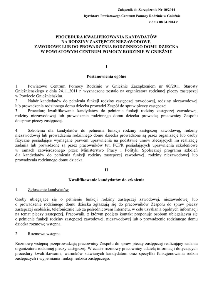 Załącznik do Zarządzenia Nr 10/2014 Dyrektora Powiatowego Centrum Pomocy Rodzinie w Gnieźnie z dnia 08.04.2014 r. PROCEDURA KWALIFIKOWANIA KANDYDATÓW NA RODZINY ZASTĘPCZE NIEZAWODOWE, ZAWODOWE LUB DO PROWADZENIA RODZINNEGO DOMU DZIECKA W POWIATOWYM CENTRUM POMOCY RODZINIE W GNIEŹNIE I Postanowienia ogólne 1. Powiatowe Centrum Pomocy Rodzinie w Gnieźnie Zarządzeniem nr 80/2011 Starosty Gnieźnieńskiego z dnia 24.11.2011 r. wyznaczone zostało na organizatora rodzinnej pieczy zastępczej w Powiecie Gnieźnieńskim. 2. Nabór kandydatów do pełnienia funkcji rodziny zastępczej zawodowej, rodziny niezawodowej lub prowadzenia rodzinnego domu dziecka prowadzi Zespół do spraw pieczy zastępczej. 3. Procedurę kwalifikowania kandydatów do pełnienia funkcji rodziny zastępczej zawodowej, rodziny niezawodowej lub prowadzenia rodzinnego domu dziecka prowadzą pracownicy Zespołu do spraw pieczy zastępczej. 4. Szkolenia dla kandydatów do pełnienia funkcji rodziny zastępczej zawodowej, rodziny niezawodowej lub prowadzenia rodzinnego domu dziecka prowadzone są przez organizacje lub osoby fizyczne posiadające wymagane prawem uprawnienia na podstawie umów zlecających im realizację zadania lub prowadzone są przez pracowników tut. PCPR posiadających uprawnienia szkoleniowe w ramach zatwierdzonego przez Ministerstwo Pracy i Polityki Społecznej programu szkoleń dla kandydatów do pełnienia funkcji rodziny zastępczej zawodowej, rodziny niezawodowej lub prowadzenia rodzinnego domu dziecka. II Kwalifikowanie kandydatów do szkolenia 1. Zgłoszenie kandydatów Osoby ubiegające się o pełnienie funkcji rodziny zastępczej zawodowej, niezawodowej lub o prowadzenie rodzinnego domu dziecka zgłaszają się do pracowników Zespołu do spraw pieczy zastępczej osobiście, telefonicznie lub za pośrednictwem Internetu, w celu uzyskania ogólnych informacji na temat pieczy zastępczej. Pracownik, z którym podjęto kontakt proponuje osobom ubiegającym się o pełnienie funkcji rodziny zastępczej zawodowej, niezawodowej lub o prowadzenie rodzinnego domu dziecka rozmowę wstępną. 2. Rozmowa wstępna Rozmowę wstępną przeprowadzają pracownicy Zespołu do spraw pieczy zastępczej realizujący zadania organizatora rodzinnej pieczy zastępczej. W czasie rozmowy pracownicy udzielą informacji dotyczących procedury kwalifikowania, warunków stawianych kandydatom oraz specyfiki funkcjonowania rodzin zastępczych i wypełniania funkcji rodzica zastępczego. 3. Rozpoczęcie współpracy –złożenie wymaganych dokumentów. Osoba decydująca się na poddanie procesowi kwalifikacji składa w Powiatowym Centrum Pomocy Rodzinie w Gnieźnie następujące dokumenty: a) pisemny wniosek o wszczęcie procedury kwalifikowania do pełnienia funkcji rodziny zastępczej wraz z oświadczeniem o zapoznaniu się i akceptacji procedury kwalifikowania kandydatów - załącznik nr 1, b) oświadczenie o wyrażeniu zgody na przetwarzanie i udostępnianie danych osobowych, wg wzoru stanowiącego - załącznik nr 2 do niniejszej procedury, c) oświadczenie o wyrażeniu zgody na przeprowadzenie procedury sprawdzającej oraz udział w badaniach pedagogiczno – psychologicznych, wg wzoru stanowiącego załącznik nr 3 do niniejszej procedury, d) oświadczenie dotyczące władzy rodzicielskiej, wg wzoru stanowiącego - załącznik nr 4 do niniejszej procedury, e) oświadczenie dotyczące obowiązku alimentacyjnego, wg wzoru stanowiącego załącznik nr 5 do niniejszej procedury, f) oświadczenie o posiadaniu zdolności do czynności prawnych, wg wzoru stanowiącego załącznik nr 6 do niniejszej procedury, g) zaświadczenie lekarskie wystawione przez lekarza podstawowej opieki zdrowotnej zawierające zapis „brak przeciwwskazań zdrowotnych do pełnienia funkcji rodziny zastępczej lub prowadzenia rodzinnego domu dziecka”, h) potwierdzenie zameldowania, i) oświadczenie o niekaralności, wg wzoru stanowiącego - załącznik nr 7 do niniejszej procedury, j) zaświadczenia o zatrudnieniu oraz o dochodach za okres trzech miesięcy poprzedzających miesiąc złożenia wniosku (w przypadku rolników zaświadczenie z Urzędu Gminy/PIT), k) akt małżeństwa (wyciąg aktualny, ew. sentencja rozwodowa), l) oświadczenie dot. leczenia odwykowego, wg wzoru stanowiącego załącznik nr 8 do niniejszej procedury, ł) kserokopie dokumentów potwierdzających wykształcenie kandydata, m) kserokopia dowodu osobistego kandydata/ów, n) życiorys kandydata - historia życia. W uzasadnionych przypadkach PCPR może wymagać zaświadczeń od innych specjalistów wykluczających ograniczenia zdrowotne w opiece nad dzieckiem oraz może zasięgać opinii środowiskowych na temat kandydatów, między innymi: od pracodawcy, sąsiadów, księdza, sołtysa, w przypadków kandydatów z dziećmi w wieku szkolnym –zaświadczeń ze szkoły itp. 4. Skierowanie na szkolenie. Po przeanalizowaniu niezbędnych dokumentów i pozytywnym ich zatwierdzeniu przez Zespół do spraw pieczy zastępczej, wydaje się skierowanie do udziału w szkoleniu. Osoba niepozostająca w związku małżeńskim uczestniczy w szkoleniu sama, małżonkowie w szkoleniu uczestniczą oboje. 5. Wizyta środowiskowa. Po złożeniu dokumentów, o których mowa w ust. 3 pracownicy Zespołu ds. pieczy zastępczej udają się z wizytą do domu kandydata/ów w celu bliższego ich poznania oraz ustalenia ich warunków bytowych i mieszkaniowych. Z wizyty sporządzana jest opinia. W przypadku kandydatów zgłaszających kandydaturę jako małżonkowie podczas wizyty wymagana jest obecność obojga małżonków. 6. Wywiad pedagogiczny Pedagog zatrudniony przez organizatora rodzinnej pieczy przeprowadza z kandydatem/kandydatami wywiad pedagogiczny, który w szczególności dotyczy: 1) motywacji kandydatów przy podejmowaniu decyzji o utworzeniu rodziny zastępczej, 2) doświadczeń w opiece nad dziećmi, 3) rozpoznania predyspozycji wychowawczych i opiekuńczych kandydatów oraz o