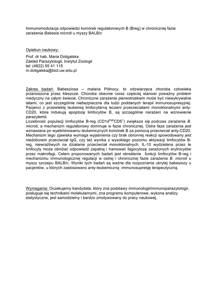 Immunomodulacja odpowiedzi komórek regulatorowych B (Breg) w chronicznej fazie zarażenia Babesia microti u myszy BALB/c Opiekun naukowy: Prof. dr hab. Maria Doligalska Zakład Parazytologii, Instytut Zoologii tel: (4822) 55 41 115 [email protected] Zakres badań: Babesziosa – malaria Północy, to odzwierzęca choroba człowieka przenoszona przez kleszcze. Choroba obecnie coraz częściej stanowi poważny problem medyczny na całym świecie. Chroniczne zarażenie pierwotniakiem może być niewykrywalne latami, co jest szczególnie niebezpieczne dla ludzi poddanych terapii immunosupresyjnej. Pacjenci z przewlekłą leukemią limfocytarną leczeni przeciwciałami monoklonalnymi antyCD20, które indukują apoptozę limfocytów B, są szczególnie narażeni na wznowienie parazytemii. Liczebność populacji limfocytów B-reg (CD1dhighCD5+) zwiększa się podczas zarażenia B. microti, a mechanizm regulatorowy dominuje w fazie chronicznej. Ostra faza zarażenia jest wznawiana po wyeliminowaniu leukemicznych komórek B za pomocą przeciwciał anty-CD20. Mechanizm tego zjawiska wymaga wyjaśnienia czy brak obronnej reakcji spowodowany jest niedoborem przeciwciał IgG, czy też wynika z wysokiego poziomu aktywacji limfocytów Breg, niewrażliwych na działanie przeciwciał monoklonalnych. IL-10 wydzielana przez te limfocyty może obniżać odpowiedź zapalną i hamować fagocytozę zarażonych erytrocytów przez makrofagi. Celem proponowanych badań jest określenie funkcji limfocytów B-reg i mechanizmu immunologicznej regulacji w ostrej i chronicznej fazie zarażenia B. microti u myszy szczepu BALB/c. Wyniki tych badań są ważne dla rozpoznania ukrytej babesiozy u pacjentów, u których zastosowano anty-leukemiczną immunosupresję terapeutyczną. Wymagania: Oczekujemy kandydata, który zna podstawy immunologii/immunoparazytologii, posługuje się technikami molekularnymi, zna programy komputerowe, wykona analizy statystyczne, jest samodzielny i bardzo zmotywowany do pracy naukowej.