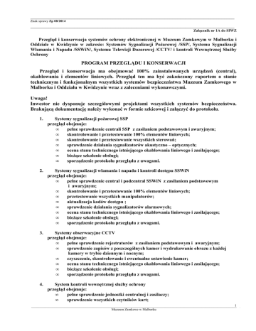 _______________________________________________________________________________ Znak sprawy Zp 08/2014 _______________________________________________________________________________ Załącznik nr 1A do SIWZ Przegląd i konserwacja systemów ochrony elektronicznej w Muzeum Zamkowym w Malborku i Oddziale w Kwidzynie w zakresie: Systemów Sygnalizacji Pożarowej /SSP/, Systemu Sygnalizacji Włamania i Napadu /SSWiN/, Systemu Telewizji Dozorowej /CCTV/ i kontroli Wewnętrznej Służby Ochrony PROGRAM PRZEGLĄDU I KONSERWACJI Przegląd i konserwacja ma obejmować 100% zainstalowanych urządzeń (central), okablowania i elementów liniowych. Przegląd ten ma być zakończony raportem o stanie technicznym i funkcjonalnym wszystkich systemów bezpieczeństwa Muzeum Zamkowego w Malborku i Oddziału w Kwidzynie wraz z zaleceniami wykonawczymi. Uwaga! Inwestor nie dysponuje szczegółowymi projektami wszystkich systemów bezpieczeństwa. Brakującą dokumentację należy wykonać w formie szkicowej i załączyć do protokołu. 1. Systemy sygnalizacji pożarowej SSP przegląd obejmuje: • pełne sprawdzenie centrali SSP z zasilaniem podstawowym i awaryjnym; • skontrolowanie i przetestowanie 100% elementów liniowych; • skontrolowanie i przetestowanie wszystkich sterowań; • sprawdzenie działania sygnalizatorów akustyczno – optycznych; • ocena stanu technicznego istniejącego okablowania liniowego i zasilającego; • bieżące szkolenie obsługi; • sporządzenie protokołu przeglądu z uwagami. 2. Systemy sygnalizacji włamania i napadu i kontroli dostępu SSWiN przegląd obejmuje: • pełne sprawdzenie central i podcentral SSWiN z zasilaniem podstawowym i awaryjnym; • skontrolowanie i przetestowanie 100% elementów liniowych; • przetestowanie wszystkich manipulatorów; • aktualizacja kodów dostępu ; • sprawdzenie działania sygnalizatorów alarmowych; • ocena stanu technicznego istniejącego okablowania liniowego i zasilającego; • bieżące szkolenie obsługi; • sporządzenie protokołu przeglądu z uwagami. 3. Systemy obserwacyjne CCTV przegląd obejmuje: • pełne sprawdzenie rejestratorów z zasilaniem podstawowym i awaryjnym; • sprawdzenie zapisów z poszczególnych kamer i wydrukowanie obrazu z każdej kamery w trybie dziennym i nocnym; • czyszczenie, skontrolowanie i ewentualne ustawienie kamer; • ocena stanu technicznego istniejącego okablowania liniowego i zasilającego; • bieżące szkolenie obsługi; • sporządzenie protokołu przeglądu z uwagami. 4. System kontroli wewnętrznej służby ochrony przegląd obejmuje: • pełne sprawdzenie jednostki centralnej i zasilaczy; • sprawdzenie wszystkich czytników kart; __________________________________________________________________________________________________________1 _ Muzeum Zamkowe w Malborku _______________________________________________________________________________ Znak sprawy Zp 08/2014 _______________________________________________________________________________ • • • sprawdzenie oprogramowania; bieżące szkolenie obsługi w miarę potrzeb; sporządzenie protokołu przeglądu z uwagami. SZCZEGÓŁOWY PROGRAM KONSERWACJI SYSTEMU PPOŻ. 1. Sprawdzenie poprawności pracy elementów systemu: • Sprawdzić stan urządzeń systemu (wizualnie), zamocowanie, usytuowanie, kompletność z dokumentacją powykonawczą; • Sugerować wymianę uszkodzonych elementów systemu; • Sugerować zmianę usytuowania czujek w przypadku ograniczenia pola działania w wyniku zmiany aranżacji wnętrz; • Testowanie czujek i ROP-ów – pobudzanie, czyszczenie, sprawdzanie stanu styków; • Sprawdzenie stanu technicznego gniazd czujek; • Sprawdzenie poprawności adresacji; • Sprawdzenie działania pętli dozorowych (funkcje zwarcia i rozwarcia); • Sprawdzenie funkcjonowania sterowań zgodnie z algorytmem sterowań; • Testowanie akumulatorów, wydajność zasilaczy i zasilania awaryjnego; • Sprawdzenie funkcjonowania i współdziałania konsoli operatorskiej; • Wykonanie alarmów testowych i sterowań oraz sprawdzenie pamięci zdarzeń; • Sprawdzenie zegara czasu rzeczywistego i baterii litowej; • Sprawdzenie działania systemu po alarmie; • Sprawdzenie organizacji alarmowania. • Sprawdzenie monitoringu do PSP wspólnie z firmą monitorującą SIMON, dla każdej zainstalowanej centrali w MZM. 2. Sprawdzenie części systemu związanej z zasilaniem: • Sprawdzenie stanu akumulatorów – zmierzyć napięcie na akumulatorach (min. 23V), asymetria maksymalnie 1V; • Sprawdzenie stanu naładowania – obciążyć akumulator na 30 min., sprawdzić napięcie (nie niższe niż 11V na akumulatorze i 23V na obu). W przypadku przekroczenia wartości wymienić akumulatory; • Sprawdzenie prawidłowości reakcji systemu na odłączenie napięcia zasilającego (zgłoszenie braku zasilania); • Sprawdzenie podłączenia centrali do akumulatorów i zasilania sieciowego; • Sprawdzenie, czy bezpieczniki mają właściwe wartości; • Sprawdzenie baterii litowych. 3. Sprawdzenie centrali systemu: • Dokonanie wizualnych oględzin centrali; • Sprawdzenie stanu zamocowań modułów, kabli, podłączeń; • Sprawdzenie poprawności połączeń śrubowych. W szczególności sprawdzenie podłączenia uziemienia do centrali. 4. Sprawdzenie konsoli i drukarki: • Dokonanie wizualnych oględzin stanu konsoli, ewentualne mycie klawiatury i wyświetlacza, usunięcie ewentualnej usterki w podłączeniu uziemienia (często się zdarza); • Przeprowadzenie testu wyświetlacza; • Przełączenie „Obsługa obecna/nieobecna”; • Wyłączenie - włączenie jednej ze stref; • Wywołanie alarmu 1 stopnia, potwierdzenie i skasowanie; • Wywołanie uszkodzenia, potwierdzenie i skasowanie; • Wywołanie testu drukarki. 2 __________________________________________________________________________________________________________ Muzeum Zamkowe w Malborku ____________________________________
