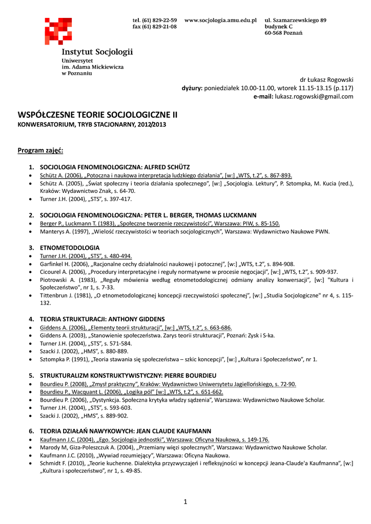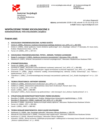 dr Łukasz Rogowski dyżury: poniedziałek 10.00-11.00, wtorek 11.15-13.15 (p.117) e-mail: [email protected] WSPÓŁCZESNE TEORIE SOCJOLOGICZNE II KONWERSATORIUM, TRYB STACJONARNY, 2012/2013 Program zajęć: 1. SOCJOLOGIA FENOMENOLOGICZNA: ALFRED SCHÜTZ Schütz A. (2006), „Potoczna i naukowa interpretacja ludzkiego działania”, [w:] „WTS, t.2”, s. 867-893. Schütz A. (2005), „Świat społeczny i teoria działania społecznego”, [w:] „Socjologia. Lektury”, P. Sztompka, M. Kucia (red.), Kraków: Wydawnictwo Znak, s. 64-70. Turner J.H. (2004), „STS”, s. 397-417. 2. SOCJOLOGIA FENOMENOLOGICZNA: PETER L. BERGER, THOMAS LUCKMANN Berger P., Luckmann T. (1983), „Społeczne tworzenie rzeczywistości”, Warszawa: PIW, s. 85-150. Manterys A. (1997), „Wielość rzeczywistości w teoriach socjologicznych”, Warszawa: Wydawnictwo Naukowe PWN. 3. ETNOMETODOLOGIA Turner J.H. (2004), „STS”, s. 480-494. Garfinkel H. (2006), „Racjonalne cechy działalności naukowej i potocznej”, [w:] „WTS, t.2”, s. 894-908. Cicourel A. (2006), „Procedury interpretacyjne i reguły normatywne w procesie negocjacji”, [w:] „WTS, t.2”, s. 909-937. Piotrowski A. (1983), „Reguły mówienia według etnometodologicznej odmiany analizy konwersacji”, [w:] "Kultura i Społeczeństwo", nr 1, s. 7-33. Tittenbrun J. (1981), „O etnometodologicznej koncepcji rzeczywistości społecznej”, [w:] „Studia Socjologiczne" nr 4, s. 115132. 4. TEORIA STRUKTURACJI: ANTHONY GIDDENS Giddens A. (2006), „Elementy teorii strukturacji”, [w:] „WTS, t.2”, s. 663-686. Giddens A. (2003), „Stanowienie społeczeństwa. Zarys teorii strukturacji”, Poznań: Zysk i S-ka. Turner J.H. (2004), „STS”, s. 571-584. Szacki J. (2002), „HMS”, s. 880-889. Sztompka P. (1991), „Teoria stawania się społeczeństwa – szkic koncepcji”, [w:] „Kultura i Społeczeństwo”, nr 1. 5. STRUKTURALIZM KONSTRUKTYWISTYCZNY: PIERRE BOURDIEU Bourdieu P. (2008), „Zmysł praktyczny”, Kraków: Wydawnictwo Uniwersytetu Jagiellońskiego, s. 72-90. Bourdieu P., Wacquant L. (2006), „Logika pól” [w:] „WTS, t.2”, s. 651-662. Bourdieu P. (2006), „Dystynkcja. Społeczna krytyka władzy sądzenia”, Warszawa: Wydawnictwo Naukowe Scholar. Turner J.H. (2004), „STS”, s. 593-603. Szacki J. (2002), „HMS”, s. 889-902. 6. TEORIA DZIAŁAŃ NAWYKOWYCH: JEAN CLAUDE KAUFMANN Kaufmann J.C. (2004), „Ego. Socjologia jednostki”, Warszawa: Oficyna Naukowa, s. 149-176. Marody M, Giza-Poleszczuk A. (2004), „Przemiany więzi społecznych”, Warszawa: Wydawnictwo Naukowe Scholar. Kaufmann J.C. (2010), „Wywiad rozumiejący”, Warszawa: Oficyna Naukowa. Schmidt F. (2010), „Teorie kuchenne. Dialektyka przyzwyczajeń i refleksyjności w koncepcji Jeana-Claude'a Kaufmanna”, [w:] „Kultura i społeczeństwo”, nr 1, s. 49-85. 1 7. WYBRANE WSPÓŁCZESNE TEORIE WŁADZY I PANOWANIA: PIERRE BOURDIEU (PRZEMOC SYMBOLICZNA) (zajęcia podwójne) Bourdieu P. (2004), „Męska dominacja”, Warszawa: Oficyna Naukowa, s. 7-67. Bourdieu P., Passeron J.-C. (2006), „Reprodukcja. Elementy teorii systemu nauczania”, Warszawa: Wydawnictwo Naukowe PWN. 8. WYBRANE WSPÓŁCZESNE TEORIE WŁADZY I PANOWANIA: MICHEL FOUCAULT Foucault M. (2006), „Trzy typy władzy”, [w:] „WTS, t.1”, s. 512-536. Foucault M. (2006), „Władza i wiedza”, [w:] „WTS, t.1”, s. 537-544. Foucault M. (1998), „Nadzorować i karać. Narodziny więzienia”, Warszawa: Fundacja Aletheia. Foucault M. (2002), „Porządek dyskursu. Wykład inauguracyjny wygłoszony w Collège de France 2 grudnia 1970”, Gdańsk: słowo/obraz terytoria. Szacki J. (2002), „HMS”, s. 902-910. 9. PONOWOCZESNOŚĆ I PÓŹNA NOWOCZESNOŚĆ Giddens A. (2001), „Nowoczesność i tożsamość. «Ja» i społeczeństwo w epoce późnej nowoczesności”, Warszawa: Wydawnictwo Naukowe PWN, s. 15-49. Beck U. (2002), „Społeczeństwo ryzyka. W drodze do innej nowoczesności”, Warszawa: Wydawnictwo Naukowe Scholar, s. 25-65. Inglehart R. (2005), „Pojawienie się wartości postmaterialistycznych”, [w:] „Socjologia. Lektury”, P. Sztompka, M. Kucia (red.); Kraków: Wydawnictwo Znak, s. 334-348. Beck U., Giddens A., Lash S. (2009), „Modernizacja refleksyjna. Polityka, tradycja i estetyka w porządku społecznym nowoczesności”, Warszawa: Wydawnictwo Naukowe PWN. Szacki J. (2002), „HMS”, s. 910-921. 10. SOCJOLOGIA ŻYCIA CODZIENNEGO: MICHEL DE CERTEAU de Certeau M. (2008), „Wynaleźć codzienność. Sztuki działania”, Kraków: Wydawnictwo Uniwersytetu Jagiellońskiego, s. 3042 i 93-110. de Certeau M. (2011), „Wynaleźć codzienność. Mieszkać, gotować”, Kraków: Wydawnictwo Uniwersytetu Jagiellońskiego. Sztompka P., Bogunia Borowska M. (red.) (2008), „Socjologia codzienności”, Kraków: Wydawnictwo Znak. Rudnicki S., Stypińska J., Wojnicka K. (red.) (2009), „Społeczeństwo i codzienność? W stronę nowej socjologii”, Warszawa: Wydawnictwa Akademickie i Profesjonalne. Bogunia-Borowska M. (red.) (2009), „Barwy codzienności. Analiza socjologiczna”, Warszawa: Wydawnictwo Naukowe Scholar. 11. TEORIA AKTORA-SIECI: BRUNO LATOUR Latour B. (2010), „Splatając na nowo to, co społeczne. Wprowadzenie do teorii aktora-sieci”, Kraków: Universitas, s. 39-60. Latour B. (2009), „Polityka natury. Nauki wkraczają do demokracji”, Warszawa: Wydawnictwo Krytyki Politycznej. Abriszewski K. (2008), „Poznanie, zbiorowość, polityka. Analiza teorii aktora-sieci Bruno Latoura”, Kraków: Universitas. Gdula M. (2010), „Socjologia końca socjologii”. O koncepcji teoretycznej Bruno Latoura”, [w:] „Kultura i społeczeństwo”, nr 1, s. 3-15. Dant T. (2007), „Kultura materialna w rzeczywistości społecznej”, Kraków: Wydawnictwo Uniwersytetu Jagiellońskiego. 12. POSTKOLONIALIZM Said E. (2005), „Orientalizm”, Poznań: Zysk i S-ka, s. 29-64. Gandhi L. (2008), „Teoria postkolonialna. Wprowadzenie krytyczne”, Poznań: