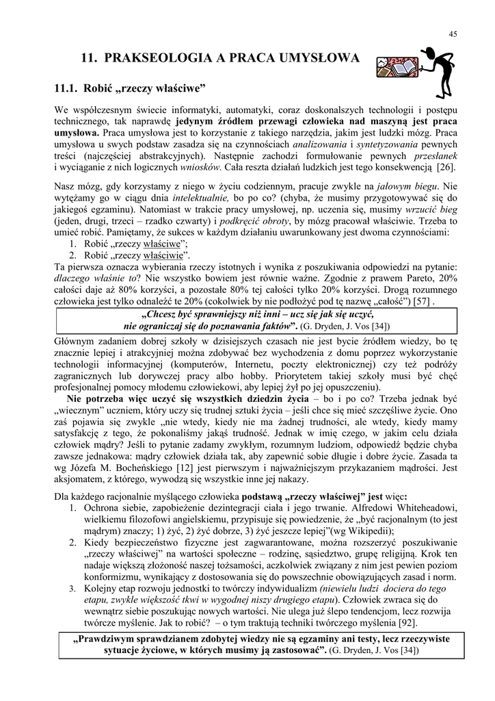 45 11. PRAKSEOLOGIA A PRACA UMYSŁOWA 11.1. Robić „rzeczy właściwe” We współczesnym świecie informatyki, automatyki, coraz doskonalszych technologii i postępu technicznego, tak naprawdę jedynym źródłem przewagi człowieka nad maszyną jest praca umysłowa. Praca umysłowa jest to korzystanie z takiego narzędzia, jakim jest ludzki mózg. Praca umysłowa u swych podstaw zasadza się na czynnościach analizowania i syntetyzowania pewnych treści (najczęściej abstrakcyjnych). Następnie zachodzi formułowanie pewnych przesłanek i wyciąganie z nich logicznych wniosków. Cała reszta działań ludzkich jest tego konsekwencją [26]. Nasz mózg, gdy korzystamy z niego w Ŝyciu codziennym, pracuje zwykle na jałowym biegu. Nie wytęŜamy go w ciągu dnia intelektualnie, bo po co? (chyba, Ŝe musimy przygotowywać się do jakiegoś egzaminu). Natomiast w trakcie pracy umysłowej, np. uczenia się, musimy wrzucić bieg (jeden, drugi, trzeci – rzadko czwarty) i podkręcić obroty, by mózg pracował właściwie. Trzeba to umieć robić. Pamiętamy, Ŝe sukces w kaŜdym działaniu uwarunkowany jest dwoma czynnościami: 1. Robić „rzeczy właściwe”; 2. Robić „rzeczy właściwie”. Ta pierwsza oznacza wybierania rzeczy istotnych i wynika z poszukiwania odpowiedzi na pytanie: dlaczego właśnie to? Nie wszystko bowiem jest równie waŜne. Zgodnie z prawem Pareto, 20% całości daje aŜ 80% korzyści, a pozostałe 80% tej całości tylko 20% korzyści. Drogą rozumnego człowieka jest tylko odnaleźć te 20% (cokolwiek by nie podłoŜyć pod tę nazwę „całość”) [57] . „Chcesz być sprawniejszy niŜ inni – ucz się jak się uczyć, nie ograniczaj się do poznawania faktów”. (G. Dryden, J. Vos [34]) Głównym zadaniem dobrej szkoły w dzisiejszych czasach nie jest bycie źródłem wiedzy, bo tę znacznie lepiej i atrakcyjniej moŜna zdobywać bez wychodzenia z domu poprzez wykorzystanie technologii informacyjnej (komputerów, Internetu, poczty elektronicznej) czy teŜ podróŜy zagranicznych lub dorywczej pracy albo hobby. Priorytetem takiej szkoły musi być chęć profesjonalnej pomocy młodemu człowiekowi, aby lepiej Ŝył po jej opuszczeniu). Nie potrzeba więc uczyć się wszystkich dziedzin Ŝycia – bo i po co? Trzeba jednak być „wiecznym” uczniem, który uczy się trudnej sztuki Ŝycia – jeśli chce się mieć szczęśliwe Ŝycie. Ono zaś pojawia się zwykle „nie wtedy, kiedy nie ma Ŝadnej trudności, ale wtedy, kiedy mamy satysfakcję z tego, Ŝe pokonaliśmy jakąś trudność. Jednak w imię czego, w jakim celu działa człowiek mądry? Jeśli to pytanie zadamy zwykłym, rozumnym ludziom, odpowiedź będzie chyba zawsze jednakowa: mądry człowiek działa tak, aby zapewnić sobie długie i dobre Ŝycie. Zasada ta wg Józefa M. Bocheńskiego [12] jest pierwszym i najwaŜniejszym przykazaniem mądrości. Jest aksjomatem, z którego, wywodzą się wszystkie inne jej nakazy. Dla kaŜdego racjonalnie myślącego człowieka podstawą „rzeczy właściwej” jest więc: 1. Ochrona siebie, zapobieŜenie dezintegracji ciała i jego trwanie. Alfredowi Whiteheadowi, wielkiemu filozofowi angielskiemu, przypisuje się powiedzenie, Ŝe „być racjonalnym (to jest mądrym) znaczy; 1) Ŝyć, 2) Ŝyć dobrze, 3) Ŝyć jeszcze lepiej”(wg Wikipedii); 2. Kiedy bezpieczeństwo fizyczne jest zagwarantowane, moŜna rozszerzyć poszukiwanie „rzeczy właściwej” na wartości społeczne – rodzinę, sąsiedztwo, grupę religijną. Krok ten nadaje większą złoŜoność naszej toŜsamości, aczkolwiek związany z nim jest pewien poziom konformizmu, wynikający z dostosowania się do powszechnie obowiązujących zasad i norm. 3. Kolejny etap rozwoju jednostki to twórczy indywidualizm (niewielu ludzi dociera do tego etapu, zwykle większość tkwi w wygodnej niszy drugiego etapu). Człowiek zwraca się do wewnątrz siebie poszukując nowych wartości. Nie ulega juŜ ślepo tendencjom, lecz rozwija twórcze myślenie. Jak to robić? – o tym traktują techniki twórczego myślenia [92]. „Prawdziwym sprawdzianem zdobytej wiedzy nie są egzaminy ani testy, lecz rzeczywiste sytuacje Ŝyciowe, w których musimy ją zastosować”. (G. Dryden, J. Vos [34]) 46 11.2. Robić „rzeczy” właściwie „KaŜdy, będąc w dowolnym wieku, moŜe nauczyć się niemal wszystkiego znacznie szybciej – często od pięciu do dwudziestu razy szybciej – i zazwyczaj od dziesięciu do stu razy efektywniej” [34]. Metody takiej nauki są proste, łatwe do przyswojenia, oparte na zdrowym rozsądku i powielają się. Nowe techniki noszą rozmaite nazwy: programowanie neurolingwistyczne, przyspieszone nauczanie, sugestopedia. Nazwa nie ma tu większego znaczenia. Istotne jest bowiem to, Ŝe pozwalają szybko przyswajać wiedzę, dostarczają dobrej zabawy i dają duŜo satysfakcji” [13]. Sugestopedia znana na Zachodzie pod nazwą supernauczania (superlearning) jest holistyczną metodą nauczania, opartą na zasadzie harmonii między ciałem a umysłem. Twórca tej metody prof. Łozanow wyszedł z załoŜenia, Ŝe człowiek wykorzystuje tylko 10 do 15% swoich intelektualnych moŜliwości. Dlatego teŜ doprowadzając się do głębokiego stanu odpręŜenia ciała i umysłu w połączeniu z rytmicznym oddychaniem, odpowiednią muzyką i sugestiami, moŜna bez trudu przyswoić znaczną ilość wiedzy. Korzyści, jakie wypływają dla człowieka z wykorzystania nowych technik pracy umysłowej to: podniesienie skuteczności przyswajania nowych informacji poprzez stosowanie technik pamięciowych, szybka i efektywna nauka języków obcych, przyśpieszenie procesu czytania, przy jednoczesnym podniesieniu stopnia zrozumienia nawet najbardziej zagmatwanych tekstów. Według Łozanowa w nauce przeszkadzają nam trzy główne bariery [34]: • krytyczno-logiczna („szkoła jest trudna, to jak nauka ma być zabawna i łatwa”), • intuicyjno-emocjonalna („jestem głupi, nie będę