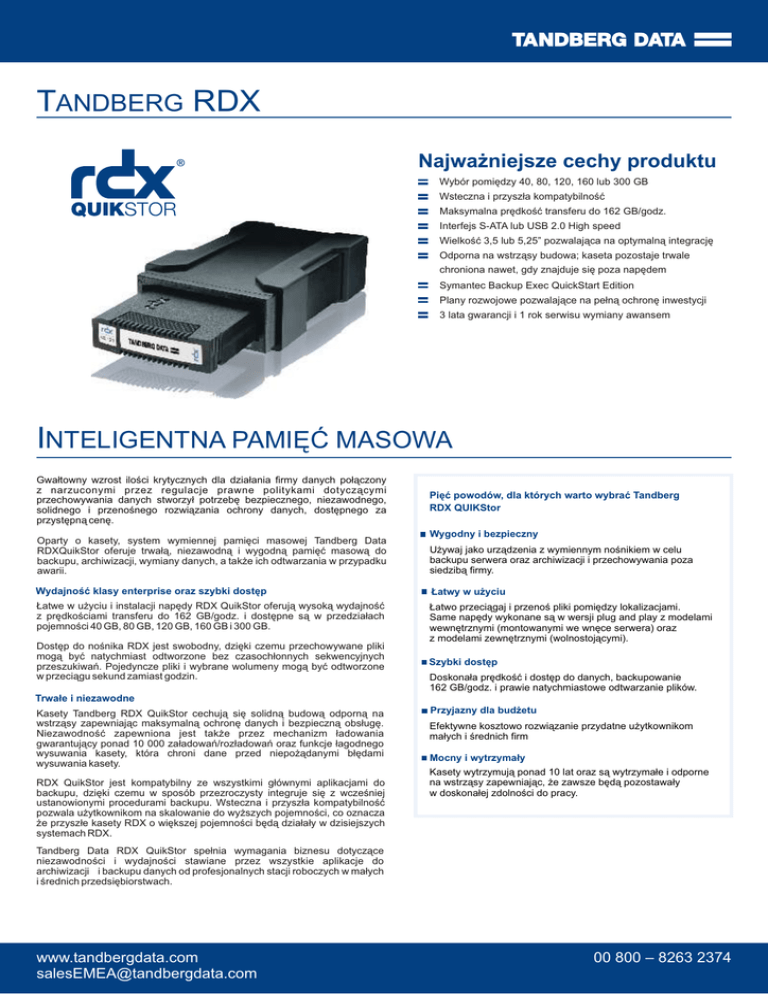 TANDBERG RDX Najważniejsze cechy produktu Wybór pomiędzy 40, 80, 120, 160 lub 300 GB Wsteczna i przyszła kompatybilność Maksymalna prędkość transferu do 162 GB/godz. Interfejs S-ATA lub USB 2.0 High speed Wielkość 3,5 lub 5,25” pozwalająca na optymalną integrację Odporna na wstrząsy budowa; kaseta pozostaje trwale chroniona nawet, gdy znajduje się poza napędem Symantec Backup Exec QuickStart Edition Plany rozwojowe pozwalające na pełną ochronę inwestycji 3 lata gwarancji i 1 rok serwisu wymiany awansem INTELIGENTNA PAMIĘĆ MASOWA Gwałtowny wzrost ilości krytycznych dla działania firmy danych połączony z narzuconymi przez regulacje prawne politykami dotyczącymi przechowywania danych stworzył potrzebę bezpiecznego, niezawodnego, solidnego i przenośnego rozwiązania ochrony danych, dostępnego za przystępną cenę. Pięć powodów, dla których warto wybrać Tandberg RDX QUIKStor Wygodny i bezpieczny Oparty o kasety, system wymiennej pamięci masowej Tandberg Data RDXQuikStor oferuje trwałą, niezawodną i wygodną pamięć masową do backupu, archiwizacji, wymiany danych, a także ich odtwarzania w przypadku awarii. Używaj jako urządzenia z wymiennym nośnikiem w celu backupu serwera oraz archiwizacji i przechowywania poza siedzibą firmy. Wydajność klasy enterprise oraz szybki dostęp Łatwy w użyciu Łatwe w użyciu i instalacji napędy RDX QuikStor oferują wysoką wydajność z prędkościami transferu do 162 GB/godz. i dostępne są w przedziałach pojemności 40 GB, 80 GB, 120 GB, 160 GB i 300 GB. Łatwo przeciągaj i przenoś pliki pomiędzy lokalizacjami. Same napędy wykonane są w wersji plug and play z modelami wewnętrznymi (montowanymi we wnęce serwera) oraz z modelami zewnętrznymi (wolnostojącymi). Dostęp do nośnika RDX jest swobodny, dzięki czemu przechowywane pliki mogą być natychmiast odtworzone bez czasochłonnych sekwencyjnych przeszukiwań. Pojedyncze pliki i wybrane wolumeny mogą być odtworzone w przeciągu sekund zamiast godzin. Szybki dostęp Doskonała prędkość i dostęp do danych, backupowanie 162 GB/godz. i prawie natychmiastowe odtwarzanie plików. Trwałe i niezawodne Kasety Tandberg RDX QuikStor cechują się solidną budową odporną na wstrząsy zapewniając maksymalną ochronę danych i bezpieczną obsługę. Niezawodność zapewniona jest także przez mechanizm ładowania gwarantujący ponad 10 000 załadowań/rozładowań oraz funkcje łagodnego wysuwania kasety, która chroni dane przed niepożądanymi błędami wysuwania kasety. RDX QuikStor jest kompatybilny ze wszystkimi głównymi aplikacjami do backupu, dzięki czemu w sposób przezroczysty integruje się z wcześniej ustanowionymi procedurami backupu. Wsteczna i przyszła kompatybilność pozwala użytkownikom na skalowanie do wyższych pojemności, co oznacza że przyszłe kasety RDX o większej pojemności będą działały w dzisiejszych systemach RDX. Przyjazny dla budżetu Efektywne kosztowo rozwiązanie przydatne użytkownikom małych i średnich firm Mocny i wytrzymały Kasety wytrzymują ponad 10 lat oraz są wytrzymałe i odporne na wstrząsy zapewniając, że zawsze będą pozostawały w doskonałej zdolności do pracy. Tandberg Data RDX QuikStor spełnia wymagania biznesu dotyczące niezawodności i wydajności stawiane przez wszystkie aplikacje do archiwizacji i backupu danych od profesjonalnych stacji roboczych w małych i średnich przedsiębiorstwach. www.tandbergdata.com [email protected] 00 800 – 8263 2374 O firmie Tandberg Data Tandberg Data jest wiodącym światowym dostawcą i producentem napędów taśmowych, automatyki taśmowej oraz subsystemów dyskowych. Tandberg Data oferuje rozwiązania oparte o platformy technologii taśmowych LTO, SLR i VXA, oprogramowanie pamięci masowej, nośniki oraz pamięć masową z dyskami twardymi. Wszystkie rozwiązania zostały zaprojektowane w celu spełnienia wymagań związanych z rosnącą pamięcią masową w małych i średniej skali przedsiębiorstwach oferując skalowalność, niezawodność oraz wsteczną kompatybilność zapewniające niskie koszty eksploatacji oraz długoterminową ochronę inwestycji. Tandberg Data jest dumny z ponad 25-cio letniego dostarczania produktów i usług swoim klientom. Specyfikacja Wydajność Pojemność (GB): 40, 80, 120, 160, 300 Wewnętrzny SATA 35 - 45 MB/s 1,5 Gb/s 15 ms FAT32 i NTFS SATA lub USB 2.0 High Speed Systemy operacyjne Microsoft Windows 2000, Windows XP Professional Windows XP Home, Window 2003 Server, Windows Vista Linux (Fedora Core 5), Linux (RHEL 4 update 3), Suse Linux Enterprise Server 9.0 i 10.0 Średnia ciągłą prędkość transferu: Prędkość transferu szczytowa: Średni czas dostępu: Obsługiwane systemy plików: Interfejs: Kompatybilność: Specyfikacja niezawodności Ładowanie/rozładowanie kasety: Ładowanie/rozładowanie napędu: Średni czas bezawaryjnej pracy MTBF napędu: Średni czas bezawaryjnej pracy MTBF kasety: Współczynnik błędów niekorygowalnych: 5 000 cykli ładowań/rozładowań 10 000 cykli ładowań/rozładowań 500 000 przy 100 % obciążeniu 500 000 godzin 1 błąd na 1014 odczytanych błędów Temperatura i wilgotności Temperatura pracy: Temperatura przechowywania: Wilgotność względna pracy: Wilgotność względna przechowywania: Wysokość względna n.p.m. (pracy): Wysokość względna n.p.m. (przechowywania): 5° C do 45° C -40° C do 65° C 10 % do 90 % (bez kondensacji) 5 % do 95 % (bez kondensacji) -300 do 3000 m -300 do 12000 m Zasilanie Napięcie: Typowe zużycie energii: Wewnętrzny SATA +5 VDC 7,5 W Zezwolenia agencji dotyczące poziomu zakłóceń elektromagnetycznych: UL 60950, CSA C22.2 No.60950, IEC 60950/ EN60950 FCC 47 CFR, part 15, class B, CISPR22, class B; EN55022, class B; EN61000-3-2, EN61000-3-3; CISPR24; EN55024; ICES-003, class B,VCCI, CE, C-Tick 3 lata Gwarancja: Wymiary Wielkość: Wysokość: Szerokość: Długość: Zewnętrzny USB +12 VDC 6,6 W Adapter pr. zm