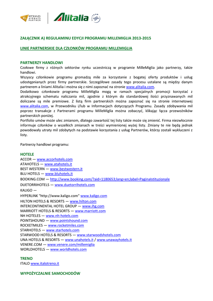 ZAŁĄCZNIK A) REGULAMINU EDYCJI PROGRAMU MILLEMIGLIA 2013-2015 LINIE PARTNERSKIE DLA CZŁONKÓW PROGRAMU MILLEMIGLIA PARTNERZY HANDLOWI Czołowe firmy z różnych sektorów rynku uczestniczą w programie MilleMiglia jako partnerzy, także handlowi. Wszyscy członkowie programu gromadzą mile za korzystanie z bogatej oferty produktów i usług udostępnianych przez firmy partnerskie. Szczegółowe zasady tego procesu ustalane są między danym partnerem a liniami Alitalia i można się z nimi zapoznać na stronie www.alitalia.com. Dodatkowo członkowie programu MilleMiglia mogą w ramach specjalnych promocji korzystać z atrakcyjnego schematu naliczania mil, zgodnie z którym do standardowej ilości przyznawanych mil doliczane są mile premiowe. Z listą firm partnerskich można zapoznać się na stronie internetowej www.alitalia.com, w Przewodniku i/lub w Informacjach dotyczących Programu. Zasady zdobywania mil poprzez transakcje z Partnerami programu MilleMiglia można zobaczyć, klikając łącza przewoźników partnerskich poniżej. Portfolio umów może ulec zmianom, dlatego zawartość tej listy także może się zmienić. Firma niezwłocznie informuje członków o wszelkich zmianach w treści wymienionej wyżej listy. Zmiany te nie będą jednak powodowały utraty mil zdobytych na podstawie korzystania z usług Partnerów, którzy zostali wykluczeni z listy. Partnerzy handlowi programu: HOTELE ACCOR — www.accorhotels.com ATAHOTELS — www.atahotels.it BEST WESTERN — www.bestwestern.it BLU HOTELS — www.bluhotels.it BOOKING.COM — http://www.booking.com/?aid=1180653;lang=en;label=PaginaIstituzionale DUETORRIHOTELS — www.duetorrihotels.com KALIGO — HYPERLINK "http://www.kaligo.com" www.kaligo.com HILTON HOTELS & RESORTS — www.hilton.com INTERCONTINENTAL HOTEL GROUP — www.ihg.com MARRIOTT HOTELS & RESORTS — www.marriott.com NH HOTELES — www.nh-hotels.com POINTSHOUND — www.pointshound.com ROCKETMILES — www.rocketmiles.com STARHOTELS — www.starhotels.com STARWOOD HOTELS & RESORTS — www.starwoodshotels.com UNA HOTELS & RESORTS — www.unahotels.it / www.unawayhotels.it VENERE.COM — www.venere.com/millemiglia WORLDHOTELS — www.worldhotels.com TRENO ITALO www.italotreno.it WYPOŻYCZALNIE SAMOCHODÓW AVIS — www.avisautonoleggio.it MAGGIORE RENT — www.maggiore.it FIRMY NAFTOWE ENI — www.eni.com Q8 — www.q8.it TOTAL ERG — www.totalerg.it (napisać literami drukowanymi) USŁUGI FINANSOWE AMERICAN EXPRESS — www.americanexpress.it CARTASI HYPERLINK "http://www.cartasi.it" www.cartasi.it DEUTSCHE BANK — www.db.com DINERS CLUB — www.dinersclub.it INTESA SAN PAOLO — www.intesasanpaolo.com UNICREDIT — www.unicredit.it Umowa dotyczy tylko członków programu zamieszkałych w Japonii: DC MASTERCARD www.mitsubishi.com JCB CARD — www.alitalia.com/jp_ja/millemiglia/partner-finanziari-e-assicurazioni/index.html#jcb SUMITOMO VISA — www.smbc-card.com/nyukai/affiliate/alitalia/index.jsp DINERS JAPAN — www.diners.co.jp/ja/press/inf_14C2469.html TOWARZYSTWA UBEZPIECZENIOWE CHUBB (ACE EUROPEAN GROUP) — http://new.chubb.com/it/it/ POZOSTALI PARTNERZY ACQUARIO DI GENOVA — www.acquariodigenova.it AEROPORTI DI ROMA — www.adr.it ASSOCIAZIONE NEGOZI STORICI DI ROMA — www.negozistoricieccellenza.it BEDETTI OROLOGI E GIOIELLI — www.bedetti.it FEDERICO BUCCELLATI ORAFO — www.federicobuccellati.cn BERTOLETTI PELLICCERIE 1882 — www.bertolettipelliccerie.it DAVIDE CENCI — www.davidecenci.com TEBRO BIANCHERIA — www.tebro.it DITTA LEONE LIMENTANI — www.limentani.com L.A.R. PARALUMI — www.paralumi.it TERRACINASTORE — www.terracinastore.com ANGELO COLAPICCHIONI — www.colapicchioni.it BENNET — www.bennet.com BOGGI MILANO — www.boggi.com BRIDGESTONE — www.bridgestone.it CHIC OUTLET SHOPPING — www.chicoutletshopping.com COOP — www.e-coop.it COOPERATIVA TAXI SAMARCANDA - www.samarcanda.it DAMIANI — www.damiani.com ENEL ENERGIA — www.enelenergia.it HURRY! — www.the-hurry.com IL FOGLIO — www.ilfoglio.it IL SOLE24ORE — www.ilsole24ore.com INTERFLORA — www.interflora.com (od 31 października) LCO LE CLINICHE ODONTOIATRICHE — www.lco.it LE VIE DEL MADE IN ITALY — www.leviedelmadeinitaly.com METAENERGIA — www.metaenergia.it MISIEDO — www.misiedo.com MSC CROCIERE — www.msccrociere.it NCC VENETO — www.nccveneto.com PAYBACK — www.payback.it QC TERME — www.qcterme.it RADIO TAXI VENETO — www.radiotaxiveneto.it ROYAL CARIBBEAN — www.royalcaribbean.it SANTA CECILIA — HYPERLINK "http://www.santacecilia.it" www.santacecilia.it SERVIZIO TAXI MILANO 02/8585 — www.radiotaxi8585.com TEATRO BRANCACCIO — www.teatrobrancaccio.it TEATRO ELISEO — www.teatroeliseo.com THE LUXER.COM — www.theluxer.com WISHDAYS — www.wishdays.it YOOX — www.yoox.com 892424 Pronto Pagine Gialle — www.892424.it LINIE LOTNICZE BĘDĄCE PARTNERAMI PROGRAMU Osobną kategorię partnerów programu stanowią wszystkie partnerskie linie lotnicze należące do Sojuszu SkyTeam, a także partnerskie linie Etihad Airways i inne linie lotnicze, które umożliwiają zdobywanie i odbieranie mil. PARTNERZY SOJUSZU SKYTEAM AEROFLOT — www.aeroflot.ru/cms/it AEROLÍNEAS ARGENTINAS — HYPERLINK "http://www.aerolineas.com.ar" www.aerolineas.com.ar AEROMEXICO — HYPERLINK "http://www.aeromexico.com" www.aeromexico.com AIR EUROPA — HYPERLINK "http://www.aireuropa.com" www.aireuropa.com AIR FRANCE — HYPERLINK "http://www.airfrance.it" www.airfrance.it CHINA AIRLINES — HYPERLINK "http://www.china-airlines.it" www.china-airlines.it CHINA EASTERN — HYPERLINK "http://www.chinaeastern.it" www.chinaeastern.it CHINA SOUTHERN — HYPERLINK "http://www.csair.com/en" www.csair.com/en CSA CZECH AIRLINES — HYPERLINK "http://www.csa.cz" www.csa.cz DELTA AIRLINES — HYPERLINK "https://it.delta.com/" https://it.delta.com/ GARUDA AIRLINES — HYPERLINK "http://www.garuda-indonesia.com" www.garuda-indonesia.com KENYA AIRWAYS — HYPERLINK "http://www.kenya-airwa