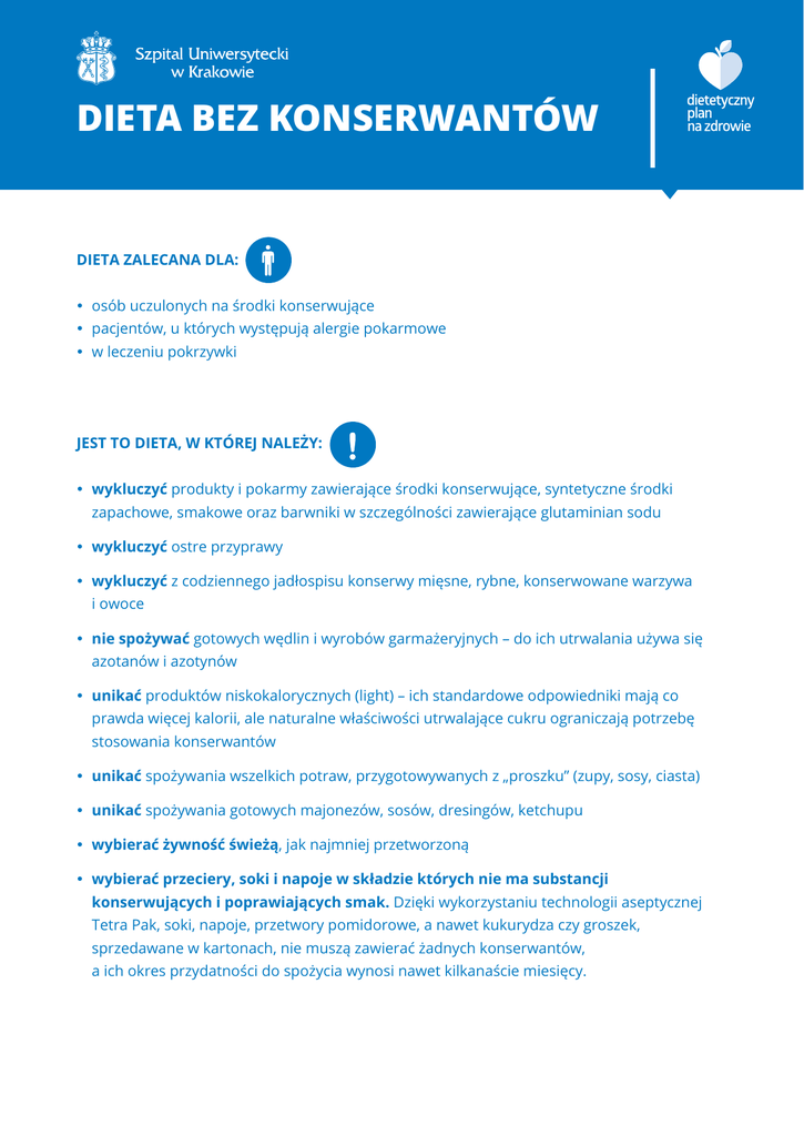 DIETA BEZ KONSERWANTÓW DIETA ZALECANA DLA: yy osób uczulonych na środki konserwujące yy pacjentów, u których występują alergie pokarmowe yy w leczeniu pokrzywki JEST TO DIETA, W KTÓREJ NALEŻY: yy wykluczyć produkty i pokarmy zawierające środki konserwujące, syntetyczne środki zapachowe, smakowe oraz barwniki w szczególności zawierające glutaminian sodu yy wykluczyć ostre przyprawy yy wykluczyć z codziennego jadłospisu konserwy mięsne, rybne, konserwowane warzywa i owoce yy nie spożywać gotowych wędlin i wyrobów garmażeryjnych – do ich utrwalania używa się azotanów i azotynów yy unikać produktów niskokalorycznych (light) – ich standardowe odpowiedniki mają co prawda więcej kalorii, ale naturalne właściwości utrwalające cukru ograniczają potrzebę stosowania konserwantów yy unikać spożywania wszelkich potraw, przygotowywanych z „proszku” (zupy, sosy, ciasta) yy unikać spożywania gotowych majonezów, sosów, dresingów, ketchupu yy wybierać żywność świeżą, jak najmniej przetworzoną yy wybierać przeciery, soki i napoje w składzie których nie ma substancji konserwujących i poprawiających smak. Dzięki wykorzystaniu technologii aseptycznej Tetra Pak, soki, napoje, przetwory pomidorowe, a nawet kukurydza czy groszek, sprzedawane w kartonach, nie muszą zawierać żadnych konserwantów, a ich okres przydatności do spożycia wynosi nawet kilkanaście miesięcy. DIETA BEZ KONSERWANTÓW SPOSOBY PRZYGOTOWYWANIA POTRAW: yy gotowanie w wodzie i na parze yy duszenie bez tłuszczu yy pieczenie w rękawie, folii aluminiowej, pergaminie lub naczyniu żaroodpornym ZALECENIA ŻYWIENIOWE: GRUPY PRODUKTÓW Produkty zbożowe i ziemniaki Warzywa i owoce PRODUKTY ZALECANE PRODUKTY PRZECIWWSKAZANE Pieczywo jasne lub razowe czerstwe, pieczywo typu graham, żytnie, mąka żytnia mąka pszenna, pytlowa, razowa, ziemniaczana, kukurydziana, drobna kasze: jęczmienna, manna, ryż, płatki owsiane, grube kasze: pęczak, gryczana, jaglana, makarony Pieczywo paczkowane (długi termin przydatności zawdzięcza konserwantom – do jego utrwalania stosuje się m.in. sorbinian wapnia) Ziemniaki Chipsy, gotowe frytki Pomidory, owoce jagodowe, owoce dzikiej róży, winogrona, brzoskwinie, morele, maliny, jabłka, truskawki, śliwki, czereśnie, agrest, wiśnie, marchew, dynia, brokuł, kalafior różyczka, sałata zielona, pietruszka, seler, buraki, marchew, koperek, zielona pietruszka, cykoria, kabaczek, fasolka szparagowa, brukselka, nasiona roślin strączkowych, kapusta włoska, ogórki i kapusta kiszona w domu Owoce cytrusowe, warzywa i owoce konserwowane, kiszone, suszone owoce, koncentraty, soki, sklepowe sałatki warzywne Makarony z dodatkiem barwników Owoce i warzywa świeże pochodzące z upraw ekologicznych, domowe przetwory Mleko i produkty mleczne Mleko, jogurty naturalne, kefir, maślanka Sery twarogowe MLEKO Mięso, wędliny, ryby, jaja Mięsa: cielęcina, indyk, kurczak, konina, wołowina, królik, jagnięcina, dziczyzna, schab, polędwica, łopatka, karkówka Zabielacze do kawy, mleko w proszku, skondensowane jogurty owocowe Sery żółte, topione, serki do smarowania Wędliny, wszystkie produkty garmażeryjne, konserwy mięsne, pasztety, konserwy rybne, ryby wędzone Ryby świeże: np. dorsz, flądra, mintaj, morszczuk, pstrąg strumieniowy, sandacz, sola, szczupak Jaja Tłuszcze Oleje roślinne: oliwa z oliwek, olej rzepakowy, słonecznikowy, sojowy, z pestek winogron, masło Margaryny twarde, margaryny miękkie Cukier i słodycze Miód naturalny, dżemy robione w domu bez dodatku żelfixu, przeciery owocowe, kompoty Czekolada, cukierki, kakao, wyroby cukiernicze, dżemy, marmolady, kisiele, budynie, galaretki DIETA BEZ KONSERWANTÓW GRUPY PRODUKTÓW Przyprawy PRODUKTY ZALECANE PRODUKTY PRZECIWWSKAZANE Łagodne: sól, cukier, sok z cytryny, koperek, kminek, cynamon, wanilia, majeranek, oregano, bazylia Inne Ostre przyprawy: ocet, musztarda, ostra papryka, chili, chrzan itp. Gotowe „zupy z torebek”, gotowe sosy, fix do potraw, vegeta, dressingi, majonezy, marynaty, ketchup, musztarda, sosy „w proszku” Kisiele, budynie, żelatyna, gotowe ciasta, ciasta „w proszku”, lody, guma do żucia Napoje gazowane, smakowe z dodatkiem barwników, wino, piwo PAMIĘTAJ! Czytaj dokładnie etykiety! Przed wybraniem produktu, zapoznaj się z jego składem. Dokładny opis zawartości znajduje się na tylnej lub bocznej ściance opakowania. Nie sugeruj się dużym napisem „Bez konserwantów”, umieszczanym na przedniej części opakowania. Jeżeli w opisie znajdziesz symbole od E 200 do E 252 oraz od E 280 do E 285, to znaczy, że produkt zawiera konserwanty. Zwróć uwagę na kolejność wymieniania składników. Jeżeli dana substancja znajduje się na początku listy, tym więcej jest jej w produkcie Należy się wystrzegać zwłaszcza poniższych konserwantów dodawanych do żywności: E-621 E-210 E-211 glutaminianu sodu kwasu benzoesowego E-249 E-250 od E-220 do E-228 benzoesanu sodu Samodzielny Publiczny Zakład Opieki Zdrowotnej KRS. 0000024155 • 31-501 Kraków, ul. Mikołaja Kopernika 36 tel.: 12 424 70 00 • fax 12 424 74 87 www.su.krakow.pl/dietetyczny-plan-na-zdrowie azotynów potasu i sodu siarczanów