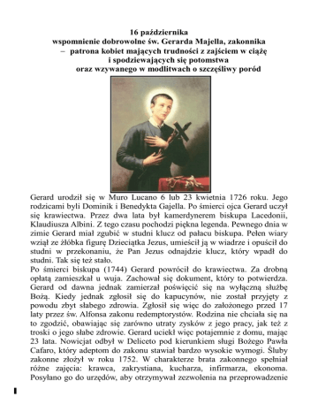 16 października wspomnienie dobrowolne św. Gerarda Majella, zakonnika patrona kobiet mających trudności z zajściem w ciążę i spodziewających się potomstwa oraz wzywanego w modlitwach o szczęśliwy poród Gerard urodził się w Muro Lucano 6 lub 23 kwietnia 1726 roku. Jego rodzicami byli Dominik i Benedykta Gajella. Po śmierci ojca Gerard uczył się krawiectwa. Przez dwa lata był kamerdynerem biskupa Lacedonii, Klaudiusza Albini. Z tego czasu pochodzi piękna legenda. Pewnego dnia w zimie Gerard miał zgubić w studni klucz od pałacu biskupa. Pełen wiary wziął ze żłóbka figurę Dzieciątka Jezus, umieścił ją w wiadrze i opuścił do studni w przekonaniu, że Pan Jezus odnajdzie klucz, który wpadł do studni. Tak się też stało. Po śmierci biskupa (1744) Gerard powrócił do krawiectwa. Za drobną opłatą zamieszkał u wuja. Zachował się dokument, który to potwierdza. Gerard od dawna jednak zamierzał poświęcić się na wyłączną służbę Bożą. Kiedy jednak zgłosił się do kapucynów, nie został przyjęty z powodu zbyt słabego zdrowia. Zgłosił się więc do założonego przed 17 laty przez św. Alfonsa zakonu redemptorystów. Rodzina nie chciała się na to zgodzić, obawiając się zarówno utraty zysków z jego pracy, jak też z troski o jego słabe zdrowie. Gerard uciekł więc potajemnie z domu, mając 23 lata. Nowicjat odbył w Deliceto pod kierunkiem sługi Bożego Pawła Cafaro, który adeptom do zakonu stawiał bardzo wysokie wymogi. Śluby zakonne złożył w roku 1752. W charakterze brata zakonnego spełniał różne zajęcia: krawca, zakrystiana, kucharza, infirmarza, ekonoma. Posyłano go do urzędów, aby otrzymywał zezwolenia na przeprowadzenie 1 publicznej zbiórki, w której sam nieraz uczestniczył. Korzystał z podobnych okazji, by przemówić do niejednego człowieka, łagodzić spory i nawracać zbłąkanych. Dla uproszenia sobie łaski kruszenia serc oddawał się uczynkom pokutnym. Osobistym życiem wewnętrznym czynił więcej dobra niż niejeden płomienny kaznodzieja. Pan Bóg obdarzył go też darem czytania w sumieniach, rozmnażania pożywienia, uzdrawiania, a nawet rzadkim darem bilokacji. W roku 1754 jego kierownik duchowy polecił mu, żeby napisał na kartce, jakie jest jego największe pragnienie. Gerard napisał wówczas: "Bardzo kochać Pana Boga; być zawsze zjednoczonym z Bogiem; czynić wszystko dla Pana Boga; kochać wszystkich ze względu na Pana Boga; wiele dla Pana Boga cierpieć; jedyne co się w życiu liczy, to pełnienie woli Bożej". W tym samym roku Gerard przeszedł przez ciężką próbę, dzięki której nabył szczególnej mocy pomagania matkom i ich dzieciom. Został fałszywie oskarżony o popełnienie grzechów nieczystych z młodą dziewczyną, córką rodziny, w której domu Gerard często zatrzymywał się podczas swoich misjonarskich podróży. Święty Alfons Maria Liguori wezwał Gerarda, żeby wytłumaczył się z tych oskarżeń. Zamiast się jednak bronić, Gerard, za wzorem swego Boskiego Mistrza, milczał. W tej sytuacji św. Alfons nie miał nic innego do zrobienia, jak surowo ukarać młodego zakonnika. Zakazał mu więc korzystania z przywileju przyjmowania Komunii świętej i wszelkiego kontaktu ze światem zewnętrznym. Nie było łatwo dla Gerarda zrezygnować z zapału o zbawienie drugich, nie da się jednak tego porównać z faktem zabronienia mu przyjmowania Komunii św. Cierpiał do tego stopnia, że prosił o pozbawienie go przywileju służenia do Mszy św., ponieważ obawiał się, że z powodu tak wielkiego pragnienia Komunii mógłby wyrwać kapłanowi z rąk konsekrowaną hostię. Oskarżenia zostały wkrótce odwołane, a święty Alfons poczuł się bardzo szczęśliwy na wieść, że jego syn jest niewinny. Ale Gerard, który nie popadł w przygnębienie wskutek tej próby, nie przeżywał specjalnej radości, gdy został uniewinniony. W obydwu wypadkach czuł, że spełnia się wola Boża - i to mu wystarczało. Młody organizm, spalany nadmiernym życiem wewnętrznym i surowością, zaczął gwałtownie słabnąć. Przełożeni dla ratowania zdrowia posłali brata Gerarda do Materdomini w okolicach Avellino w nadziei, że klimat górski go podtrzyma. Niestety, Gerard zmarł na rękach ojców i braci w nocy z 15 na 16 października 1755 roku, mając zaledwie 29 lat. W charakterze 2 testamentu pozostawił karteczkę na drzwiach swojej celi: "Tutaj spełnia się wolę Bożą, tak jak chce Bóg i jak długo będzie chciał". Niezwykłe łaski, jakie wierni zaczęli otrzymywać przy jego grobie, skłoniły władze zakonne do rozpoczęcia procesu kanonizacyjnego. Papież Leon XIII w roku 1893 zaliczył Gerarda w poczet błogosławionych, a papież św. Pius X w 1904 r. wpisał go uroczyście do katalogu świętych. Gerard był lubiany przez współbraci za swoją dobroć dla wszystkich. Mimo słabego zdrowia, chętnie spieszył z pomocą i wszystkim okazywał delikatną życzliwość. Przejawiał zdolności muzyczne i poetyckie, miał też zamiłowanie do plastyki i dekoracji. Chociaż nie dokonał żadnych wielkich dzieł, jego sanktuarium w Materdomini przyciąga rocznie setki tysięcy pielgrzymów. W ikonografii św. Gerard jest przedstawiany w habicie redemptorysty z wiszącym u pasa różańcem, na którym nieustannie się modlił, oraz z krzyżem w ręku, gdyż rozważanie Męki Pańskiej było najczęstszym tematem jego rozmyślań. Modlitwy do św. Gerarda: Św. Gerardzie, poprzez Twoje łaski i orędownictwo przywiodłeś Bogu wiele serc, stałeś się pocieszeniem przygnębionych, wsparciem dla ubogich, pomocą chorym. Ty, znasz ból, pośpiesz mi z pomocą. Ty, który ocierasz łzy swoich czcicieli, usłysz moja modlitwę. Wejdź w me serce i zobacz, jak cierpię. Wejdź w moją duszę i uzdrów mnie, pociesz mnie i umocnij. Przybądź szybko mi na pomoc! Św. Gerardzie, spraw, abym znalazł się wśród tych, których wielbią Boga i Jemu dziękują. Ni