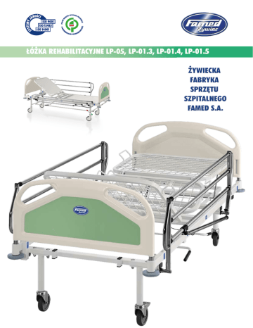 ŁÓŻKA REHABILITACYJNE LP-05, LP-01.3, LP-01.4, LP-01.5 ŁÓŻKO REHABILITACYJNE LP-05 Przeznaczenie łóżek Łóżka LP-05, LP-01.3, LP-01.4 i LP-01.5 przeznaczone są do do leżenia dla dorosłych pacjentów szpitali w czasie diagnozowania, monitorowania i leczenia chorób. Budowa łóżka LP-05 Konstrukcja łóżka wykonana jest z profili stalowych, pokrytych lakierem proszkowym, poliestrowo-epoksydowym. Wersje leż, wypełnień poszczególnych segmentów leż, sposobów regulacji, wersje podwozi i opcjonalne rozwiązania pokazane są na stronach 2–5. Rama leża Wypełnienie segmentów leża (dostępne wersje na str. 4) 3 Szczyt (dostępne wersje na stronach 8 i 9) 4 Podwozie (dostępne wersje na stronie 5) 5 Mechanizm regulacji segmentu oparcia pleców (dostępne wersje na stronie 5) 6 Mechanizm regulacji segmentu uda (dostępne wersje na stronie 5) 7 Podpórka segmentu podudzia w łóżku czterosekcyjnym lub segmentu oparcia nóg w leżu trzysekcyjnym (standard) 8 Listwa odbojowa (opcja) 9 Półka na pościel (opcja) 10 Poręcz boczna (dostępne wersje na stronie 10) 11 Krążek odbojowy (standard) 12 Gniazdo mocowania uchwytu ręki lub wieszaka kroplówki (standard) 13 Haczyki na woreczki do płynów fizjologicznych (standard) Łóżko rehabilitacyjne LP-05 dwusekcyjne (z wyposażeniem opcjonalnym) Łóżko rehabilitacyjne LP-05 trzysekcyjne (z wyposażeniem opcjonalnym) Łóżko rehabilitacyjne LP-05 czterosekcyjne (z wyposażeniem opcjonalnym) 1 2 Produkt spełnia wymagania Dyrektywy Rady 93/42/EEC dotyczącej wyrobów medycznych oraz Ustawy o wyrobach medycznych 12 3 7 DANE TECHNICZNE Całkowita długość Całkowita szerokość Wysokość leża Kąt uniesienia segmentu oparcia pleców Kąt uniesienia segmentu uda (tylko dla czterosekcyjnej wersji leża) Kąt uniesienia segmentu oparcia nóg (tylko dla trzysekcyjnej wersji leża) Średnica kółek Dopuszczalne obciążenie 2 2 10 13 4 2165 mm 965 mm 500 mm 70 º 5 1 34 º 15 º 125 mm 200 kg 8 6 9 11 Łóżko rehabilitacyjne LP-05 czterosekcyjne (z wyposażeniem opcjonalnym) 3 Dostępne wersje wypełnień segmentów leża Dostępne opcje Wersje podwozia: PL-45.0. Podwozie z kołami, z których dwa posiadają indywidualną blokadę PL-45.1. Podwozie z kołami z centralną blokadą PL-45.2 Podwozie bez kół Dodatkowe elementy: Wersja leża 2-segmentowa 3-segmentowa 4-segmentowa 4 Symbol Segment oparcia pleców Segment oparcia nóg Segment uda Segment podudzia PL-44.0 wyjmowana siatka wyjmowana siatka – – PL-44.1 płyta laminatowa wyjmowana siatka – – PL-44.2 ABS wyjmowana siatka – – PL-42.0 wyjmowana siatka wyjmowana siatka – – PL-42.1 płyta laminatowa płyta laminatowa – – PL-42.2 ABS ABS – – PL-42.3 płyta laminatowa wyjmowana siatka – – PL-40.0 wyjmowana siatka – wyjmowana siatka wyjmowana siatka PL-40.1 płyta laminatowa – płyta laminatowa płyta laminatowa PL-40.2 ABS – ABS ABS PL-40.3 płyta laminatowa – wyjmowana siatka wyjmowana siatka PL-40.4 płyta laminatowa – ABS ABS Półka na pościel PL-46.0 Listwa odbojowa WL-17.0 Sprężyna gazowa Mechanizm zapadkowy Mechanizmy regulacyjne: Wersja leża 2-segmentowa 3-segmentowa 4-segmentowa Symbol Segment oparcia pleców Segment oparcia nóg Segment uda Segment podudzia PL-41.0 sprężyna gazowa – – – PL-41.1 mechanizm zapadkowy – – – PL-41.0 sprężyna gazowa podpórka – – PL-41.1 mechanizm zapadkowy podpórka – – PL-39.0 sprężyna gazowa – sprężyna gazowa podpórka PL-39.1 mechanizm zapadkowy – mechanizm zapadkowy podpórka PL-39.2 sprężyna gazowa – mechanizm zapadkowy podpórka 5 ŁÓŻKA REHABILITACYJNE LP-01.3, LP-01.4 Budowa łóżek LP-01.3, LP-01.4 • Konstrukcja łóżek wykonana jest z profili stalowych, pokrytych lakierem proszkowym, poliestrowo-epoksydowym • Segmenty leża wypełnione są na stałe siatką metalową • Oparcie pleców regulowane jest ręcznie i stabilizowane mechanizmem zapadkowym • Wyjmowane wypełnienia szczytów wykonane są z płyty wiórowej, laminowanej • W łóżku LP-01.3 nogi wyposażone są w krążki odbojowe i koła jezdne, z których 2 posiadają blokadę jazdy i obrotu • Łóżko LP-01.4 nie posiada w nogach krążków odbojowych i kół jezdnych 1 2 3 4 5 6 7 8 9 Rama leża Segment oparcia pleców Szczyt z wyjmowanym wypełnieniem (dostępne wersje szczytów na stronie 8) Koło jezdne (standard w LP-01.3) Krążek odbojowy (standard w LP-01.3) Listwa odbojowa (opcja) Poręcz boczna (dostępne wersje na stronie 10) Gniazdo mocowania uchwytu ręki (standard w LP-01.3 i LP-01.4) Haczyki na woreczki do płynów fizjologicznych (standard w LP-01.3 i LP-01.4) ŁÓŻKO REHABILITACYJNE LP-01.5 DANE TECHNICZNE LP-01.3 LP-01.4 Całkowita długość Całkowita szerokość Wysokość leża Kąt uniesienia segmentu oparcia pleców Średnica kółek Dopuszczalne obciążenie 2230 mm 1040 mm 500 mm 2175 mm 925 mm 500 mm 70 º 70 º 125 mm 170 kg – 170 kg Opcje wykonania: Budowa łóżka LP-01.5 DANE TECHNICZNE LP-01.5 • Konstrukcja łóżka wykonana jest z profili stalowych, pokrytych lakierem proszkowym, poliestrowo-epoksydowym • Segmenty leża wypełnione są na stałe siatką metalową • Oparcie pleców regulowane jest ręcznie i stabilizowane mechanizmem zapadkowym • Wyjmowane szczyty posiadają wyjmowane wypełnienia wykonane z płyty wiórowej laminowanej • Łóżko wyposażone jest w krążki odbojowe i koła jezdne, z których dwa posiadają blokadę jazdy i obrotu Wysokość leża Kąt uniesienia segmentu oparcia pleców Średnica kółek Dopuszczalne obciążenie DOSTĘPNE WERSJE GABARYTOWE Wersja II (długość x szerokość) Wersja III (długość x szerokość) Wersja IV (długość x szerokość) Opcje wykonania: • Segmenty leża wypełnione płytą laminatową • Oparcie pleców regulowane za pomocą sprężyny gazowej z blokadą • Listwa odbojowa Łóżka LP-01.3 i LP-01.4 spełniają wymagania Dyrektywy Rady 93/42/EEC dotyczącej wy