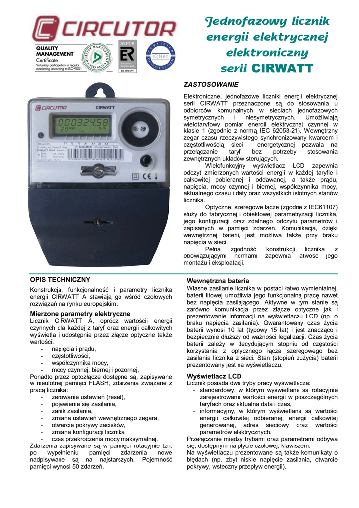 Jednofazowy licznik energii elektrycznej elektroniczny serii CIRWATT ZASTOSOWANIE Elektroniczne, jednofazowe liczniki energii elektrycznej serii CIRWATT przeznaczone są do stosowania u odbiorców komunalnych w sieciach jednofazowych symetrycznych i niesymetrycznych. Umożliwiają wielotaryfowy pomiar energii elektrycznej czynnej w klasie 1 (zgodnie z normą IEC 62053-21). Wewnętrzny zegar czasu rzeczywistego synchronizowany kwarcem i częstotliwością sieci energetycznej pozwala na przełączanie taryf bez potrzeby stosowania zewnętrznych układów sterujących. Wielofunkcyjny wyświetlacz LCD zapewnia odczyt zmierzonych wartości energii w każdej taryfie i całkowitej pobieranej i oddawanej, a także prądu, napięcia, mocy czynnej i biernej, współczynnika mocy, aktualnego czasu i daty oraz wszystkich istotnych stanów licznika. Optyczne, szeregowe łącze (zgodne z IEC61107) służy do fabrycznej i obiektowej parametryzacji licznika, jego konfiguracji oraz zdalnego odczytu parametrów i zapisanych w pamięci zdarzeń. Komunikacja, dzięki wewnętrznej baterii, jest możliwa także przy braku napięcia w sieci. Pełna zgodność konstrukcji licznika z obowiązującymi normami zapewnia łatwość jego montażu i eksploatacji. OPIS TECHNICZNY Wewnętrzna bateria Konstrukcja, funkcjonalność i parametry licznika energii CIRWATT A stawiają go wśród czołowych rozwiązań na rynku europejskim. Własne zasilanie licznika w postaci łatwo wymienialnej, baterii litowej umożliwia jego funkcjonalną pracę nawet bez napięcia zasilającego. Aktywne w tym stanie są zarówno komunikacja przez złącze optyczne jak i prezentowanie informacji na wyświetlaczu LCD (np. o braku napięcia zasilania). Gwarantowany czas życia baterii wynosi 10 lat (typowy 15 lat) i jest znacząco i bezpiecznie dłuższy od ważności legalizacji. Czas życia baterii zależy w decydującym stopniu od częstości korzystania z optycznego łącza szeregowego bez zasilania licznika z sieci. Stan (stopień zużycia) baterii prezentowany jest na wyświetlaczu. Mierzone parametry elektryczne Licznik CIRWATT A, oprócz wartościi energii czynnych dla każdej z taryf oraz energii całkowitych wyświetla i udostępnia przez złącze optyczne także wartości: - napięcia i prądu, - częstotliwości, - współczynnika mocy, - mocy czynnej, biernej i pozornej, Ponadto przez optozłącze dostępne są, zapisywane w nieulotnej pamięci FLASH, zdarzenia związane z pracą licznika: - zerowanie ustawień (reset), - pojawienie się zasilania, - zanik zasilania, - zmiana ustawień wewnętrznego zegara, - otwarcie pokrywy zacisków, - zmiana konfiguracji licznika - czas przekroczenia mocy maksymalnej. Zdarzenia zapisywane są w pamięci rotacyjnie tzn. po wypełnieniu pamięci zdarzenia nowe nadpisywane są na najstarszych. Pojemność pamięci wynosi 50 zdarzeń. Wyświetlacz LCD Licznik posiada dwa tryby pracy wyświetlacza: - standardowy, w którym wyświetlane są rotacyjnie zarejestrowane wartości energii w poszczególnych taryfach oraz aktualna data i czas, - informacyjny, w którym wyświetlane są wartości energii całkowitej odbieranej, energii całkowitej generowanej, adres sieciowy oraz wartości parametrów elektrycznych. Przełączanie między trybami oraz parametrami odbywa się, dostępnym na płycie czołowej, klawiszem. Na wyświetlaczu prezentowane są także komunikaty o błędach (np. zbyt niskie napięcie zasilania, otwarcie pokrywy, wsteczny przepływ energii). Konfigurowanie licznika W liczniku można zaprogramować jeden kontrakt z dwoma typami dni (profilami): - robocze tzn. każdy poniedziałek, wtorek, środa, czwartek, piątek (profil 1), - świąteczne tzn. każda sobota, niedziela i maksymalnie 15 dodatkowych dni w roku zaznaczonych w kalendarzu (profil 2), przy czym załączaniem taryf i przełączaniem profili steruje wewnętrzny zegar czasu rzeczywistego. Zegar dokonuje automatycznej zmiany czasu z letniego na zimowy i odwrotnie. Posiada także kalendarz, w którym można zaprogramować dodatkowe, ruchome dni świąteczne (poza weekend’ami) na 15 lat. Dla każdego z profili można ustawić inny plan taryfowy (strefy czasowe), a dla każdej taryfy maksymalną moc, której przekroczenie będzie zapisywane w pamięci zdarzeń. Programowanie planu taryfowego odbywa się przez złącze optyczne np. przy pomocy programu SoftWatt. Podłączenie licznika Rozkład zacisków Parametry techniczne: Nominalne napięcie pracy Dopuszczalny zakres napięcia Częstotliwość pracy Pobór mocy wejścia napięciowego Pobór mocy wejścia prądowego Prąd bazowy / maksymalny Prąd startowy Prąd szczytowy (Idyn) Dokładność pomiaru energii czynnej Współczynnik temperaturowy (typ.) Wyświetlacz Pojemność rejestrów energii Wewnętrzny zegar: Synchronizacja Stabilność pracy Wewnętrzna pamięć: Dane pomiarowe Konfiguracja i zdarzenia Czas życia baterii Wyjście impulsowe: Typ wyjścia Maksymalne napięcie Maksymalny prąd Stała impulsowania Długość impulsów Maksymalna częstość impulsów Trwałość działania Dioda testowa: Typ wyjścia Stała impulsowania Długość impulsów Częstość impulsów Trwałość działania Złącze optyczne: Typ Prędkość transmisji Protokół transmisji Konstrukcja: Obudowa Wymiary 230 Vac 184 ÷ 276 Vac 50/60 Hz ≤ 6 VA ≤ 0,22 VA 5 / 60 Aac 10 / 120 Aac 0,1 % Ib ≥ 30 Imax 1% ± 0,02 %/°C LCD 999 999,99 kWh kwarc i/lub sieć ≤ 0,5 s / dzień SRAM z baterią FLASH EPROM ≥ 10 lat Otwarty kolektor 24 Vdc 50 mAdc 1000 imp./kWh 50 ms ≤ 10 Hz nielimitowana LED 1000 imp./kWh 50 ms ≤ 10 Hz nielimitowana szeregowe, dwukierunkowe 300 ÷ 9600 bod IEC 61107 DIN 43859 125x125x42 mm DIN 43857 -20 ÷ 60°C -40 ÷ 80°C IP51 II (300 Vac) 2 kV/50 Hz, 1 min. 8 kV, 1.2/50 µs Temperatura pracy: Temperatura przechowywania Stopień ochrony Kategoria bezpieczeństwa Napięcie probiercze Napięcie udarowe Normy związane: IEC61036, IEC62053-21, IEC61107, EN61010, EN55
