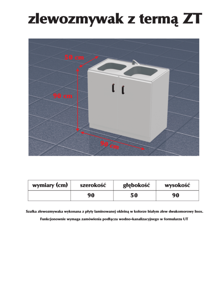 zlewozmywak z term¹ ZT 50 cm 90 cm 90 cm wymiary (cm) szerokoœæ 90 g³êbokoœæ 50 wysokoœæ 90 Szafka zlewozmywaka wykonana z p³yty laminowanej oklein¹ w kolorze bia³ym zlew dwukomorowy Inox. Funkcjonownie wymaga zamówienia pod³¹cza wodno-kanalizacyjnego w formularzu UT