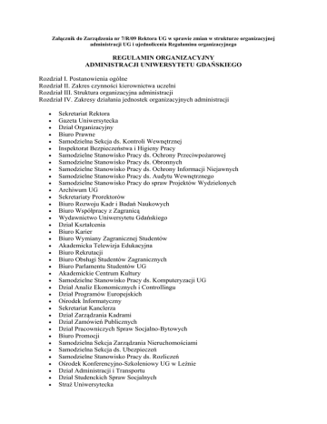 Załącznik do Zarządzenia nr 7/R/09 Rektora UG w sprawie zmian w strukturze organizacyjnej administracji UG i ujednolicenia Regulaminu organizacyjnego REGULAMIN ORGANIZACYJNY ADMINISTRACJI UNIWERSYTETU GDAŃSKIEGO Rozdział I. Postanowienia ogólne Rozdział II. Zakres czynności kierownictwa uczelni Rozdział III. Struktura organizacyjna administracji Rozdział IV. Zakresy działania jednostek organizacyjnych administracji • • • • • • • • • • • • • • • • • • • • • • • • • • • • • • • • • • • • • • • • Sekretariat Rektora Gazeta Uniwersytecka Dział Organizacyjny Biuro Prawne Samodzielna Sekcja ds. Kontroli Wewnętrznej Inspektorat Bezpieczeństwa i Higieny Pracy Samodzielne Stanowisko Pracy ds. Ochrony Przeciwpożarowej Samodzielne Stanowisko Pracy ds. Obronnych Samodzielne Stanowisko Pracy ds. Ochrony Informacji Niejawnych Samodzielne Stanowisko Pracy ds. Audytu Wewnętrznego Samodzielne Stanowisko Pracy do spraw Projektów Wydzielonych Archiwum UG Sekretariaty Prorektorów Biuro Rozwoju Kadr i Badań Naukowych Biuro Współpracy z Zagranicą Wydawnictwo Uniwersytetu Gdańskiego Dział Kształcenia Biuro Karier Biuro Wymiany Zagranicznej Studentów Akademicka Telewizja Edukacyjna Biuro Rekrutacji Biuro Obsługi Studentów Zagranicznych Biuro Parlamentu Studentów UG Akademickie Centrum Kultury Samodzielne Stanowisko Pracy ds. Komputeryzacji UG Dział Analiz Ekonomicznych i Controllingu Dział Programów Europejskich Ośrodek Informatyczny Sekretariat Kanclerza Dział Zarządzania Kadrami Dział Zamówień Publicznych Dział Pracowniczych Spraw Socjalno-Bytowych Biuro Promocji Samodzielna Sekcja Zarządzania Nieruchomościami Samodzielna Sekcja ds. Ubezpieczeń Samodzielne Stanowisko Pracy ds. Rozliczeń Ośrodek Konferencyjno-Szkoleniowy UG w Leźnie Dział Administracji i Transportu Dział Studenckich Spraw Socjalnych Straż Uniwersytecka • • • • • • • • • • • • • Dział Inwestycji i Rozwoju Zespół do spraw Realizacji Inwestycyjnych Projektów Unijnych Samodzielna Grupa Remontowa Dział Finansowy Dział Księgowości Finansowej Dział Obsługi Kasowej Dział Obliczeń Płac Dział Gospodarowania Rzeczowymi Składnikami Majątku Dział Ewidencji Projektów Zagranicznych Kasa Pożyczkowa (Obsługa) Samodzielne Stanowisko Pracy ds. Informatycznych Systemów FinansowoKsięgowych Dziekanaty Wydziałów Sekretariaty jednostek organizacyjnych Rozdział I Postanowienia ogólne §1 Stosowane w niniejszym regulaminie określenia należy rozumieć w następujący sposób: - “Uczelnia” - oznacza Uniwersytet Gdański, - “jednostka organizacyjna” - oznacza wydział, instytut, katedrę, zakład, studium, kolegium, laboratorium, pracownię, ośrodek, bibliotekę, archiwum, dziekanat, dział, biuro, samodzielną sekcję, zespół, samodzielną grupę, samodzielne stanowisko pracy, sekretariat, administrację obiektu. §2 1. Administrację Uniwersytetu Gdańskiego stanowią jednostki organizacyjne, które poprzez swoją działalność zapewniają warunki dla realizacji ustawowych i statutowych funkcji Uniwersytetu, w tym zwłaszcza badawczych i dydaktycznych, a także organizują pomoc socjalną dla pracowników i studentów oraz uczestniczą w zarządzaniu mieniem uczelni. 2. Administracja uczelni dzieli się na: a/ administrację centralną, która uczestniczy w realizacji zadań Rektora i Kanclerza oraz wykonuje inne zadania określone w niniejszym regulaminie; b/ administrację jednostek organizacyjnych, w szczególności wydziałów, jednostek pozawydziałowych, międzywydziałowych i ogólnouczelnianych, która uczestniczy w realizacji zadań tych jednostek. 3. Pracą administracji centralnej kieruje Kanclerz. 4. Pracą administracji jednostek organizacyjnych kierują kierownicy tych jednostek. §3 1. Kanclerza zatrudnia i zwalnia Rektor po zasięgnięciu opinii Senatu. 2. W celu wyłonienia kandydata na stanowisko Kanclerza, Rektor może przeprowadzić konkurs otwarty. §4 Zastępców Kanclerza zatrudnia i zwalnia Rektor na wniosek Kanclerza. §5 1. Kwestora powołuje i odwołuje Rektor na wniosek Kanclerza. 2. Kwestor pełni funkcję głównego księgowego i jest pierwszym zastępcą Kanclerza. 3. Zastępców Kwestora powołuje Kanclerz na wniosek Kwestora. §6 1. Innych, niż wymienieni w §§ 3, 4 i 5 pracowników niebędących nauczycielami akademickimi, zatrudnia Rektor na wniosek kierownika właściwej jednostki organizacyjnej. 2. Rektor w drodze stosownego pełnomocnictwa może przekazać Kanclerzowi kompetencje do dokonywania czynności w sprawach zakresu prawa pracy dotyczących pracowników niebędących nauczycielami akademickimi w tym do zawierania i rozwiązywania z nimi umów o pracę. §7 1. Struktury organizacyjne administracji stosownie do potrzeb tworzy Rektor. 2. Jednostki organizacyjne administracji mogą być tworzone na szczeblu: - działu, - biura, - zespołu, - samodzielnej sekcji, - samodzielnej grupy, - samodzielnego stanowiska pracy. 3. Samodzielne stanowiska pracy mogą być tworzone jako jednoosobowe lub wieloosobowe. 4. W administracji centralnej i w jednostkach organizacyjnych mogą być tworzone inne, niż wymienione w ust. 2 struktury organizacyjne np. biura, pracownie, ośrodki, centra - dla obsługi administracyjnej określonych zadań. Rozdział II Zakresy czynności kierownictwa administracji uczelni §8 Kanclerz Uniwersytetu Gdańskiego kieruje administracją uczelni, zarządza mieniem i gospodarką w zakresie określonym przez przepisy prawa, Statut UG oraz Regulamin organizacyjny Uniwersytetu Gdańskiego. Do szczegółowego zakresu obowiązków Kanclerza UG należy: - Zarządzanie mieniem i gospodarką Uczelni oraz podejmowanie decyzji dotyczących tych spraw w zakresie zwykłego zarządu. - Zgłaszanie Rektorowi wniosków o wyrażenie zgody na powzięcie decyzji w sprawach wykraczających poza zakres zwykłego zarządu. - Tworzenie materia