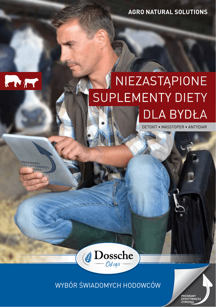 Agro Natural Solutions NIEZASTĄPIONE SUPLEMENTY DIETY DLA BYDŁA DETOXIT • MASSTOPER • AntyDiar WYBÓR ŚWIADOMYCH HODOWCÓW Dossche wprowadza na rynek Polski produkty firmy Agro Natural Solutions. To seria skutecznych preparatów pomagających zwalczać wysoki poziom komórek somatycznych i biegunki. Oferta ta skierowana jest zarówno do hodowców, jak i do lekarzy weterynarii. Produkty ANS, powstałe przy wykorzystaniu wiedzy z zakresu ziołolecznictwa i najnowszych badań fizjologii bydła, zostały wybrane jako idealne uzupełnienie oferty Dossche. Są doceniane przez hodowców w całej Europie ze względu na ich wpływ na ograniczenie konieczności stosowania antybiotyków, co jest możliwe dzięki zastosowaniu czynnych związków naturalnych. DETOXIT oczyszcza organizm i przywraca prawidłowy metabolizm Wątroba jest jednym z najważniejszych organów. Nadmierna mobilizacja zapasów tłuszczowych stanowi duże obciążenie dla wątroby i może prowadzić do jej stłuszczenia. Skutki otłuszczenia wątroby widoczne są głównie we wczesnej laktacji. Otłuszczenie wątroby to także: niższa wydajność mleczna, problemy z płodnością, wysoka liczba komórek somatycznych, ketoza, choroby racic, przemieszczenie trawieńca, zapalenie wymion czy stany zapalne macicy. Działanie: Efekty: DETOXIT oczyszcza organizm i przywraca prawidłowy metabolizm Pobudzenie apetytu - większe spożycie suchej masy Lepsze trawienie i metabolizm - zwiększenie rozkładu błonnika Oczyszczenie z toksyn Zwiększenie odporności Poprawa rozrodu Skład: Ostropest plamisty, sylibinin (badania naukowe wykazały, że jest on jednym z najbardziej skutecznych hepatoprotectorów) Dawkowanie na 1 krowę: 50 ml dziennie, przez 20 dni OBJĘTOŚĆ OPAKOWANIA: 1L MASSTOPER poprawia stan zdrowotny wymienia Mastitis to najpowszechniejsza choroba wymienia u krów. Ten stan zapalny często nie dotyka pojedynczych zwierząt. W przypadku zaobserwowania go u jednej sztuki – bezpośrednio zagrożone jest całe stado. Skutki mastitis mogą być bardzo dotkliwe dla producenta mleka, dlatego należy bezwzględnie mu przeciwdziałać. Działanie: Efekty: Poprawia stan zdrowotny wymienia. Produkt bezkarencyjny przy produkcji mleka Zwiększenie produkcji mleka Silne działanie na gruczoł mleczny, powodujące obniżenie liczby komórek somatycznych Skład: Oregano i tymol - środki silnie dezynfekujące Dawkowanie na 1 krowę: jedna wlewka 500ml, gdy brak poprawy powtórzyć po 1-2 dniach OBJĘTOŚĆ OPAKOWANIA: 0,5L AntyDiar wspomaga prawidłowe działanie flory jelitowej Biegunki cieląt stanowią od lat jeden z największych problemów, z którym borykają się hodowcy. To one są najczęstszą przyczyną upadków u cieląt co w konsekwencji powoduje znaczne straty ekonomiczne. Biegunka wywołuje często objawy nerwowe jak: niezborność, zaleganie, zanikanie odruchu ssania a nawet kwasica metaboliczna czy śpiączka. Działanie: Efekty: AntyDiar to przeciwbiegunkowy suplement diety, którego stosowanie poprawia pracę jelit Poprawa trawienia Przywrócenie równowagi flory bakteryjnej w jelitach Neutralizacja działania pasożytów jelitowych Skład: Glinka mineralna i węglan wapnia oraz substancje smakowe i zapachowe (oregano) Dawkowanie na 1 CIELĘ: 2x15ml dziennie, przez 2 dni OBJĘTOŚĆ OPAKOWANIA: 60ml Opakowanie AntyDiar ma formę specjalnej szprycy z podziałką ułatwiającą jego dawkowanie, co oznacza, że nabyty specyfik gotowy jest do użycia bez potrzeby stosowania jakichkolwiek innych akcesoriów. Przy zwalczaniu biegunki oprócz zastosowania AntyDiar nie zapominajmy o dostarczeniu elektrolitów, a także odpowiednim dobrostanie i odosobnionych suchych oraz dobrze wentylowanych boksach dla chorych zwierząt. DOSSCHE Sp. z o.o. 62-800 Kalisz ul. Obozowa 32-36 tel.: 62 75387 00 fax: 62 753 87 07 www.dossche.com.pl NOWE OBLICZE UZNANEJ MARKI Siła i ponad100-letnie doświadczenie grupy Dossche Pasja tworzenia najlepszych pasz z polskich zbóż