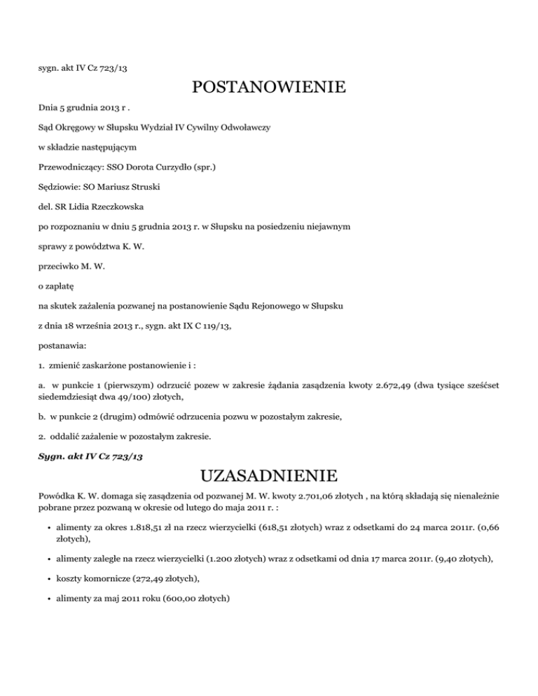 sygn. akt IV Cz 723/13 POSTANOWIENIE Dnia 5 grudnia 2013 r . Sąd Okręgowy w Słupsku Wydział IV Cywilny Odwoławczy w składzie następującym Przewodniczący: SSO Dorota Curzydło (spr.) Sędziowie: SO Mariusz Struski del. SR Lidia Rzeczkowska po rozpoznaniu w dniu 5 grudnia 2013 r. w Słupsku na posiedzeniu niejawnym sprawy z powództwa K. W. przeciwko M. W. o zapłatę na skutek zażalenia pozwanej na postanowienie Sądu Rejonowego w Słupsku z dnia 18 września 2013 r., sygn. akt IX C 119/13, postanawia: 1. zmienić zaskarżone postanowienie i : a. w punkcie 1 (pierwszym) odrzucić pozew w zakresie żądania zasądzenia kwoty 2.672,49 (dwa tysiące sześćset siedemdziesiąt dwa 49/100) złotych, b. w punkcie 2 (drugim) odmówić odrzucenia pozwu w pozostałym zakresie, 2. oddalić zażalenie w pozostałym zakresie. Sygn. akt IV Cz 723/13 UZASADNIENIE Powódka K. W. domaga się zasądzenia od pozwanej M. W. kwoty 2.701,06 złotych , na którą składają się nienależnie pobrane przez pozwaną w okresie od lutego do maja 2011 r. : • alimenty za okres 1.818,51 zł na rzecz wierzycielki (618,51 złotych) wraz z odsetkami do 24 marca 2011r. (0,66 złotych), • alimenty zaległe na rzecz wierzycielki (1.200 złotych) wraz z odsetkami od dnia 17 marca 2011r. (9,40 złotych), • koszty komornicze (272,49 złotych), • alimenty za maj 2011 roku (600,00 złotych) Zaskarżonym postanowieniem Sąd Rejonowy w Słupsku, w sprawie o sygn.. akt IX C 119/13 z powództwa K. W. przeciwko M. W. o zapłatę odmówił odrzucenia pozwu. Uzasadniają swoje rozstrzygnięcie wskazał, że zgodnie z treścią art. 199 § 1 pkt 2 k.p.c., sąd odrzuci pozew, jeżeli o to samo roszczenie pomiędzy tymi samymi stronami sprawa jest w toku albo została już prawomocnie osądzona. Ponadto, odwołując się do postanowienia Sądu Apelacyjnego w Szczecinie z dnia 22 sierpnia 2012r. (sygn. akt III AUz 49/12) zważył, że zakres powagi rzeczy osądzonej pod względem przedmiotowym wyznaczony jest zakresem rozstrzygnięcia, nie zaś zakresem żądania, zgłoszonego przez powódkę w niniejszym postępowaniu. Wyjaśnił przy tym, że żądania powódki pokrywało się we wskazanym zakresie z żądaniem zgłoszonym przez nią w sprawie prowadzonej przez Sąd Rejonowy o alimenty (sygn. akt III RC 449/12), ale dostrzegł także, iż na rozprawie powódka cofnęła to żądanie w tożsamym zakresie, a prawomocnym wyrokiem z dnia 19 czerwca 2013r. Sąd Rejonowy zasądził od pozwanej na rzecz powódki alimenty po 300 zł miesięcznie, płatne od 9 maja 2012r. do 10-go każdego miesiąca z góry z ustawowymi odsetkami, a w pozostałym zakresie powództwo oddalił. Na tej podstawie doszedł też do przekonania, że wspomnianym wyrokiem Sąd Rejonowy nie rozstrzygnął o żądaniu tożsamym, objętym pozwem w niniejszej sprawie, a strony nie wnosiły o uzupełnienie orzeczenia i wobec tego, na podstawie art. 199 § 1 pkt 2 k.p.c. a contrario odmówił odrzucenia pozwu. Z powyższym rozstrzygnięciem nie zgodziła się pozwana, która złożyła za pośrednictwem pełnomocnika zażalenie, zaskarżając postanowienie Sądu Rejonowego w całości oraz wnosząc o jego zmianę. W obszernym uzasadnieniu wniesionego środka odwoławczego skarżąca podniosła między innymi, że cofnięcie na rozprawie (III RC 449/12) przez ojca powódki powództwa w zakresie żądania przez nią zwrotu zajętych w drodze postępowania komorniczego alimentów za okres od lutego do maja 2011r. w łącznej wysokości 2.400 zł wraz z kosztami postępowania egzekucyjnego w wysokości 272,49 zł, a ostatecznie, po zmodyfikowaniu powództwa – w zakresie żądania zasądzenia alimentów w wysokości 600 zł miesięcznie, poczynając od lutego 2011r. oraz po 1.000 zł miesięcznie, począwszy od 9 maja 2012r., nie było skuteczne, ponieważ pozwana nie wyraziła na powyższe zgody, a powódka nie zrzekła się jednocześnie prawa do dochodzenia wskazanego roszczenia. Zdaniem skarżącej, Sąd Rejonowy nie był zatem uprawniony do uwzględnienia tej okoliczności, jako przesądzającej o braku podstaw do odrzucenia pozwu w przedmiotowej sprawie. Ponadto, w ocenie skarżącej, Sąd Rejonowy w punkcie 2 prawomocnego wyroku z dnia 19 czerwca 2013r., wydanym w sprawie III RC 449/12, oddalając powództwo w pozostałej części odniósł się także merytorycznie do żądania dochodzonego w niniejszym postępowaniu, albowiem w braku zgody pozwanej na cofnięcie powództwa w spornym zakresie stanowiło ono przedmiot rozstrzygnięcia tego Sądu w przywołanym wyroku. Z powyższych względów skarżąca wyraziła przekonanie, że Sąd Rejonowy w sprawie III RC 449/12 rozstrzygnął o żądaniu tożsamym, objętym niniejszym postępowaniem, a zatem, na gruncie przepisów art. 365 § 1 k.p.c. w zw. z art. 366 k.p.c., zachodzi powaga rzeczy osądzonej, uzasadniająca odrzucenie pozwu w trybie art. 199 § 1 pkt 2 k.p.c. Sąd Okręgowy zważył, co następuje: Zażalenie w przeważającej części zasługiwało na uwzględnienie. Sąd Okręgowy nie podziela poglądu Sądu Rejonowego, że w niniejszej sprawie nie zostały spełnione przesłanki uzasadniające odrzucenie pozwu, określone w art. 199 § 1 pkt 2 k.p.c. Powaga rzeczy osądzonej zachodzi zarówno w przypadku wyroków uwzględniających, jak i oddalających powództwo. Z res iudicata będziemy mieli do czynienia w takich sytuacjach, w których zapadło już prawomocne rozstrzygnięcie, dotyczące tego samego przedmiotu postępowania, jakie toczyło się między tymi samymi stronami. Jednakże do uznania, iż sprawa została już prawomocnie osądzona, koniecznym jest stwierdzenie, że w obu sprawach chodzi o to samo roszczenie, strony obydwu procesów są identyczne oraz, że utrzymują się te same okoliczności, które stanowiły podstawę rozstrzygnięcia w pierwszej sprawie. A zatem stanowczo należy stwierdzić, że tożsamość roszczenia, w rozumieniu art. 199 § 1 pkt 2 k.p.c. zachodzi tylko 