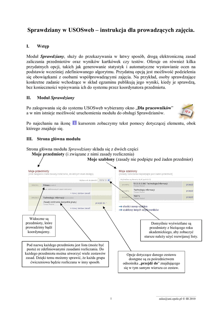 Sprawdziany w USOSweb – instrukcja dla prowadzących zajęcia. I. Wstęp Moduł Sprawdziany, służy do przekazywania w łatwy sposób, drogą elektroniczną zasad zaliczania przedmiotów oraz wyników kartkówek czy testów. Oferuje on również kilka przydatnych opcji, takich jak generowanie statystyk i automatyczne wystawianie ocen na podstawie wcześniej zdefiniowanego algorytmu. Przydatną opcją jest możliwość podzielenia się obowiązkami z osobami współprowadzącymi zajęcia. Na przykład, osoby sprawdzające konkretne zadanie wchodzące w skład egzaminu publikują jego wyniki, kiedy je sprawdzą, bez konieczności wpisywania ich do systemu przez koordynatora przedmiotu. II. Moduł Sprawdziany Po zalogowaniu się do systemu USOSweb wybieramy okno „Dla pracowników” a w nim istnieje możliwość uruchomienia modułu do obsługi Sprawdzianów. Po najechaniu na ikonę którego znajduje się. kursorem zobaczymy tekst pomocy dotyczącej elementu, obok III. Strona główna modułu Strona główna modułu Sprawdziany składa się z dwóch części Moje przedmioty (i związane z nimi zasady rozliczenia) Moje szablony (zasady nie podpięte pod żaden przedmiot) Widoczne są przedmioty, które prowadzimy bądź koordynujemy. Domyślnie wyświetlane są przedmioty z bieżącego roku akademickiego, aby zobaczyć starsze należy użyć rozwijanej listy. Pod nazwą każdego przedmiotu jest lista (może być pusta) ze zdefiniowanymi zasadami rozliczania. Do każdego przedmiotu można utworzyć wiele zestawów zasad. Dzięki temu możemy sprawić, że każda grupa ćwiczeniowa będzie rozliczana w inny sposób. Opcje dotyczące danego zestawu dostępne są za pośrednictwem odnośnika „przejdź do” znajdującego się w tym samym wierszu co zestaw. 1 [email protected] III 2010 Zestaw zasad rozliczania jest to zbiór zadań i sprawdzianów oraz reguł wyliczania ocen, które obowiązują wszystkich, bądź niektórych (np. jedną z grup) studentów zapisanych na dany przedmiot. W tabeli szablonów znajdują się schematy zasad zaliczania przedmiotów. Jeśli chcemy dla kilku przedmiotów zastosować podobne reguły, to dobrym pomysłem jest utworzenie odpowiedniego szablonu, który później wystarczy nieznacznie zmodyfikować, zamiast za każdym razem definiować wszystko od zera. W tabeli szablonów widoczne są utworzone przez nas szablony. Pod ich nazwą widnieje imię i nazwisko jego autora (możliwe jest korzystanie z cudzych szablonów). Po lewej stronie znajdziemy informację o tym, czy dany szablon jest udostępniony innym pracownikom do kopiowania i odczytu. Jeśli w tym polu widnieje „prywatny” znaczy to, że dostęp do danego szablonu ma tylko jego autor i osoby przez niego upoważnione. W celu dostępu do opcji dotyczących danego szablonu należy użyć odnośnika „przejdź do” po prawej stronie. IV. Tworzenie nowego zestawu zasad W celu utworzenia nowego zestawu dla interesującego nas przedmiotu należy kliknąć w odnośnik „+ nowy zestaw zasad”. Pokaże się strona, na której możemy wybrać czy chcemy stworzyć zestaw od początku, czy też może skorzystać z istniejącego już szablonu. W przypadku tworzenia zasad „od zera” zaczniemy z pustym zestawem i będziemy go stopniowo uzupełniać. Jeśli wybierzemy gotowy szablon, to będziemy go mogli odpowiednio zmodyfikować, aby dokładniej odpowiadał naszym potrzebom. Po dokonaniu wyboru zatwierdzamy przyciskiem Niezależnie od tego czy wybraliśmy szablon, czy zaczynamy tworzyć nowy zestaw zasad od początku, trafiamy na stronę służącą do edycji właściwości danego zestawu. Jeśli tworzymy zasady na bazie szablonu, to zmiany tu wprowadzone nie będą miały żadnego wpływu na szablon, z którego skorzystaliśmy, teraz edytujemy już nowy zestaw utworzony na bazie wybranego szablonu. Po wypełnieniu wymaganych pól możemy kliknąć przycisk „zapisz”, aby zapisać zmiany i opuścić stronę edycji lub „zastosuj” w celu zapisania dokonanych zmian, bez opuszczania strony edycji. 2 [email protected] III 2010 Podpięcie – informacje o tym, jakiego przedmiotu dotyczą edytowane przez nas zasady. Związani studenci – tutaj wskazuje się, których studentów dotyczyć mają tworzone przez nas zasady. Koordynatorzy mogą utworzyć zasady dotyczące wszystkich studentów zapisanych na przedmiot. Prowadzący zajęcia mają uprawnienia jedynie do rozliczania studentów, którzy uczęszczają do grup przez nich prowadzonych. Możliwe jest jednak, aby koordynator utworzył zasady, które dotyczyć będą wszystkich studentów, a następnie nadał osobom prowadzącym ćwiczenia prawo do modyfikowania/uzupełniania tych zasad (o uprawnieniach do edycji zasad będzie mowa ponoiżej) Nazwa – Nazwa dla zestawu. Widoczna dla studentów i osób prowadzących zajęcia. Nazwa (po angielsku) – Opcjonalne pole, które warto wypełnić, jeśli na dany przedmiot uczęszczają osoby zza granicy. Zasady zaliczania – Krótki opis (limit 300 znaków) zasad, według których będą rozliczani studenci. Można tu umieścić informacje o liczbie kartkówek/kolokwiów/zadań i progach punktowych. Jeśli 300 znaków to za mało na opis zawiłości związanych z danym zestawem zasad, to warto umieścić tutaj odnośnik do zasad opublikowanych np. na własnej stronie internetowej. Zasady zaliczania (po angielsku) – Tak jak w przypadku nazwy, warto uzupełnić to pole, jeśli na zajęcia uczęszczają goście zza granicy. Po zapisaniu powyższych informacji wracamy na stronę główną modułu sprawdziany. Teraz należy dokładnie zdefiniować jak mają wyglądać te zasady zaliczania dotyczące wybranego przedmiotu. Klikając w odnośnik „przejdź do” wyświetla się lista, z której wybieramy opcję „widok struktury” Zostaniemy przeniesieni do strony, na której możemy edytować strukturę zasad. Inaczej mówiąc można tutaj dodawać i określać sprawdziany, kartkówki, zadania zaliczeniowe i