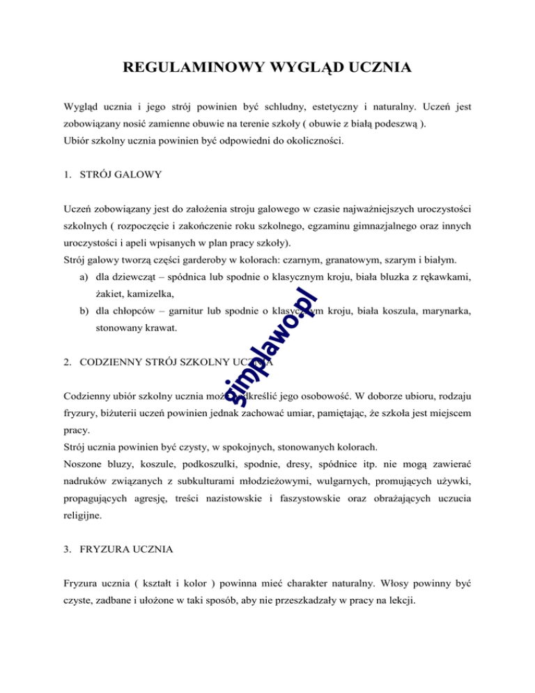 REGULAMINOWY WYGLĄD UCZNIA Wygląd ucznia i jego strój powinien być schludny, estetyczny i naturalny. Uczeń jest zobowiązany nosić zamienne obuwie na terenie szkoły ( obuwie z białą podeszwą ). Ubiór szkolny ucznia powinien być odpowiedni do okoliczności. 1. STRÓJ GALOWY Uczeń zobowiązany jest do założenia stroju galowego w czasie najważniejszych uroczystości szkolnych ( rozpoczęcie i zakończenie roku szkolnego, egzaminu gimnazjalnego oraz innych uroczystości i apeli wpisanych w plan pracy szkoły). Strój galowy tworzą części garderoby w kolorach: czarnym, granatowym, szarym i białym. a) dla dziewcząt – spódnica lub spodnie o klasycznym kroju, biała bluzka z rękawkami, o.p l żakiet, kamizelka, stonowany krawat. pla w b) dla chłopców – garnitur lub spodnie o klasycznym kroju, biała koszula, marynarka, gim 2. CODZIENNY STRÓJ SZKOLNY UCZNIA Codzienny ubiór szkolny ucznia może podkreślić jego osobowość. W doborze ubioru, rodzaju fryzury, biżuterii uczeń powinien jednak zachować umiar, pamiętając, że szkoła jest miejscem pracy. Strój ucznia powinien być czysty, w spokojnych, stonowanych kolorach. Noszone bluzy, koszule, podkoszulki, spodnie, dresy, spódnice itp. nie mogą zawierać nadruków związanych z subkulturami młodzieżowymi, wulgarnych, promujących używki, propagujących agresję, treści nazistowskie i faszystowskie oraz obrażających uczucia religijne. 3. FRYZURA UCZNIA Fryzura ucznia ( kształt i kolor ) powinna mieć charakter naturalny. Włosy powinny być czyste, zadbane i ułożone w taki sposób, aby nie przeszkadzały w pracy na lekcji. 4. OZDOBY I BIZUTERIA Dziewczęta nie powinny stosować makijażu ani malować paznokci. Biżuteria oraz wszelkie elementy dekoracyjne nie mogą mieć subkulturowych ani agresywnych akcesów. Dopuszczalne jest noszenie delikatnych ozdób na szyi i przegubach, małych pierścionków. Dziewczęta mogą nosić skromne kolczyki ( po jednym kolczyku w opuszku ucha). Z uwagi na bezpieczeństwo biżuterię powinno zdejmować się na lekcjach wychowania fizycznego. 5. ZABRANIA SIĘ : farbowania i przesadnego żelowania włosów, • stosowania makijażu, • noszenia tipsów, długich paznokci oraz ich malowania, • posiadania tatuaży, • noszenia gadżetów militarnych, • noszenia ekstrawaganckich ozdób oraz kolczyków wpinanych w ciało w różnych pla w o.p l • miejscach oprócz ucha i w różnych ilościach, ubierania zbyt krótkich spódnic lub szortów , • noszenia ubiorów przezroczystych, odsłaniających bieliznę, ramiona, plecy, brzuch, głębokich dekoltów, • gim • zakładania czapek lub innych okryć głowy, okularów przeciwsłonecznych. Wygląd zewnętrzny ucznia nie może mieć wpływu na oceny z przedmiotu. Za nieprzestrzeganie przepisów dotyczących wyglądu i stroju uczeń otrzymuje punkty ujemne zgodnie z zasadami oceniania zachowania. Uwagi nauczyciela dotyczące niewłaściwego wyglądu ucznia powinny być skierowane do niego indywidualnie. Nierespektowanie ich powoduje zastosowanie postanowień regulaminowych zawartych w Statucie Szkoły. W sytuacjach konfliktowych dotyczących wyglądu ucznia decyzje podejmuje Dyrektor.