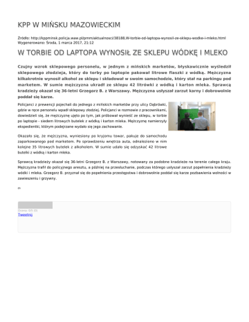 KPP W MIŃSKU MAZOWIECKIM Źródło: http://kppminsk.policja.waw.pl/pmm/aktualnosci/38188,W-torbie-od-laptopa-wynosil-ze-sklepu-wodke-i-mleko.html Wygenerowano: Środa, 1 marca 2017, 21:12 W TORBIE OD LAPTOPA WYNOSIŁ ZE SKLEPU WÓDKĘ I MLEKO Czujny wzrok sklepowego personelu, w jednym z mińskich marketów, błyskawicznie wyśledził sklepowego złodzieja, który do torby po laptopie pakował litrowe flaszki z wódką. Mężczyzna kilkakrotnie wynosił alkohol ze sklepu i składował w swoim samochodzie, który stał na parkingu pod marketem. W sumie mężczyzna ukradł ze sklepu 42 litrówki z wódką i karton mleka. Sprawcą kradzieży okazał się 36-letni Grzegorz B. z Warszawy. Mężczyzna usłyszał zarzut karny i dobrowolnie poddał się karze. Policjanci z prewencji pojechali do jednego z mińskich marketów przy ulicy Dąbrówki, gdzie w ręce personelu wpadł sklepowy złodziej. Policjanci w rozmowie z pracownikami, dowiedzieli się, że mężczyznę ujęto po tym, jak próbował wynieść ze sklepu, w torbie po laptopie - siedem litrowych butelek z wódką i karton mleka. Mężczyznę namierzyły ekspedientki, którym podejrzane wydało się jego zachowanie. Okazało się, że mężczyzna, wyniesiony po kryjomu towar, pakuje do samochodu zaparkowanego pod marketem. Po sprawdzeniu wnętrza auta, odnaleziono w nim kolejne 35 litrowych butelek z alkoholem. W sumie udało się odzyskać 42 litrowe butelki z wódką i karton mleka. Sprawcą kradzieży okazał się 36-letni Grzegorz B. z Warszawy, notowany za podobne kradzieże na terenie całego kraju. Mężczyzna trafił do policyjnego aresztu, a później na przesłuchanie, podczas którego usłyszał zarzut popełnienia kradzieży wódki i mleka. Grzegorz B. przyznał się do popełnienia przestępstwa i dobrowolnie poddał się karze pozbawienia wolności w zawieszeniu i grzywny. dn Ocena: 0/5 (0) Tweetnij