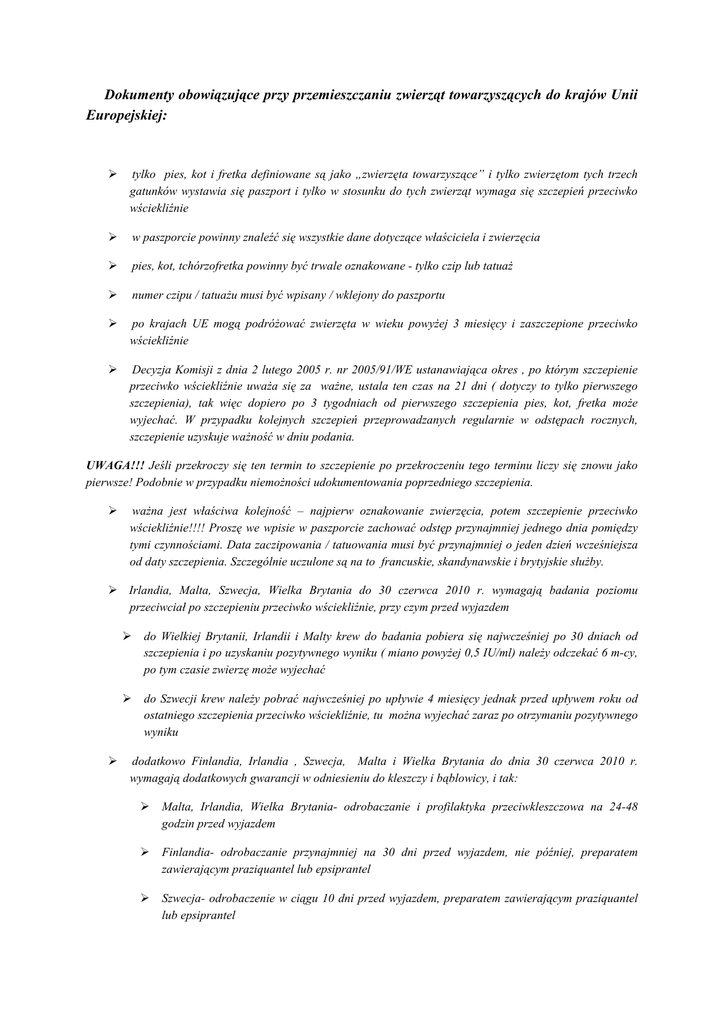 Dokumenty obowiązujące przy przemieszczaniu zwierząt towarzyszących do krajów Unii Europejskiej: tylko pies, kot i fretka definiowane są jako „zwierzęta towarzyszące” i tylko zwierzętom tych trzech gatunków wystawia się paszport i tylko w stosunku do tych zwierząt wymaga się szczepień przeciwko wściekliźnie w paszporcie powinny znaleźć się wszystkie dane dotyczące właściciela i zwierzęcia pies, kot, tchórzofretka powinny być trwale oznakowane - tylko czip lub tatuaŜ numer czipu / tatuaŜu musi być wpisany / wklejony do paszportu po krajach UE mogą podróŜować zwierzęta w wieku powyŜej 3 miesięcy i zaszczepione przeciwko wściekliźnie Decyzja Komisji z dnia 2 lutego 2005 r. nr 2005/91/WE ustanawiająca okres , po którym szczepienie przeciwko wściekliźnie uwaŜa się za waŜne, ustala ten czas na 21 dni ( dotyczy to tylko pierwszego szczepienia), tak więc dopiero po 3 tygodniach od pierwszego szczepienia pies, kot, fretka moŜe wyjechać. W przypadku kolejnych szczepień przeprowadzanych regularnie w odstępach rocznych, szczepienie uzyskuje waŜność w dniu podania. UWAGA!!! Jeśli przekroczy się ten termin to szczepienie po przekroczeniu tego terminu liczy się znowu jako pierwsze! Podobnie w przypadku niemoŜności udokumentowania poprzedniego szczepienia. waŜna jest właściwa kolejność – najpierw oznakowanie zwierzęcia, potem szczepienie przeciwko wściekliźnie!!!! Proszę we wpisie w paszporcie zachować odstęp przynajmniej jednego dnia pomiędzy tymi czynnościami. Data zaczipowania / tatuowania musi być przynajmniej o jeden dzień wcześniejsza od daty szczepienia. Szczególnie uczulone są na to francuskie, skandynawskie i brytyjskie słuŜby. Irlandia, Malta, Szwecja, Wielka Brytania do 30 czerwca 2010 r. wymagają badania poziomu przeciwciał po szczepieniu przeciwko wściekliźnie, przy czym przed wyjazdem do Wielkiej Brytanii, Irlandii i Malty krew do badania pobiera się najwcześniej po 30 dniach od szczepienia i po uzyskaniu pozytywnego wyniku ( miano powyŜej 0,5 IU/ml) naleŜy odczekać 6 m-cy, po tym czasie zwierzę moŜe wyjechać do Szwecji krew naleŜy pobrać najwcześniej po upływie 4 miesięcy jednak przed upływem roku od ostatniego szczepienia przeciwko wściekliźnie, tu moŜna wyjechać zaraz po otrzymaniu pozytywnego wyniku dodatkowo Finlandia, Irlandia , Szwecja, Malta i Wielka Brytania do dnia 30 czerwca 2010 r. wymagają dodatkowych gwarancji w odniesieniu do kleszczy i bąblowicy, i tak: Malta, Irlandia, Wielka Brytania- odrobaczanie i profilaktyka przeciwkleszczowa na 24-48 godzin przed wyjazdem Finlandia- odrobaczanie przynajmniej na 30 dni przed wyjazdem, nie później, preparatem zawierającym praziquantel lub epsiprantel Szwecja- odrobaczenie w ciągu 10 dni przed wyjazdem, preparatem zawierającym praziquantel lub epsiprantel UWAGA!!! Odrobaczanie i profilaktyka przeciwkleszczowa kaŜdorazowo muszą być wpisane do paszportu i poświadczone pieczątką i podpisem lekarza weterynarii. kaŜdorazowo na 24 godziny przed wyjazdem naleŜy przeprowadzić badanie kliniczne zwierzęcia i poświadczyć to wpisem w sekcji IX paszportu Wiele pytań rodzi sprawa legalizacji paszportu ( sekcja X). Legalizacji dokonuje powiatowy lekarz weterynarii. Dyrektywa nie precyzuje jednak kiedy naleŜy jej dokonywać. Ogólna zasada mówi, Ŝe legalizacja jest potrzebna w przypadku wyjazdu poza kraje Unii a w przypadku krajów unijnych konieczna jest tylko, jeśli dany kraj tego wymaga. Jako, Ŝe nie ma informacji, które kraje mają takie wymagania, nie jest błędem dokonanie legalizacji przed wyjazdem do któregokolwiek kraju. Natomiast nie jest niczym uzasadnione dokonywanie legalizacji paszportu przed kaŜdym wyjazdem. Ponowną legalizację moŜna rozwaŜyć w przypadku zmiany właściciela i pojawienia się wielu nowych wpisów od pierwszej legalizacji. Dokumenty dla psów i kotów wyjeŜdŜających poza kraje Unii Europejskiej: podstawowym dokumentem jest w tym przypadku świadectwo zdrowia, które wypełnia się na podstawie danych z paszportu z wpisanym ostatnim szczepieniem przeciwko wściekliźnie , bądź aktualnego zaświadczenia o szczepieniu i badania klinicznego świadectwo zdrowia wystawia powiatowy lekarz weterynarii wyjeŜdŜać mogą zwierzęta zaszczepione przeciwko wściekliźnie Stany Zjednoczone dopuszczają przywóz zwierząt poniŜej 3 miesiąca Ŝycia nieszczepionych przeciwko wściekliźnie, naleŜy wtedy na świadectwie zdrowia umieścić wpis w języku angielskim, Ŝe zwierzę jest za młode na szczepienie Białoruś coraz częściej zwraca uwagę na zachowanie terminu 21 dni uzyskania waŜności pierwszego szczepienia przeciwko wściekliźnie przy wwozie psa, kota na teren ich kraju Dokumenty towarzyszące zwierzętom przywoŜonym do Polski Polska nie zezwala na przywóz psów, kotów, fretek w wieku poniŜej 3 miesiąca Ŝycia z krajów unii - paszport, trwałe i czytelne oznakowanie, aktualne szczepienie przeciwko wściekliźnie z krajów trzecich- trwałe i czytelne oznakowanie, świadectwo zdrowia, którego wzór jest zawarty w Decyzji Komisji z dnia 1 grudnia 2004 r. Nr 2004/824/WE ustanawiającej wzorcowe świadectwo zdrowia dla przemieszczania o charakterze niehandlowym psów, kotów i fretek z państw trzecich do Wspólnoty, szczepienie przeciwko wściekliźnie Republika San Marino, Szwajcaria, Norwegia, Lichtenstein- posługują się paszportami zamiast świadectwa zdrowia zwierzęta przywoŜone m.in. z Białorusi i Rosji nie podlegają badaniu miareczkowania przeciwciał przeciwko wściekliźnie wszystkie kraje, z których nie obowiązuje miareczkowanie wymienione są w części C załącznika II do Rozporządzenia Parlamentu Europejskiego i Rady Nr 998/2003- Uwaga!!! w załączniku tym nie ma Ukrainy. psy, koty, fretki wjeŜdŜające z Ukrainy - podlegają badaniu miareczkowania przeciwciał przeciwko wściekliźnie, które naleŜy wykonać na próbce krwi pobranej co najmniej 30 