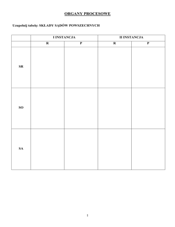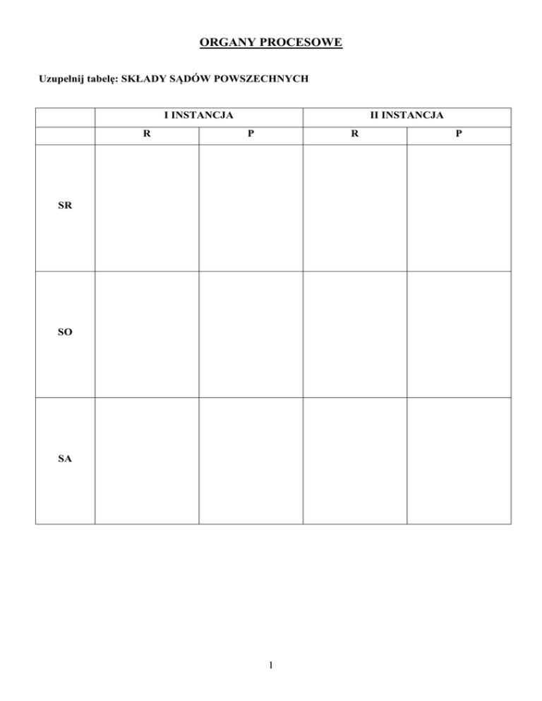 ORGANY PROCESOWE Uzupełnij tabelę: SKŁADY SĄDÓW POWSZECHNYCH I INSTANCJA R II INSTANCJA P R SR SO SA 1 P Uzupełnij tabelę: WŁAŚCIWOŚĆ SĄDÓW POWSZECHNYCH Rodzaj właściwości Definicja Sąd, którego dotyczy rodzaj właściwości Podstawa prawna Uzupełnij tabelę: WYŁĄCZENIE UCZESTNIKÓW PROCESU KARNEGO Poszczególni uczestnicy Podstawa prawna Przesłanki wyłączenia Tryb wyłączenia Organ wyłączający Skutki wyłączenia Skutki niewyłączenia 2 KAZUSY 1. Statek morski M/S Batory, którego portem macierzystym jest Gdynia, płynąc w rejs do Brazylii zawinął do portu w Kołobrzegu. W czasie oczekiwania na redzie na wejście do portu wieczorem odbyła się uroczystość z okazji imienin pierwszego oficera. W ich trakcie doszło do sprzeczki między kapitanem a drugim oficerem, która przekształciła się w szamotaninę między nimi, w trakcie której kapitan popchnął drugiego oficera tak silnie, iż ten wypadł za burtę i utonął. Jaki sąd będzie właściwy miejscowo do rozpoznania sprawy, gdyby prokurator w związku z opisanym zdarzeniem sporządził akt oskarżenia? 2. Sąd Rejonowy w S. zwrócił się do Sądu Apelacyjnego w G. z wnioskiem o przekazanie Sądowi Okręgowemu w G. sprawy przeciwko Jerzemu U. i 5 innym osobom oskarżonym o przestępstwo z art. 296 § 1 k.k. z uwagi na jej skomplikowany charakter prawny i faktyczny. W uzasadnieniu Sąd Rejonowy wskazał, iż akta sprawy liczą 50 tomów, akt oskarżenia zawiera wnioski dowodowe o przesłuchanie na rozprawie ponad 70 świadków, zaś oskarżony jest znanym w tej miejscowości przedsiębiorcą. Poza tym duże zainteresowanie sprawą wykazują lokalne środki masowego przekazu. Sąd Apelacyjny postanowił przekazać sprawę zgodnie z wnioskiem. Na tę decyzję zażalenie złożył obrońca oskarżonego. Czy decyzja sądu apelacyjnego w świetle informacji podanych w kazusie była prawidłowa? Czy postanowienie wydane na podstawie art. 25 § 2 k.p.k. jest zaskarżalne? Umotywuj swoje stanowisko. 3. Sąd Rejonowy w G., na podstawie art. 37 k.p.k., wystąpił z inicjatywą do Sądu Najwyższego o przekazanie sprawy do rozpoznania innemu sądowi równorzędnemu z uwagi na dobro wymiaru sprawiedliwości, uzasadniając to tym, iż aktem oskarżenia objęty został Jerzy W. wykonujący zawód adwokata w okręgu Sądu Rejonowego w G., zaś pomimo skierowania przeciwko niemu aktu oskarżenia w dalszym ciągu wykonuje on obowiązki zawodowe w charakterze obrońcy w wielu sprawach karnych rozpoznawanych w Sądzie Rejonowym w G.. a) Jaką formę powinna przybrać inicjatywa Sądu Rejonowego? b) Czy w świetle art. 37 k.p.k. istnieje podstawa do przekazania sprawy innemu sądowi równorzędnemu ? 4. Do Sądu Okręgowego w G. został skierowany akt oskarżenia przeciwko Janowi L. zarzucający mu, iż w dniu 2 lipca 2008 r. w S. popchnął przechodzącą ulicą Joannę T., uderzył ją w brzuch, a 3 następnie wyszarpnął jej z rąk torebkę, w której znajdowało się ok. 350 zł. Prokurator zakwalifikował powyższy czyn jako przestępstwo z art. 280 § 2 k.k. Sędzia, jeszcze przed wyznaczeniem rozprawy, przeglądając akta sprawy w ramach przygotowania do prowadzenia sprawy powziął wątpliwość co do prawidłowości kwalifikacji czynu zarzucanego Janowi L. w akcie oskarżenia. Oceń tę sytuację i określ, jakie czynności powinien podjąć Sąd w tej sprawie. 5. Podczas rozprawy toczącej się przed Sądem Okręgowym w K. dotyczącej przestępstwa z art. 148 § 1 k.k., skład orzekający doszedł do przekonania, iż sprawca działał nieumyślnie, wobec czego czyn oskarżonego wyczerpuje znamiona przestępstwa z art. 155 k.k. W związku z tym sąd postanowił odroczyć rozprawę i stwierdzić swoją niewłaściwość oraz przekazać sprawę do rozpoznania przez Sąd Rejonowy w K., jako właściwy rzeczowo. Powyższe postanowienie zaskarżył oskarżyciel publiczny, twierdząc, iż przekazanie na obecnym etapie sprawy jest niecelowe z uwagi na zaawansowanie postępowania dowodowego, zaś przed Sądem Rejonowym rozprawa będzie musiała się toczyć na nowo. Czy przedmiotowe postanowienie jest zaskarżalne? Jeśli tak, to jak należy je rozstrzygnąć? 6. Wyrokiem Sądu Rejonowego w G. Jerzy H. został skazany za przestępstwo z art. 280 § 1 k.k. Powyższy wyrok zaskarżył obrońca. Sąd Okręgowy w G. (Wydział V Karny Odwoławczy) rozpoznając apelację doszedł do wniosku, że czyn oskarżonego nie jest przestępstwem z art. 280 § 1 k.k., lecz zbrodnią z art. 280 § 2 k.k., a zatem Sąd Rejonowy w G. był niewłaściwy do rozpoznania tej sprawy. W związku z tym uchylił wyrok i przekazał sprawę do rozpoznania według właściwości Wydziałowi IV Karnemu tego samego Sądu Okręgowego w G. Skład orzekający wyznaczony do rozpoznania sprawy w tym Wydziale po zapoznaniu się z nią uznał jednak, że czyn oskarżonego wyczerpuje znamiona przestępstwa z art. 280 § 1 k.k., wobec czego stwierdził swoją niewłaściwość, zgodnie z art. 35 § 2 k.p.k., i przekazał sprawę do rozpoznania Sądowi Rejonowemu w G. uzasadniając to treścią art. 35 § 1 k.p.k., zgodnie z którym każdy Sąd musi badać swoją właściwość z urzędu i na każdym etapie sprawy. Proszę ocenić powyższą sytuację. 7. Do sądu został skierowany akt oskarżenia przeciwko Zenonowi F. o przestępstwo z art. 148 § 1 k.k., Grzegorzowi S. o przestępstwo z art. 148 § 1 k.k. i Felicji Z. o przestępstwo z art. 240 § 1 k.k., które to czyny pozostawały ze sobą w ścisłym związku uzasadniającym ich łączne rozpoznanie. W chwili popełnienia przestępstwa Grzegorz S. miał 17 lat. Proszę podać, jaki sąd jest właściwy do rozpoznania tej sprawy oraz w jakim składzie powinien to uczynić. 4 8. Czy w powyższych sytuacjach miała miejsce nienależyta obsada sądu w rozumieniu art. 439 § 1 pkt 2 k.p.k.? a) Sprawę o czyn z art. 159 k.k. rozpoznał Sąd Rejonowy w S. w składzie jednego sędziego i dwóch ławników