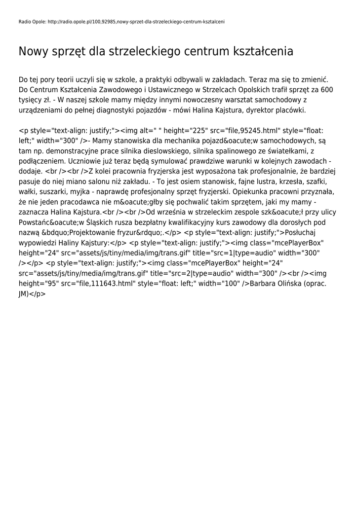 Radio Opole: http://radio.opole.pl/100,92985,nowy-sprzet-dla-strzeleckiego-centrum-ksztalceni Nowy sprzęt dla strzeleckiego centrum kształcenia Do tej pory teorii uczyli się w szkole, a praktyki odbywali w zakładach. Teraz ma się to zmienić. Do Centrum Kształcenia Zawodowego i Ustawicznego w Strzelcach Opolskich trafił sprzęt za 600 tysięcy zł. - W naszej szkole mamy między innymi nowoczesny warsztat samochodowy z urządzeniami do pełnej diagnostyki pojazdów - mówi Halina Kajstura, dyrektor placówki. <p style="text-align: justify;"><img alt=" " height="225" src="file,95245.html" style="float: left;" width="300" />- Mamy stanowiska dla mechanika pojazdów samochodowych, są tam np. demonstracyjne prace silnika dieslowskiego, silnika spalinowego ze światełkami, z podłączeniem. Uczniowie już teraz będą symulować prawdziwe warunki w kolejnych zawodach dodaje. <br /><br />Z kolei pracownia fryzjerska jest wyposażona tak profesjonalnie, że bardziej pasuje do niej miano salonu niż zakładu. - To jest osiem stanowisk, fajne lustra, krzesła, szafki, wałki, suszarki, myjka - naprawdę profesjonalny sprzęt fryzjerski. Opiekunka pracowni przyznała, że nie jeden pracodawca nie mógłby się pochwalić takim sprzętem, jaki my mamy zaznacza Halina Kajstura.<br /><br />Od września w strzeleckim zespole szkół przy ulicy Powstańców Śląskich rusza bezpłatny kwalifikacyjny kurs zawodowy dla dorosłych pod nazwą „Projektowanie fryzur”.</p> <p style="text-align: justify;">Posłuchaj wypowiedzi Haliny Kajstury:</p> <p style="text-align: justify;"><img class="mcePlayerBox" height="24" src="assets/js/tiny/media/img/trans.gif" title="src=1|type=audio" width="300" /></p> <p style="text-align: justify;"><img class="mcePlayerBox" height="24" src="assets/js/tiny/media/img/trans.gif" title="src=2|type=audio" width="300" /><br /><img height="95" src="file,111643.html" style="float: left;" width="100" />Barbara Olińska (oprac. JM)</p>
